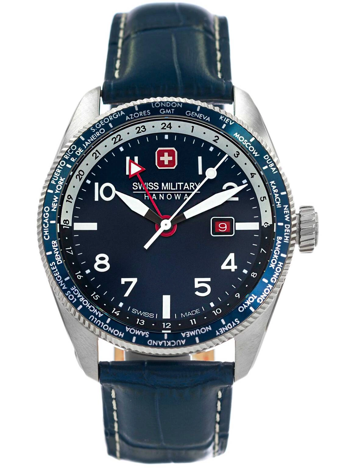 - Wodoszczelny Zegarek Męski Swiss Military Hanowa SMWGB0000505 granatowy na pasku. Posiada funkcje datownika, neobrite i GMT.