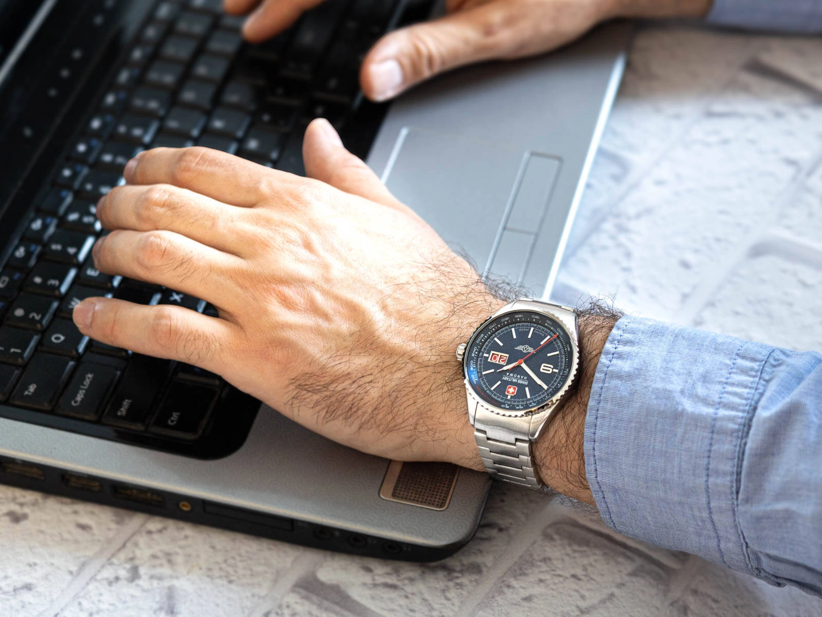 Męski zegarek Swiss Military Hanowa SMWGH2101005 Afterburn to przykład szwajcarskiej precyzji i przemyślanego designu, który zadowoli nawet najbardziej wymagających użytkowników. Srebrna koperta, wykonana z wysokiej jakości stali szlachetnej, nie tylko prezentuje się stylowo, ale także gwarantuje trwałość i odporność na uszkodzenia. W jej wnętrzu kryje się precyzyjny mechanizm kwarcowy zasilany baterią, który zapewnia niezawodność i dokładność działania. Całość została umieszona na solidnej bransolecie w kolorze srebrnym, wykonanej ze stali szlachetnej. Cyferblat w kolorze granatowym stanowi doskonałe tło dla dobrze kontrastujących biało-srebrnych indeksów liniowych, a czerwone logo z szwajcarskim krzyżem umieszczone na godzinie dwunastej dodaje całości charakteru. Indeksy i wskazówki zostały wyposażone w fosforyzujące elementy neobrite, które po naświetleniu świecą przez jakiś czas, umożliwiając łatwe odczytanie godziny w ciemności lub przy słabym oświetleniu. Tuż przy indeksie oznaczającym godzinę trzecia znajduje się datownik wskazujący aktualny dzień miesiąca. Tarczę zabezpiecza odporne na zarysowania szkło szafirowe. Dzięki temu tarcza zegarka pozostaje nienaruszona nawet przy intensywnym użytkowaniu. Klasa wodoszczelności 10ATM pozwala na pływanie z zegarkiem na ręce. Swiss Military Hanowa SMWGH2101005 Afterburn jest zapakowany w eleganckie, oryginalne opakowanie producenta, które doskonale sprawdzi się jako opakowanie na prezent.