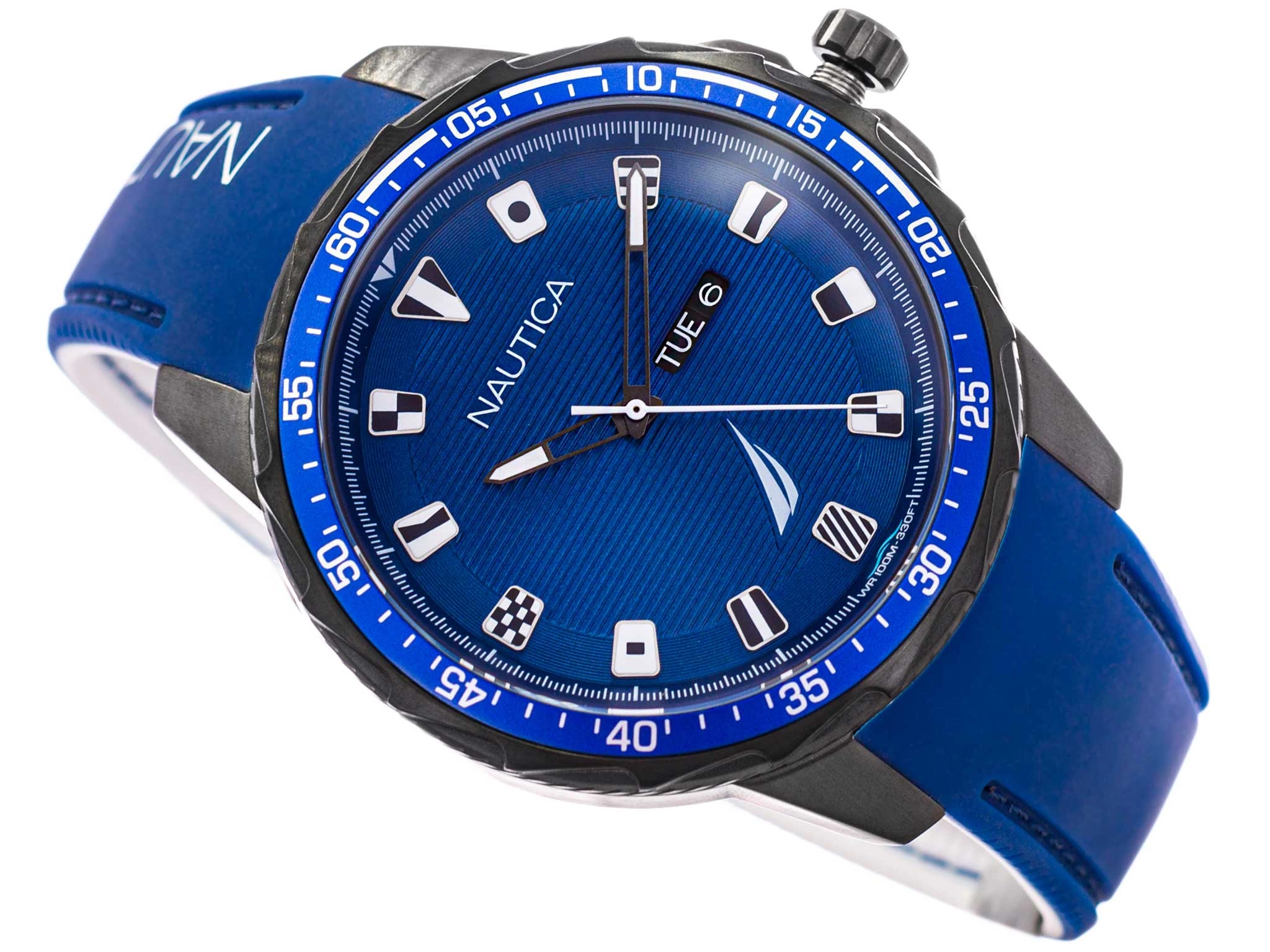 - Wodoszczelny Zegarek Męski Nautica NAPCLF003 niebieski na pasku, posiada funkcję datownika i neobrite.