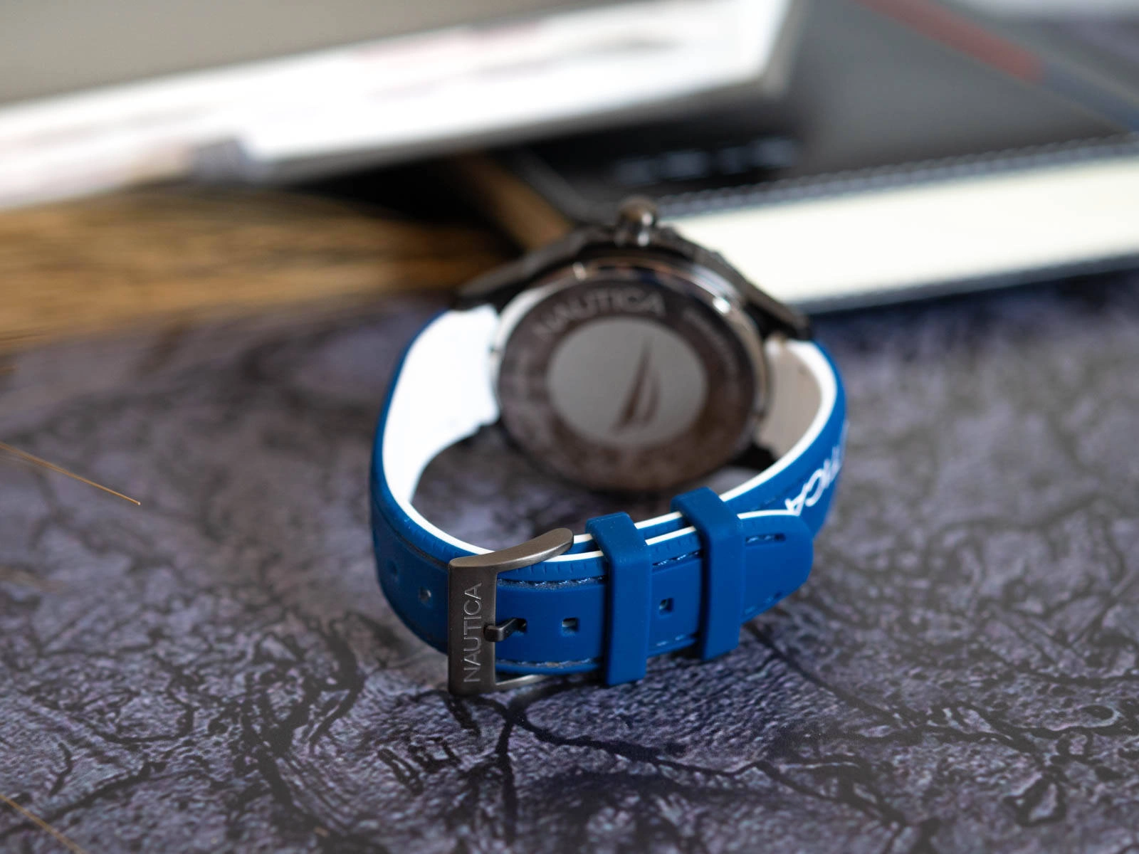 Model Nautica Coba Lake NAPCLF003, inspirowany żeglarską estetyką, to doskonały dodatek do sportowych i casualowych outfitów. Zasilany baterią mechanizm kwarcowy zapewnia niezawodność działania. Koperta w kolorze grafitowym została wykonana z trwałej stali szlachetnej i zawieszona na niebieskim silikonowym pasku, który doskonale przylega do ręki. Wodoszczelność na poziomie 100M umożliwia bezpieczne pływanie. Niebieska tarcza ozdobiona jest czarno-białymi flagami międzynarodowych sygnałów morskich. Wskazówki pokryte fosforyzującą powłoką neobrite świecą w ciemności po uprzednim naświetleniu. Na godzinie trzeciej znajduje się datownik pokazujący dzień miesiąca oraz dzień tygodnia. Zegarek jest zapakowany w oryginalne pudełko, co sprawia, że doskonale nadaje się na prezent.