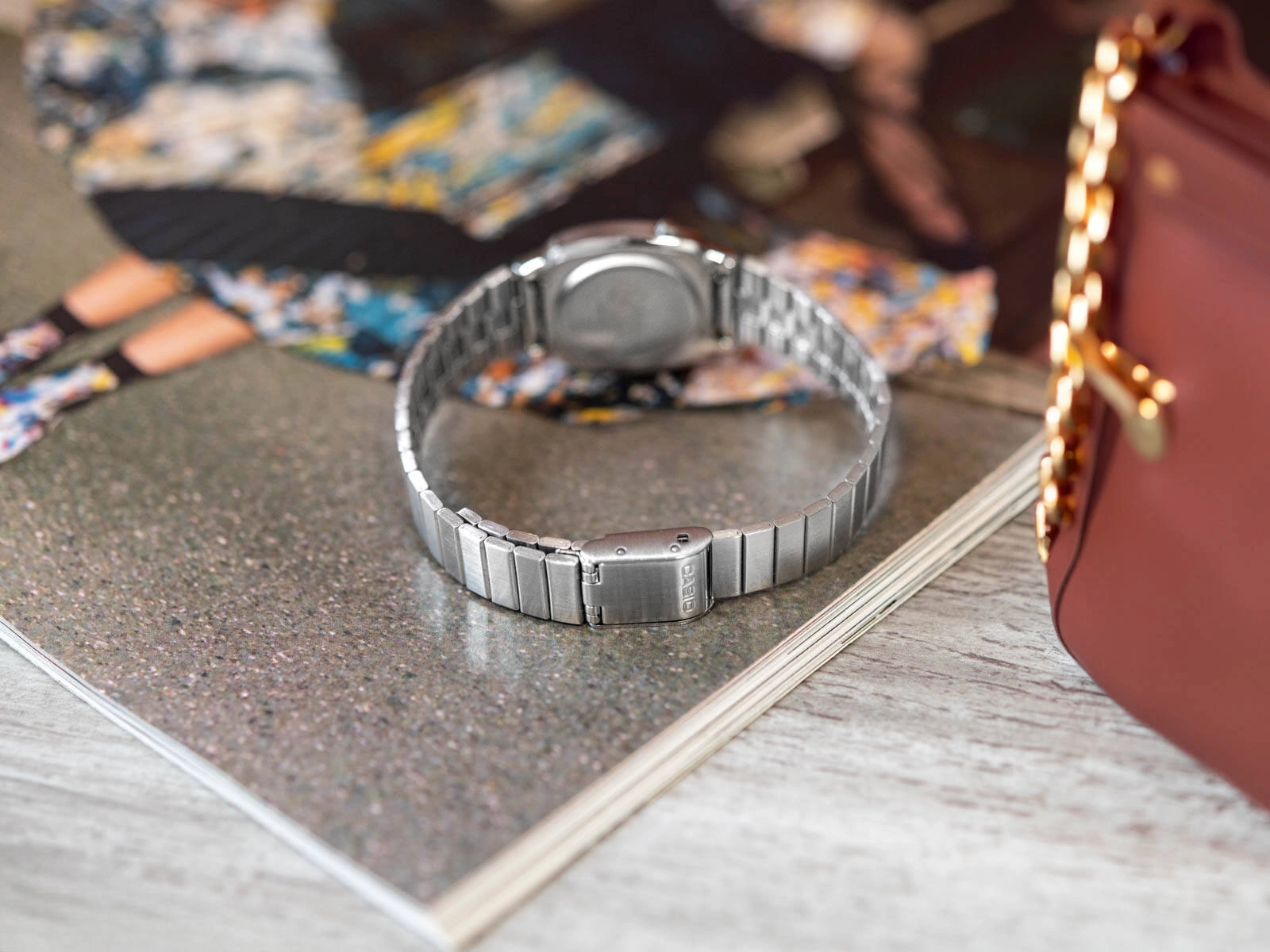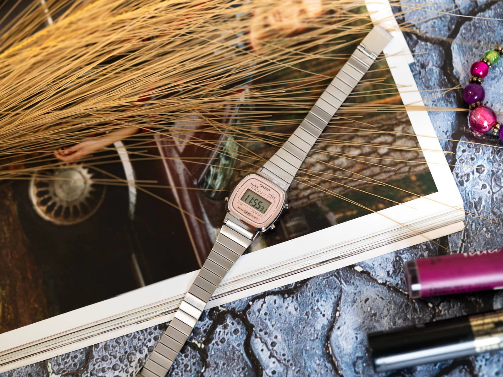 Damski model CASIO LA670WEA-4A2EF z serii VINTAGE, jest połączeniem nowoczesnej funkcjonalności i eleganckiego, minimalistycznego designu. Jego srebrna koperta i bransoleta są subtelne i eleganckie, a jednocześnie nawiązują do klasycznego stylu. Oprócz świetnego wyglądu, czasomierz oferuje szereg przydatnych funkcji. Do odliczania ustawionego czasu do zera służy timer. Stoper odmierza upływający czas z dokładnością do 1/10 sekundy. Bransoleta jest regulowana, łatwo można dopasować ją samodzielnie do kobiecego nadgarstka. Wystarczy podważyć zapięcie w miejscu, wskazanym strzałką i przesunąć w odpowiednie miejsce. LA670WEA-4A2EF pomaga Ci śledzić czas i pełnić codzienne obowiązki w stylu, dodając jednocześnie wyjątkowy akcent retro do Twojej garderoby.
