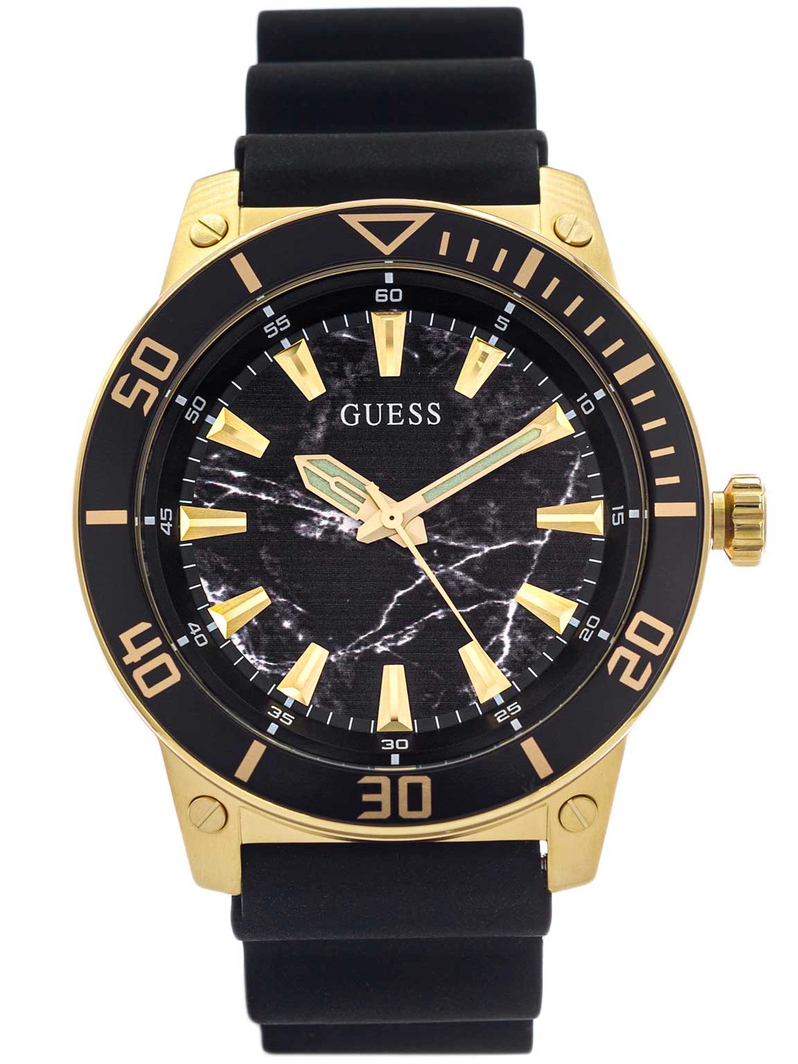 Guess Sport GW0420G2 to idealna propozycja dla mężczyzn szukających modnego zegarka. Jego sercem jest japoński mechanizm kwarcowy, zasilany wymienną baterią. Masywna błyszcząca koperta została wykonana ze stali szlachetnej i bez wątpienia przyciąga uwagę. Zawieszona została na gładkim, gumowym, wygodnym pasku. Imitująca ciemny marmur tarcza stanowi doskonałe tło dla dobrze kontrastujących złotych indeksów. Wskazówki zostały wyposażone w fosforyzujące elementy neobrite, które po naświetleniu będą świecić przez jakiś czas, ułatwiając odczytanie wskazań zegarka. Cyferblat zabezpiecza przejrzyste płaskie szkło mineralne. Guess Sport GW0420G2 został zapakowany w oryginale pudełko producenta, które sprawdzi się jako opakowanie na prezent.
