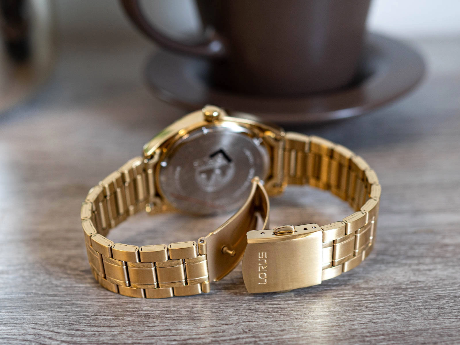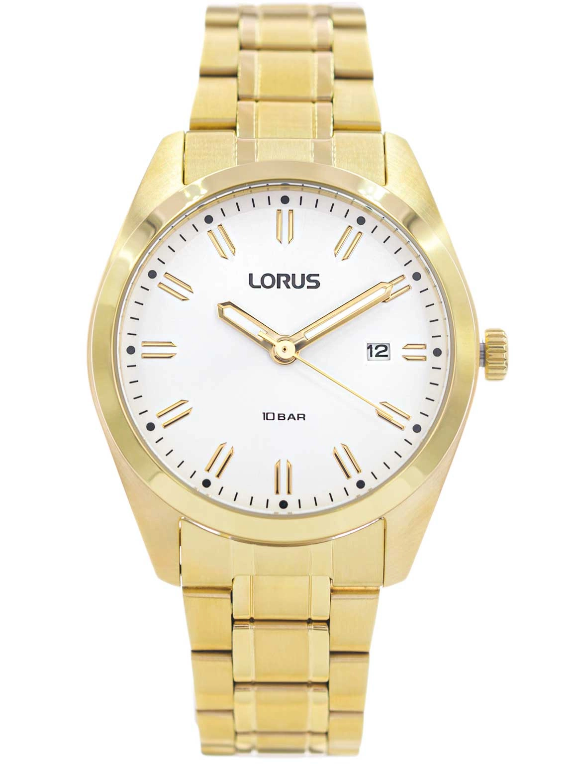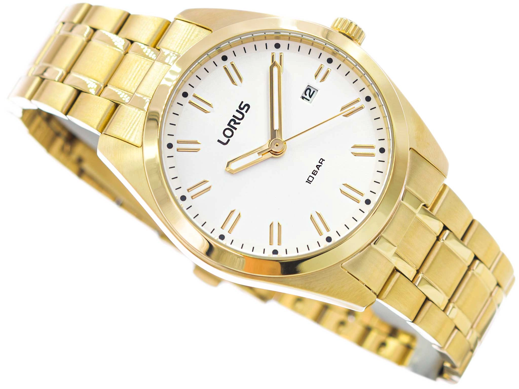 - Wodoszczelny Zegarek Męski Lorus RH982PX9 złoty na bransolecie, posiada funkcję datownika i neobrite.