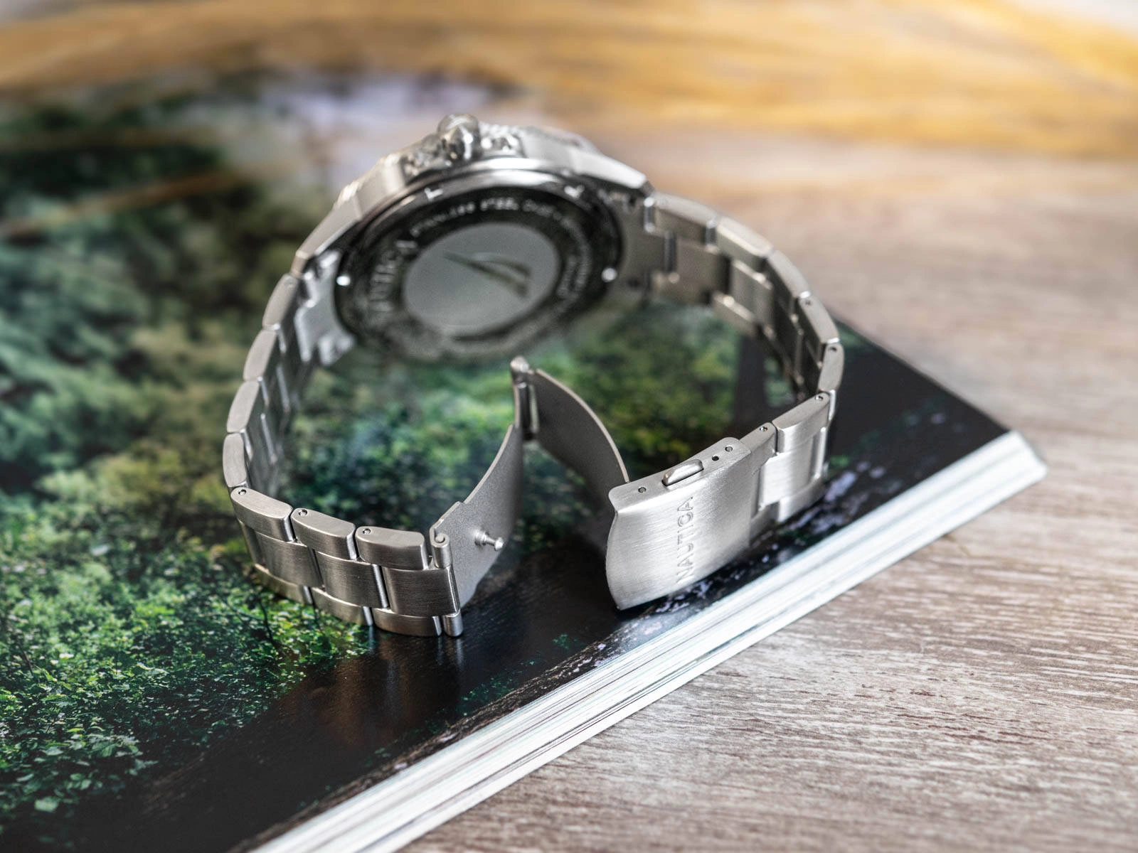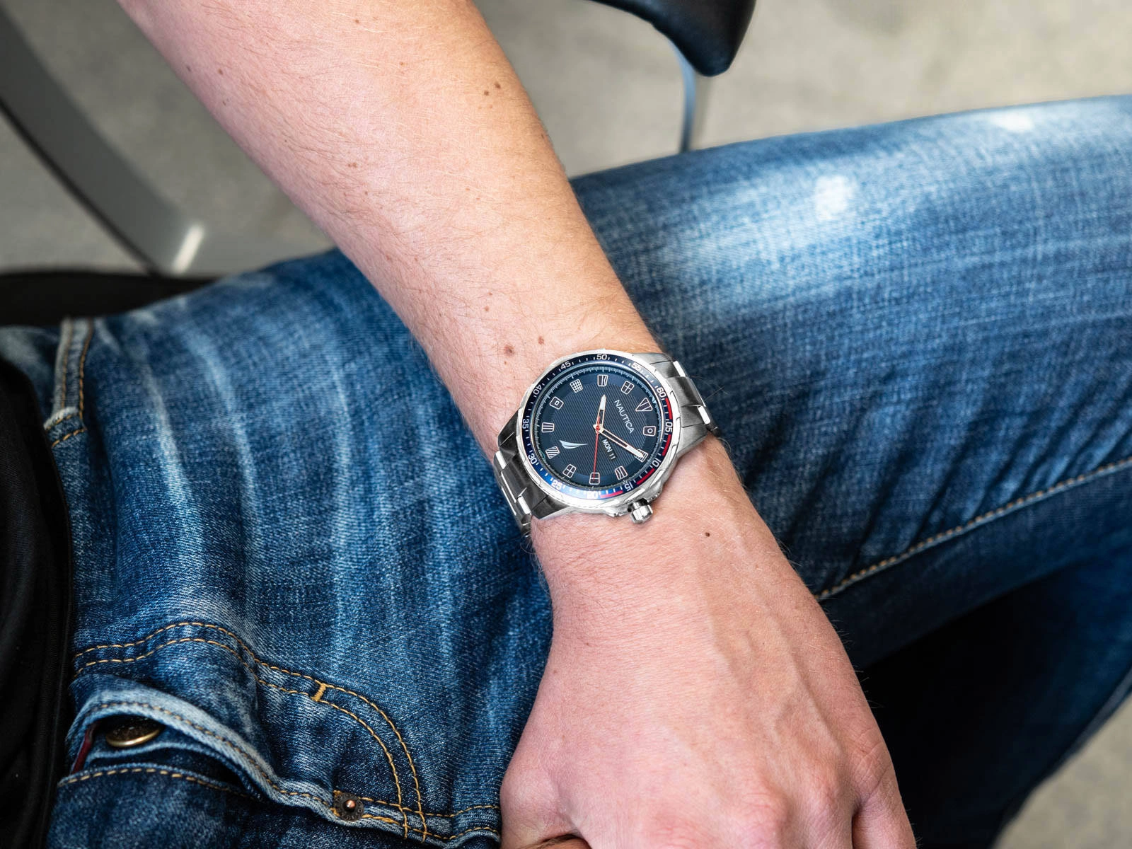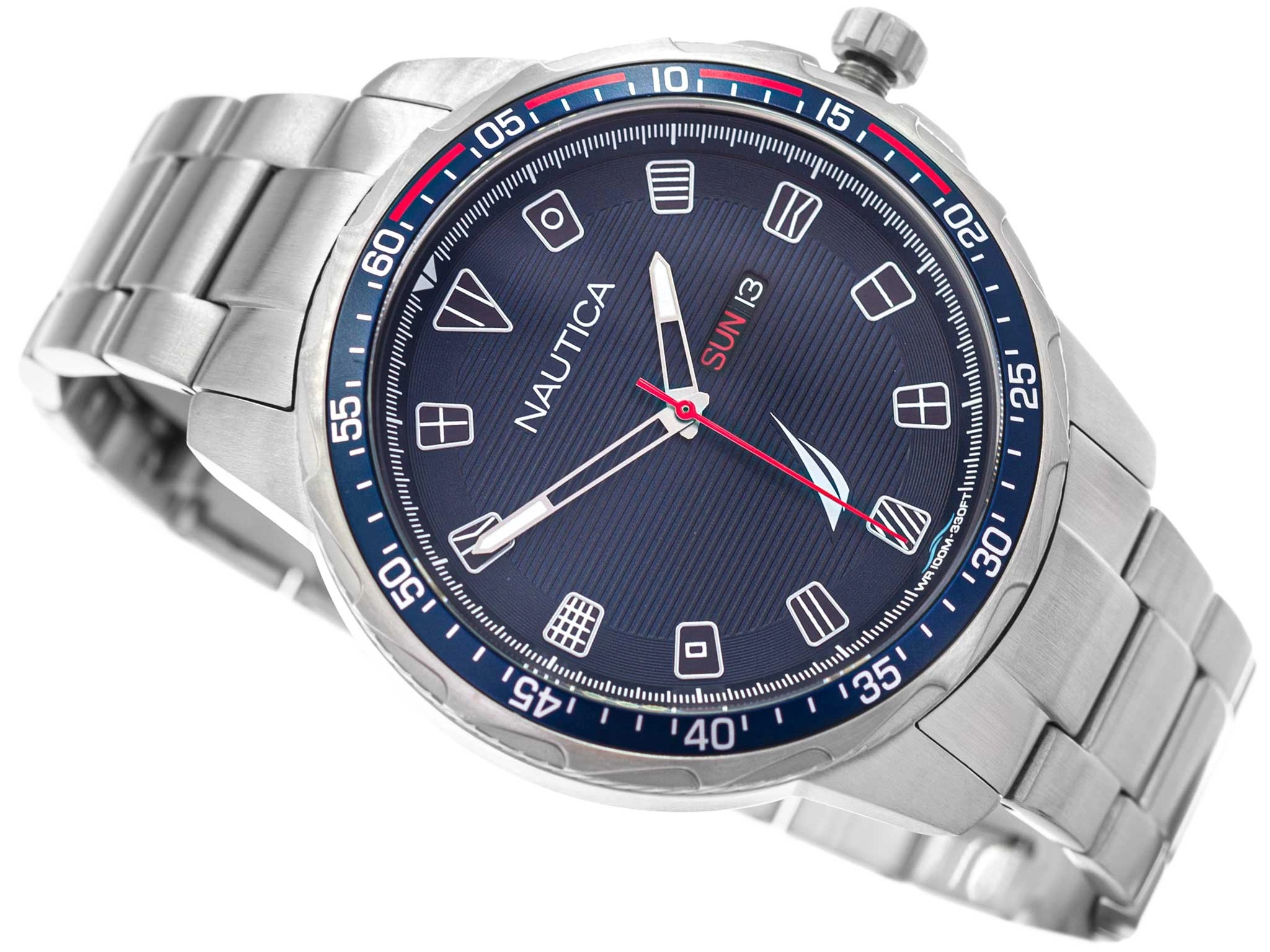 - Wodoszczelny Zegarek Męski Nautica NAPCLS120 srebrny na bransolecie, posiada funkcję datownika i neobrite.