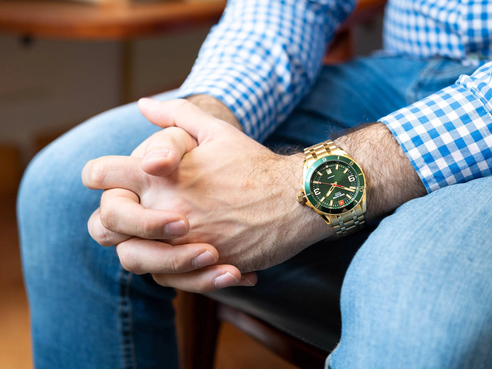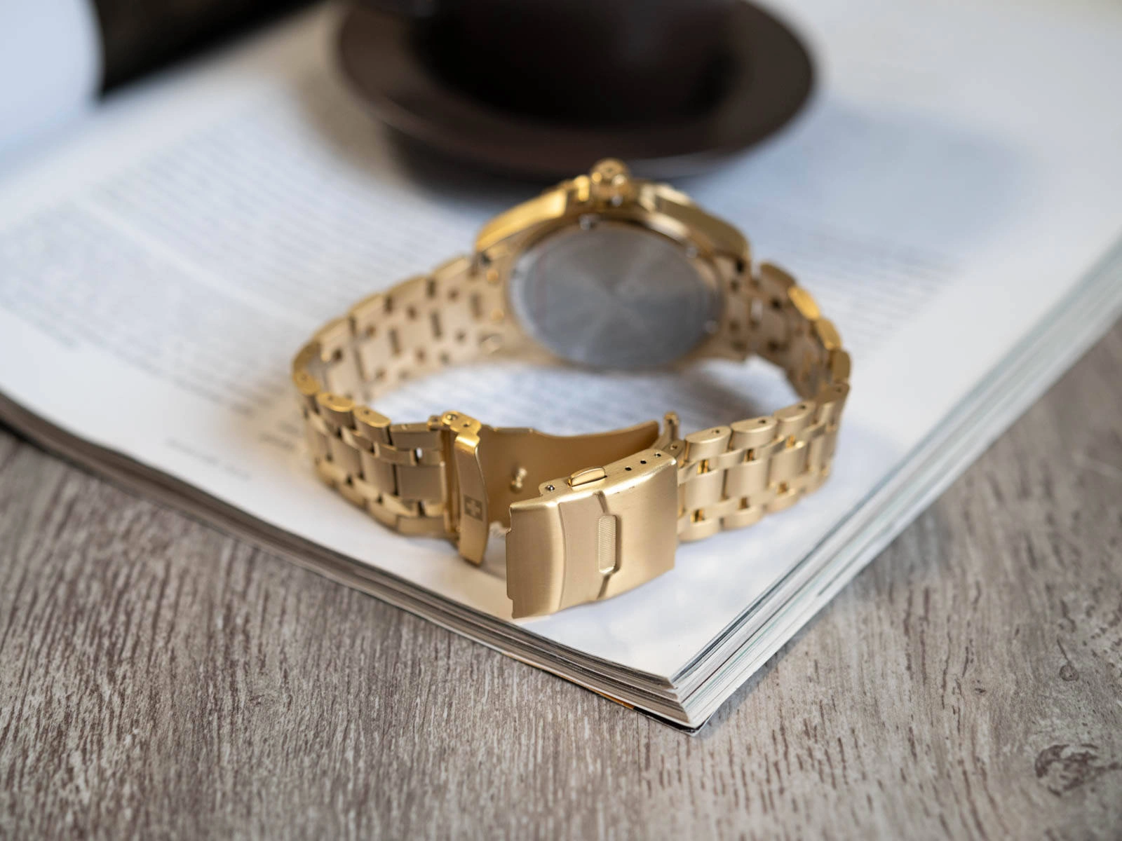 Swiss Alpine Military SAM7034.1114 Sierra to męski zegarek łączący szwajcarską precyzję i nowoczesny design. Zasilany baterią mechanizm kwarcowy został wyprodukowany w Szwajcarii. Kopertę w kolorze złota wykonano z wysokiej jakości stali szlachetnej i osadzono na solidnej bransolecie z tego samego materiału. Bransoleta, również w kolorze złotym posiada wygodne zapięcie motylkowe z dodatkowym zabezpieczeniem przed przypadkowym odpięciem. Tuż nad indeksem godziny szóstej można znaleźć datownik, który pokazuje aktualny dzień miesiąca. Wskazówki i indeksy pokryto powłoką neobrite, która po naświetleniu świeci przez jakiś czas, znacząco ułatwiając odczyt godziny w złych warunkach oświetleniowych. Klasa wodoszczelności 10ATM pozwala na pływanie z zegarkiem na ręce. Dzięki zastosowaniu wysokiej klasy komponentów produkt spełni oczekiwania każdego mężczyzny, który doceni funkcjonalny i stylowy dodatek. Do tego modelu dołączone jest oryginalne pudełko producenta, może posłużyć jako opakowanie na prezent.