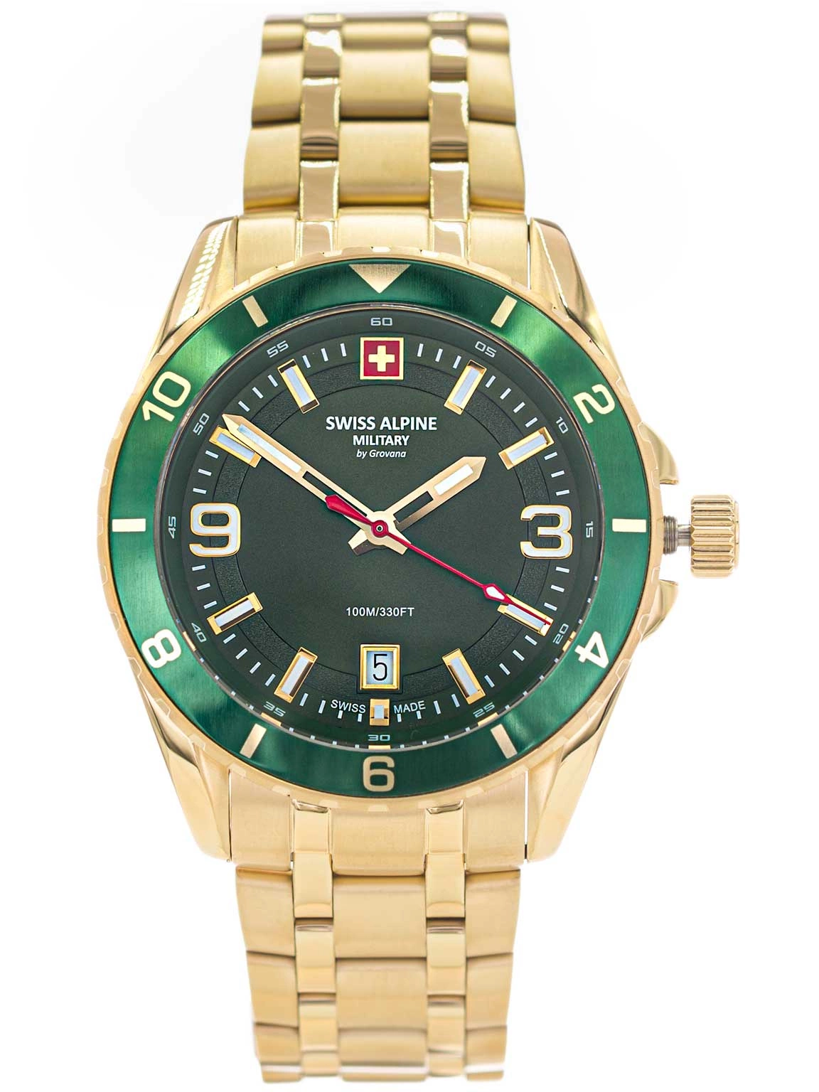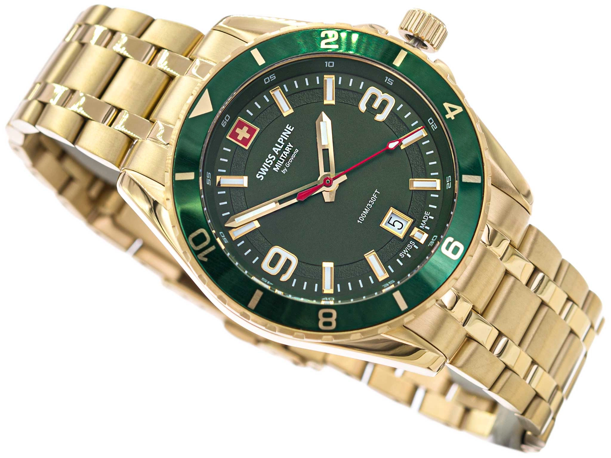 • Wodoszczelny Zegarek Męski Swiss Alpine Military SAM7034.1114 złoty na bransolecie, posiada funkcje datownika i neobrite.