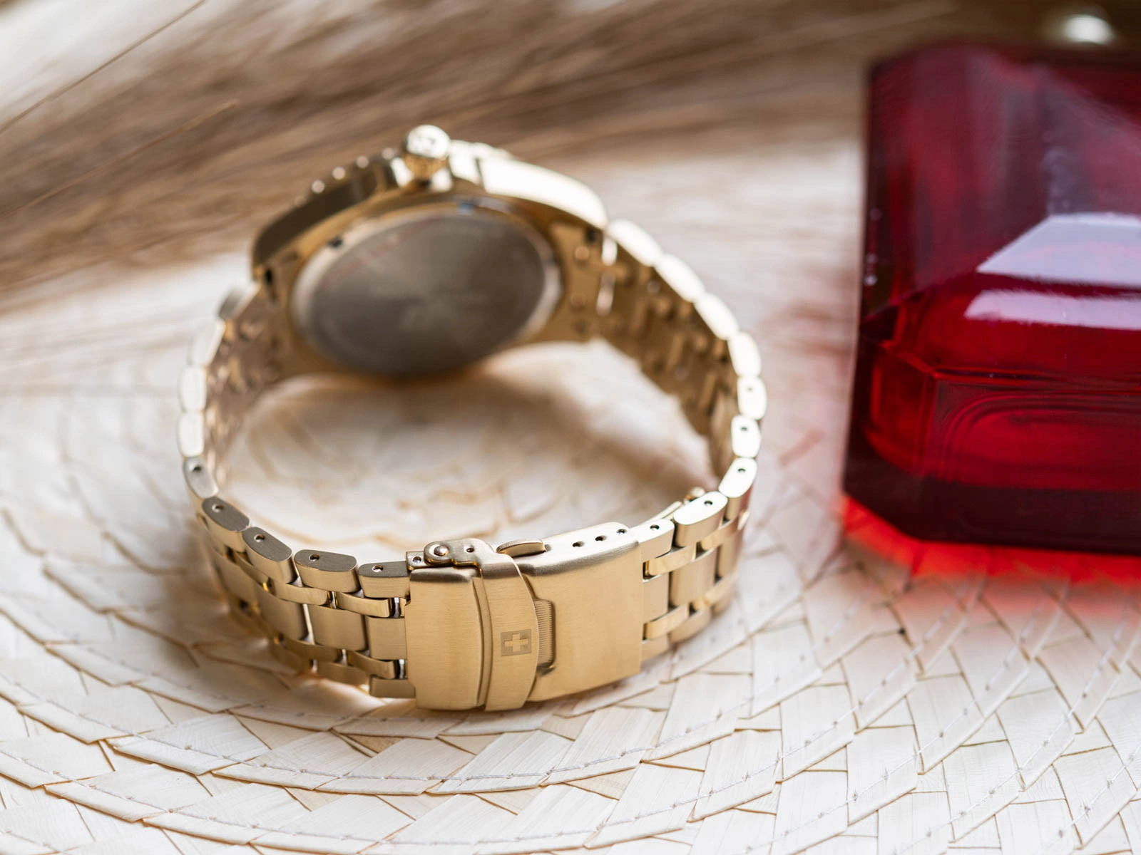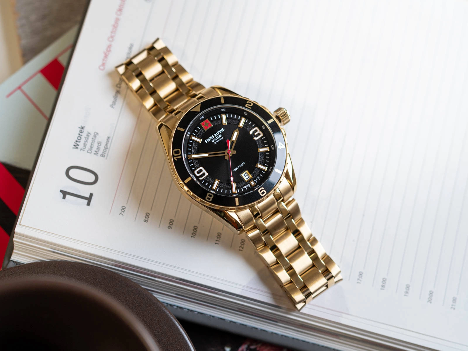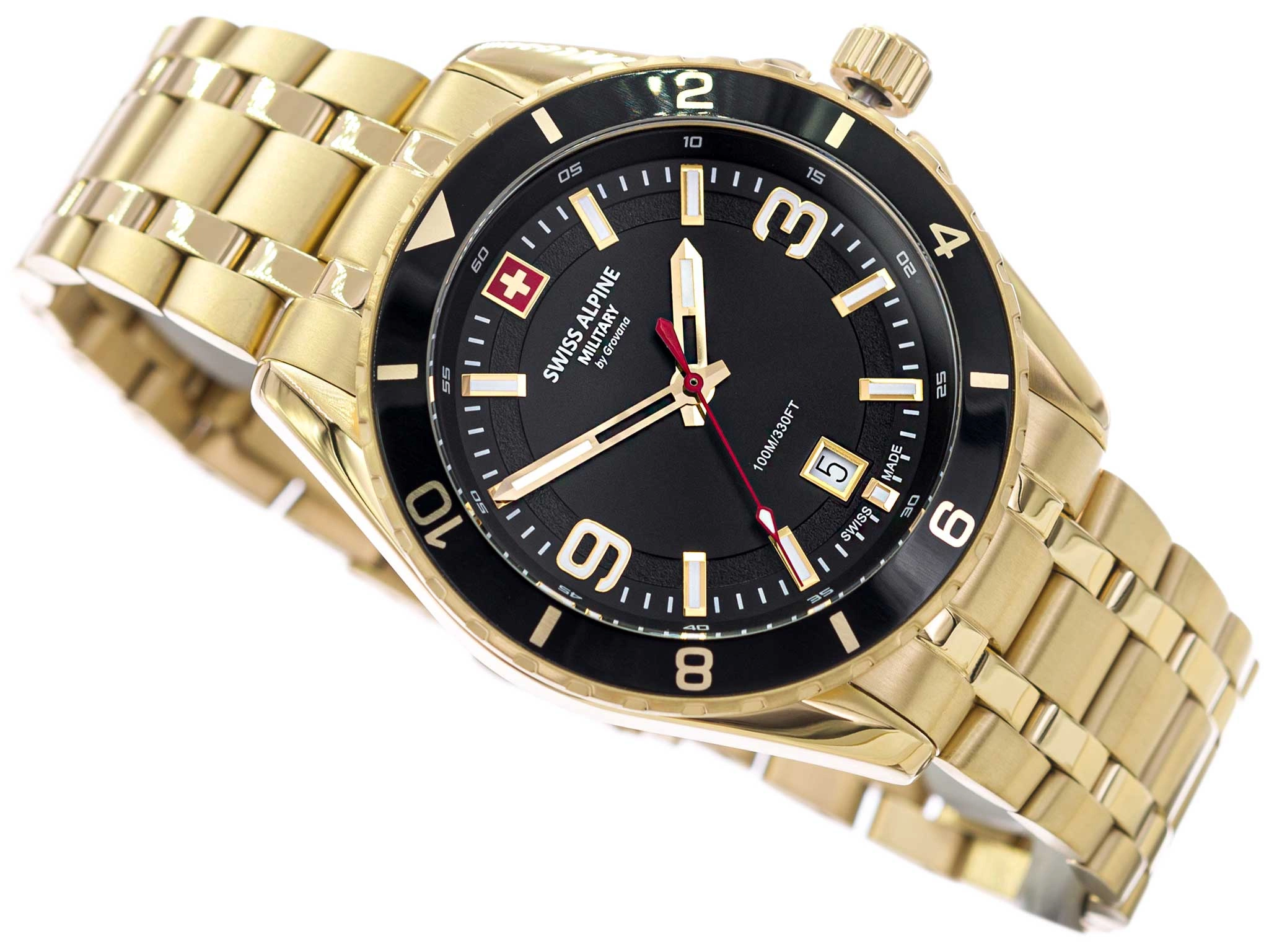 - Wodoszczelny Zegarek Męski Swiss Alpine Military SAM7034.1117 złoty na bransolecie, posiada funkcje datownika i neobrite.