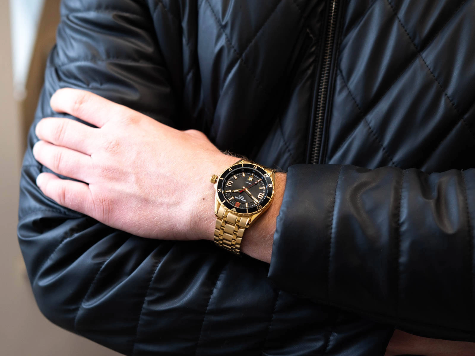 Swiss Alpine Military SAM7034.1117 Sierra to elegancki i nowoczesny zegarek męski, który stanowi połączenie szwajcarskiej precyzji oraz współczesnego designu. Jego sercem jest niezawodny mechanizm kwarcowy, zasilany baterią, wyprodukowany w Szwajcarii, co gwarantuje najwyższą dokładność oraz długowieczność. Zegarek posiada solidną kopertę w odcieniu złota, wykonaną z trwałej stali szlachetnej, która nie tylko zapewnia odporność na uszkodzenia, ale również dodaje wyrafinowanego charakteru. Całość uzupełnia bransoleta z tej samej stali, także w kolorze złotym, wyposażona w zapięcie motylkowe z dodatkowym zabezpieczeniem, co gwarantuje komfort noszenia oraz zapobiega przypadkowemu rozpięciu. Czarna tarcza zegarka jest stylowym kontrastem dla złotych, liniowych indeksów, które są doskonale widoczne nawet przy słabym oświetleniu dzięki zastosowaniu powłoki neobrite – po naświetleniu świeci ona przez pewien czas, co znacząco ułatwia odczytanie godziny. Szkło mineralne, które zabezpiecza tarczę, charakteryzuje się odpornością na zarysowania i chroni cyferblat przed uszkodzeniami. Na godzinie szóstej umieszczono funkcjonalny datownik, który pokazuje aktualny dzień miesiąca, co dodaje zegarkowi praktycznego wymiaru. Zegarek charakteryzuje się również wysoką wodoszczelnością na poziomie 10 ATM, co pozwala na swobodne pływanie, a także użytkowanie go w codziennych sytuacjach bez obaw o uszkodzenie przez wodę. To model stworzony dla mężczyzn ceniących sobie zarówno funkcjonalność, jak i stylowy wygląd. Wysoka jakość wykonania oraz zastosowanie starannie dobranych materiałów sprawiają, że zegarek ten spełni oczekiwania nawet najbardziej wymagających użytkowników. Dodatkowo, zegarek jest zapakowany w oryginalne pudełko producenta, co czyni go idealnym pomysłem na prezent.