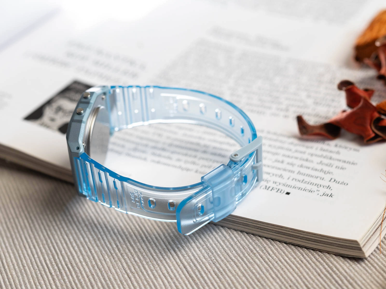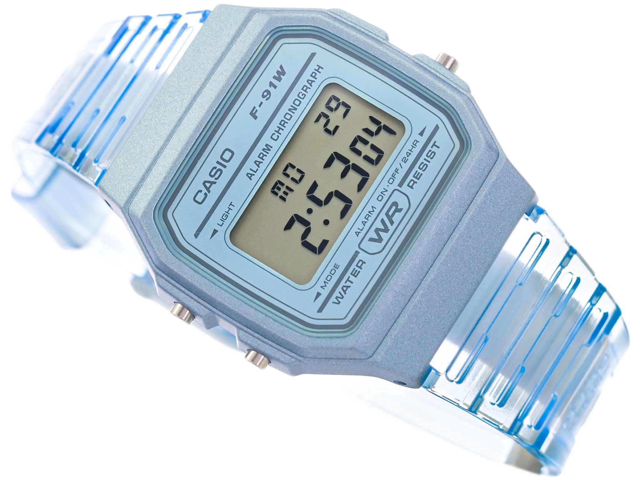 - Zegarek Damski Casio F-91WS-2EF transparentny niebieski na pasku, posiada funkcje takie jak stoper i datownik.