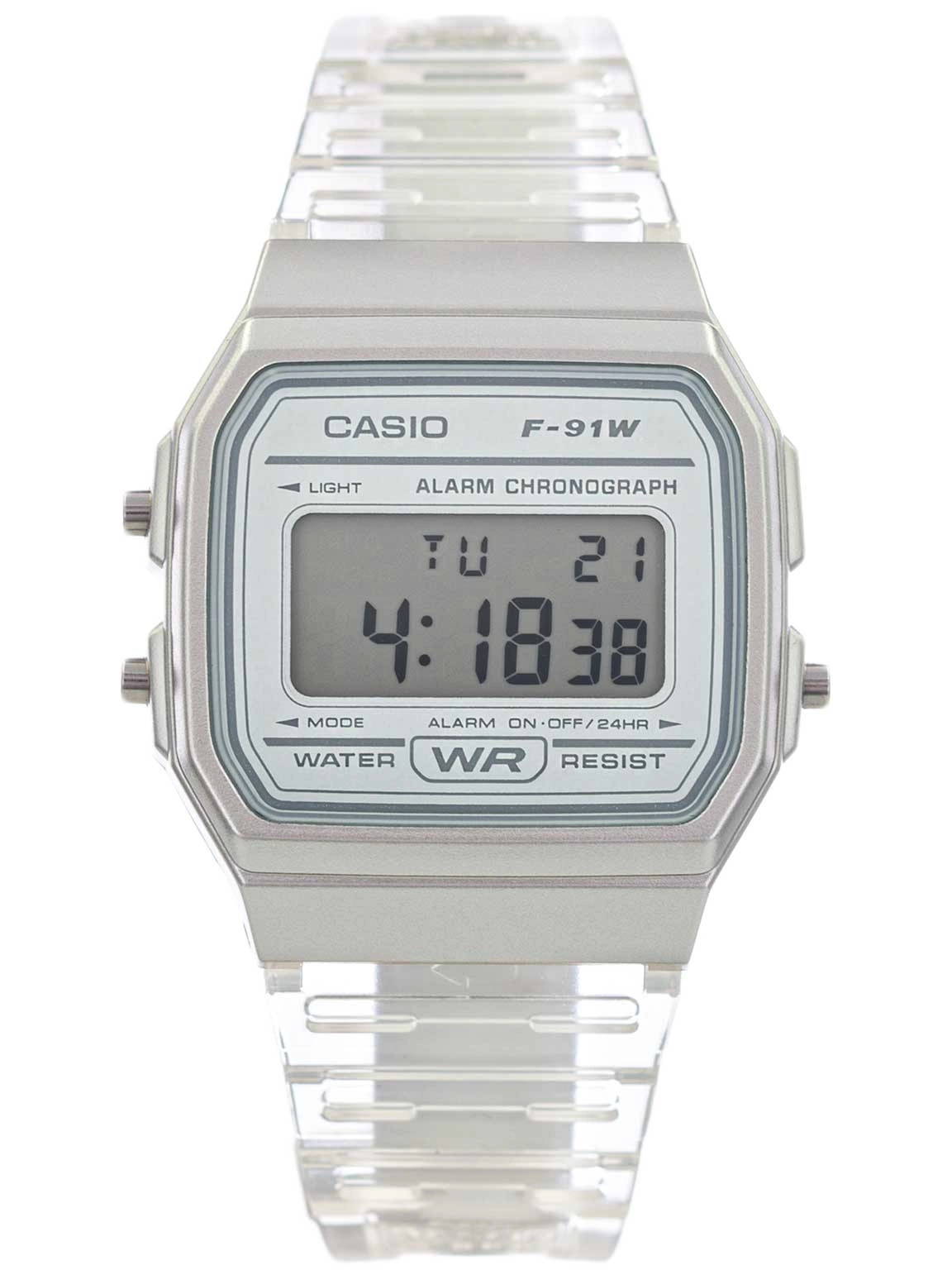 • Zegarek Casio F-91WS-2EF transparentny na pasku, posiada funkcje takie jak stoper i datownik.
