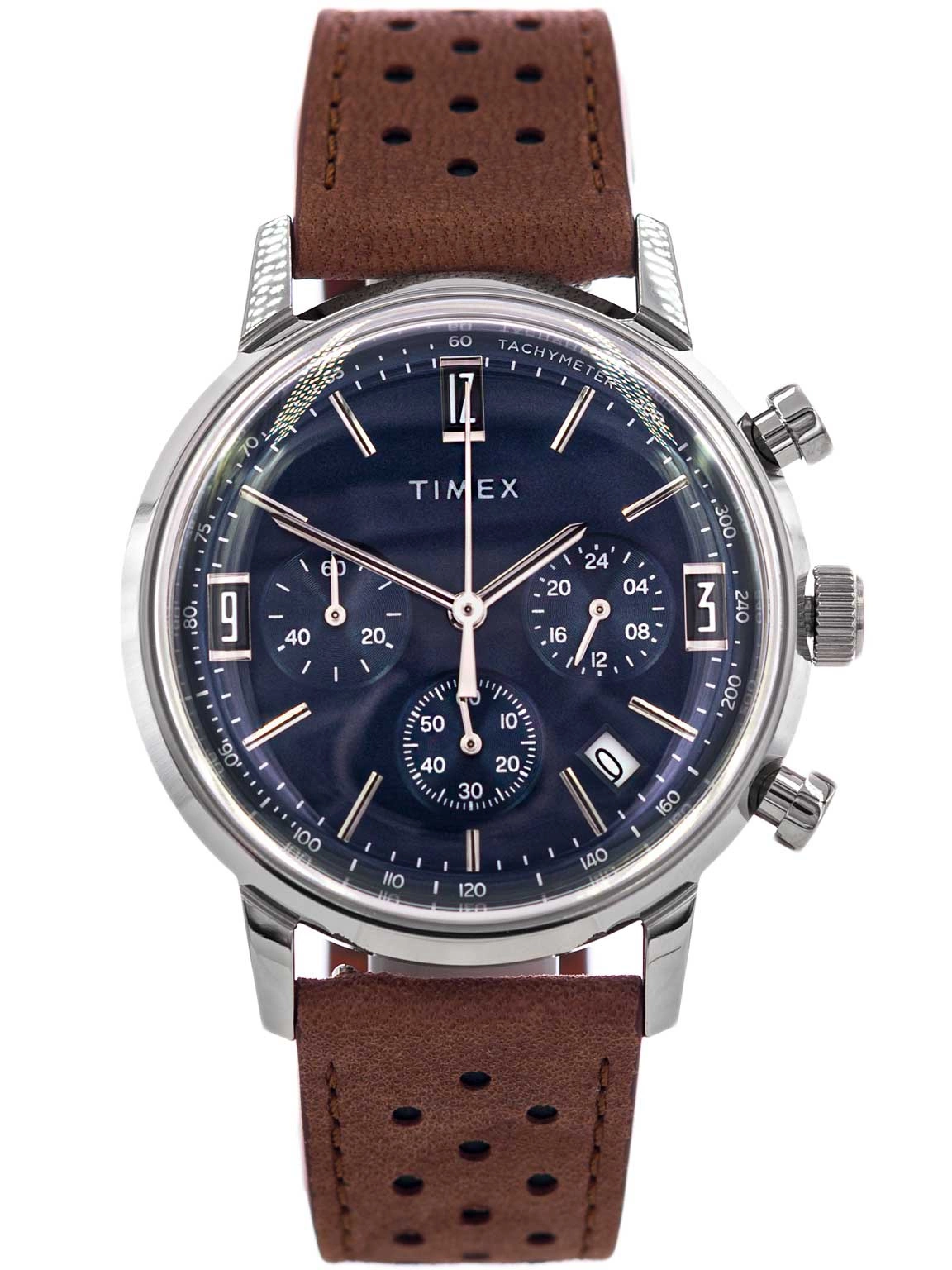 Timex TW2W10200 Marlin to elegancki zegarek męski, który łączy w sobie klasyczny styl z nowoczesnymi funkcjami, idealnie sprawdzając się zarówno na co dzień, jak i przy wyjątkowych okazjach. Jego wyrazisty, a zarazem subtelny design przypadnie do gustu zarówno miłośnikom aktywności fizycznej, jak i osobom preferującym swobodny, lecz elegancki wygląd. Zegarek cechuje solidna konstrukcja — srebrna koperta została wykonana z wysokiej jakości stali szlachetnej, zapewniając trwałość i elegancję. Kopertę osadzono na brązowym, skórzanym pasku, który dodaje całości klasycznego charakteru. Pasek zapinany jest na tradycyjną sprzączkę z igłą, co gwarantuje wygodę użytkowania i pewne zapięcie. Na uwagę zasługuje granatowa tarcza ozdobiona subtelnym szlifem słonecznym, która nie tylko dodaje zegarkowi wyrafinowania, ale również stanowi doskonałe tło dla kontrastujących, liniowych indeksów w srebrno-czarnym odcieniu. Wskazania godzin 3, 9 i 12 są wyraźnie oznaczone cyframi arabskimi, co ułatwia szybkie i wygodne odczytywanie czasu. Dodatkową funkcjonalność zapewnia tachymetr umieszczony na krawędzi tarczy, umożliwiający precyzyjne mierzenie prędkości na podstawie przebytej odległości i czasu. Zegarek wyposażono również w datownik znajdujący się między godzinami 4 a 5, który wskazuje aktualny dzień miesiąca. Ponadto, na tarczy umieszczono trzy mniejsze sub-tarcze: pierwsza pełni funkcję stopera, druga pokazuje czas w formacie 24-godzinnym, a trzecia pełni rolę sekundnika, pozwalając na dokładne śledzenie czasu. Cyferblat zabezpiecza wypukłe szkiełko akrylowe. Timex TW2W10200 Marlin to nie tylko zegarek, ale i stylowy dodatek, który z pewnością przyciągnie uwagę swoim ponadczasowym urokiem. Model ten jest sprzedawany w eleganckim, oryginalnym opakowaniu producenta, idealnym do wręczenia jako wyjątkowy prezent.