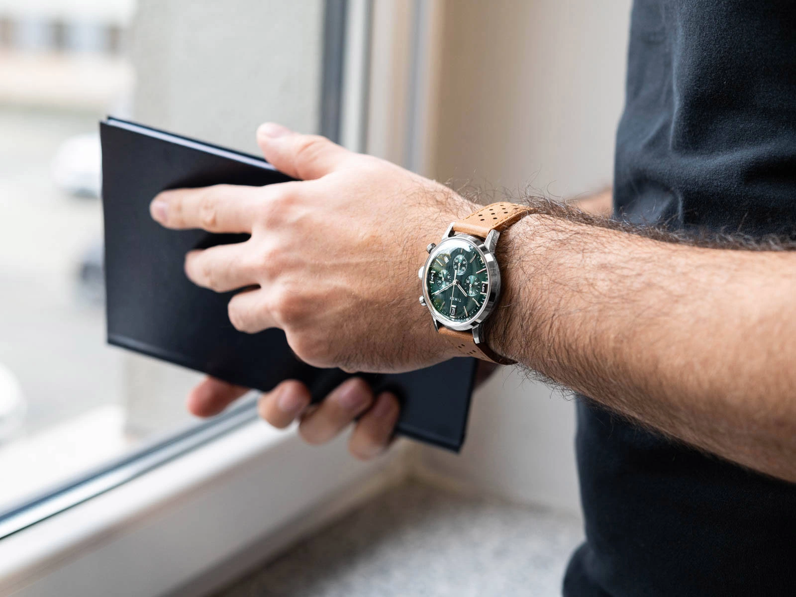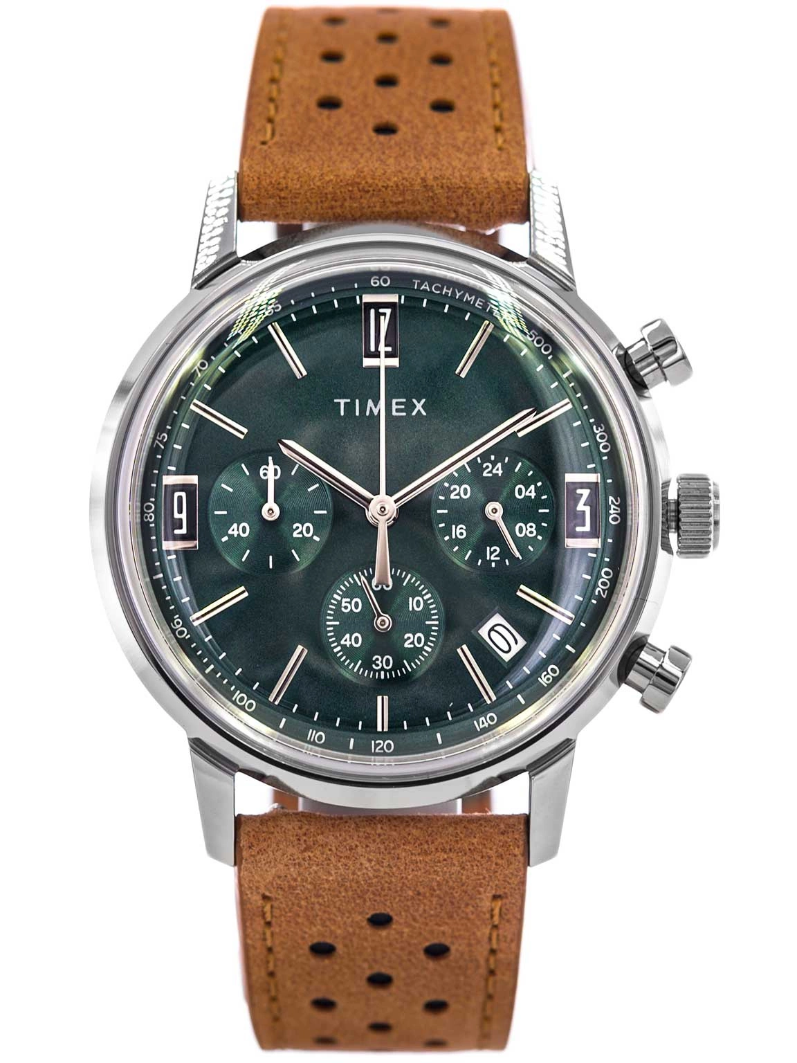 Timex TW2W10100 Marlin to męski zegarek, który harmonijnie łączy w sobie klasykę z nowoczesnym podejściem do designu, stając się doskonałym wyborem zarówno na co dzień, jak i na wyjątkowe okazje. Model ten charakteryzuje się eleganckim, ale jednocześnie uniwersalnym wyglądem, który przypadnie do gustu zarówno osobom ceniącym aktywny tryb życia, jak i miłośnikom klasycznej elegancji. Zegarek przyciąga wzrok solidną srebrną kopertą wykonaną z najwyższej jakości stali szlachetnej, która gwarantuje nie tylko trwałość, ale i ponadczasowy wygląd. Koperta została osadzona na stylowym, brązowym, skórzanym pasku, który dzięki swojej miękkości i starannemu wykonaniu zapewnia maksymalny komfort noszenia. Pasek zapinany jest na tradycyjną sprzączkę, co dodaje mu klasycznego charakteru i zapewnia bezpieczne dopasowanie. Centralnym elementem zegarka jest zachwycająca, szmaragdowa tarcza, ozdobiona subtelnym szlifem słonecznym, który delikatnie odbija światło, dodając zegarkowi wyrafinowanego blasku. Tarcza stanowi doskonałe tło dla wyraźnych, liniowych indeksów w srebrno-czarnym odcieniu, które harmonijnie kontrastują z głębokim kolorem tła. Cyfry arabskie na pozycjach godzin 3, 9 i 12 zwiększają czytelność tarczy, ułatwiając szybkie i wygodne odczytywanie godziny.