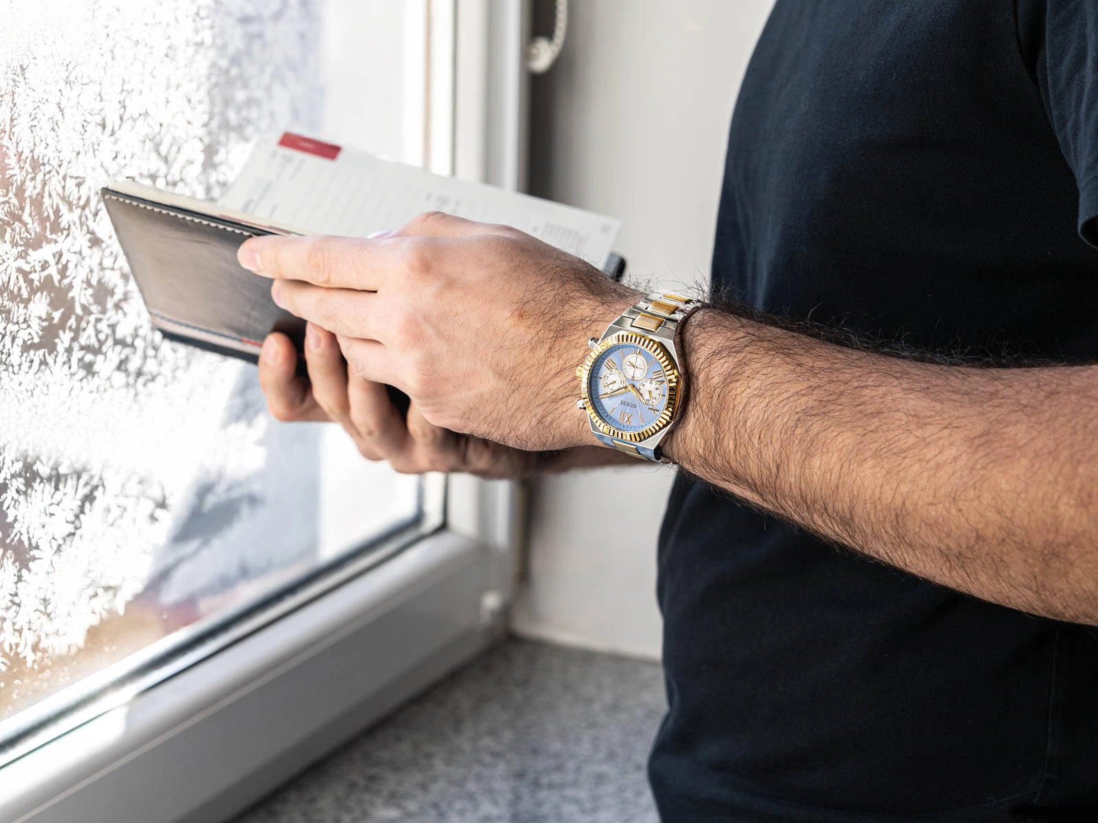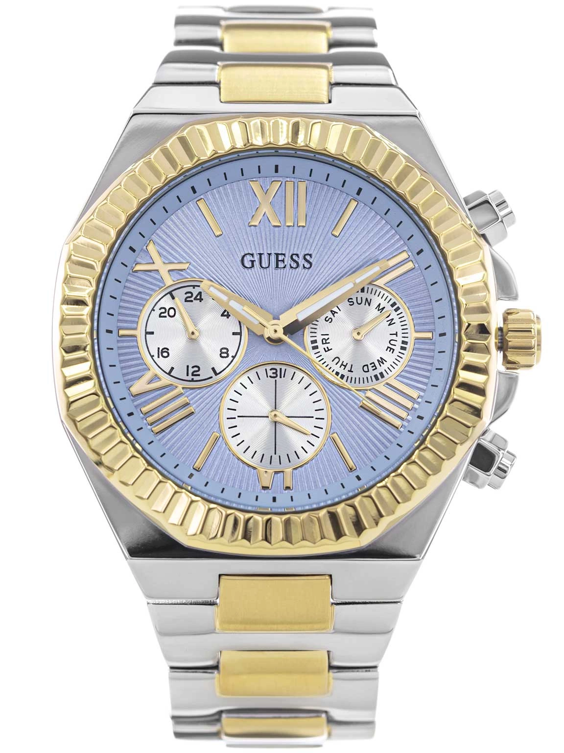 Guess Equity GW0703G3 jest przykładem połączenia nowoczesnego designu z funkcjonalnością i elegancją. Masywna, stalowa, srebrna koperta ozdobiona jest ringiem w kolorze złota. W jej wnętrzu pracuje zasilany bateria japoński mechanizm kwarcowy. Koperta została zawieszona na solidnej bransolecie wykonanej z wysokiej jakości stali szlachetnej utrzymanej w modnej srebrno-złotej kolorystyce, o błyszcząco-matowym wykończeniu. Bransoleta została wyposażona w wygodne zapięcie motylkowe. Na błękitnym, prążkowanym cyferblacie widnieją trzy małe, srebrne tarcze, które wskazują dzień tygodnia, dzień miesiąca i zegar 24 godzinny. Tarcza jest chroniona przez płaskie, odporne na zarysowania szkiełko mineralne. Rozbudowany datownik ustawia się za pomocą przycisków z prawej strony. Wskazówki są fosforyzowane, więc po naświetleniu, świecą przez jakiś czas, ułatwiając tym samym odczyt godziny w ciemności. Guess GW0703G3 Equity ze względu na pokaźne gabaryty, efektownie prezentuje się na męskim nadgarstku. Zegarek został zapakowany w oryginalne pudełko producenta, które sprawdzi się jako opakowanie na prezent.