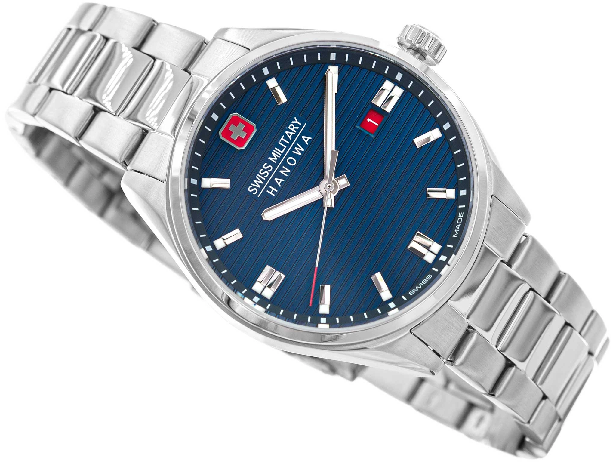 - Wodoszczelny Zegarek Męski Swiss Military Hanowa SMWGH2200102 srebrny na bransolecie. Posiada funkcje datownika i neobrite.