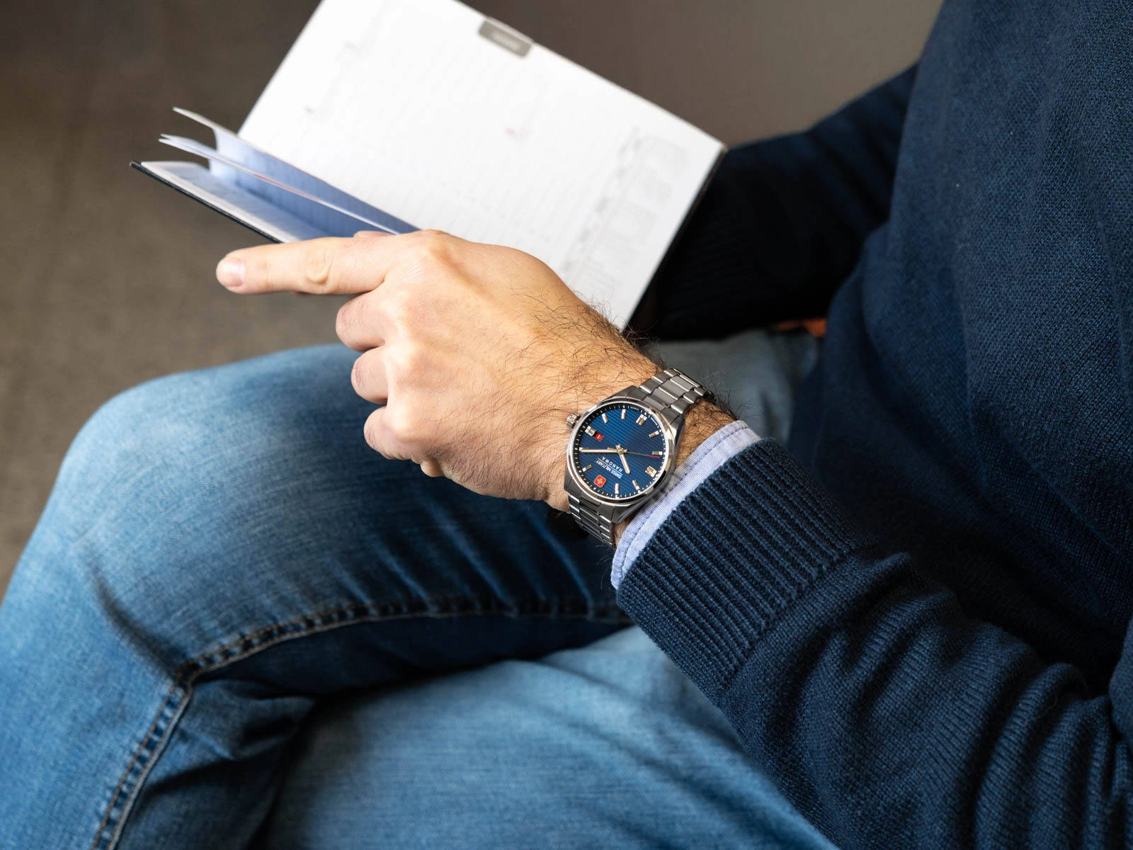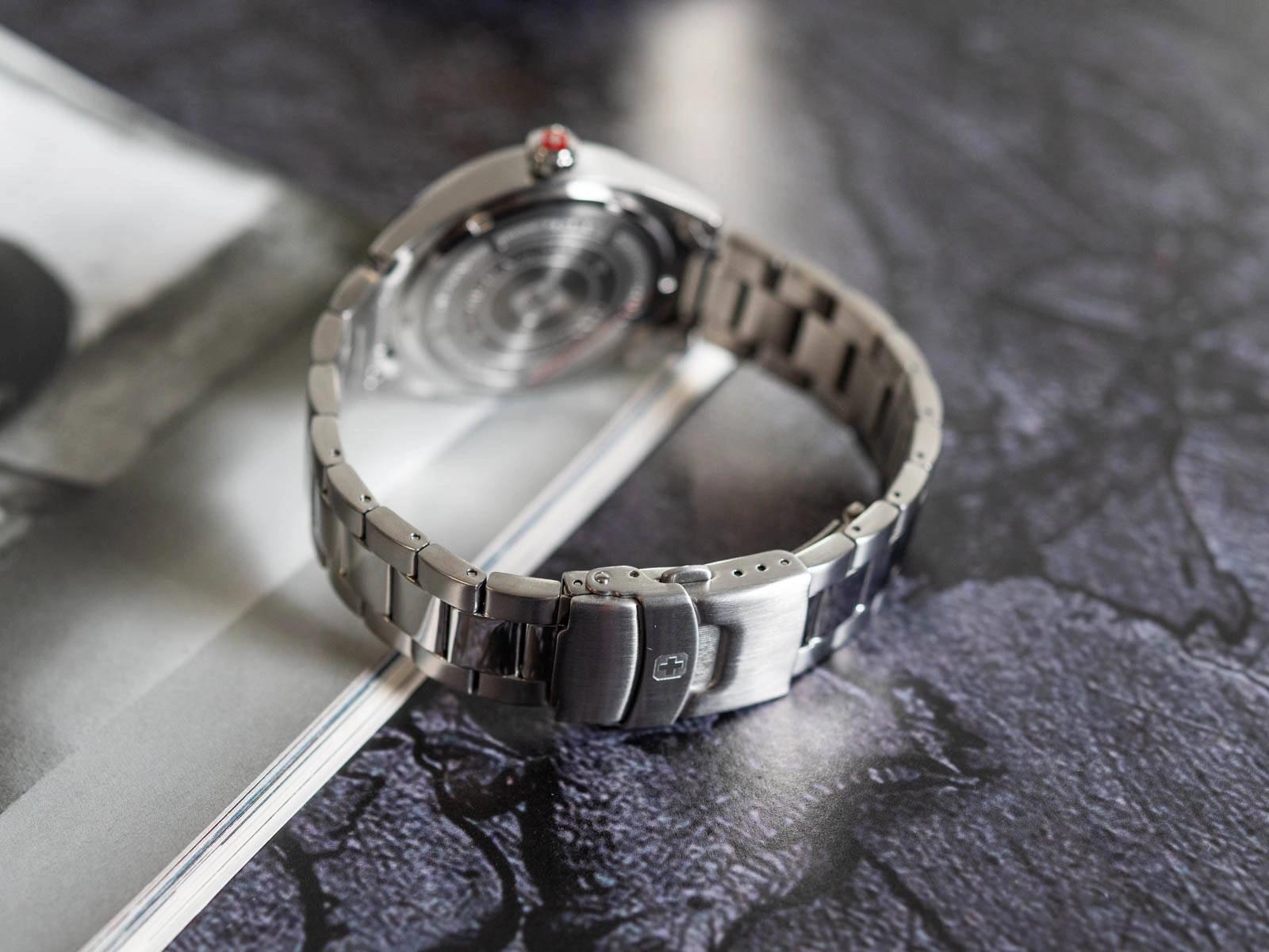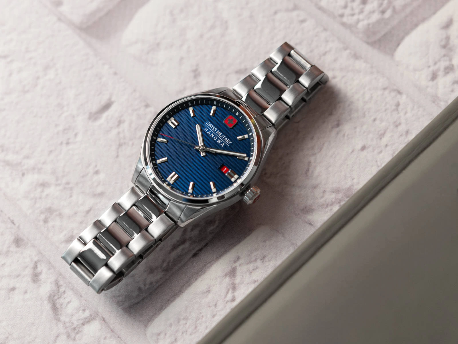 Głęboki odcień niebieskiej tarczy tworzy harmonijne tło dla eleganckich, srebrnych indeksów liniowych. Uwagę przyciąga również charakterystyczne czerwone logo z szwajcarskim krzyżem na godzinie dwunastej, podkreślające renomowane szwajcarskie dziedzictwo marki. Indeksy oraz wskazówki zostały pokryte warstwą fosforyzującą neobrite, dzięki czemu emitują delikatne światło w ciemności, umożliwiając łatwy odczyt godziny nawet przy ograniczonym oświetleniu. Praktyczny datownik umieszczony na godzinie trzeciej wskazuje zarówno dzień tygodnia, jak i aktualny dzień miesiąca, co stanowi dodatkowy atut tego modelu. Tarcza zegarka została zabezpieczona szkiełkiem szafirowym, które charakteryzuje się wysoką odpornością na zarysowania, co czyni zegarek idealnym do codziennego użytku w różnych warunkach. Srebrna bransoleta z solidnej stali nierdzewnej jest wyposażona w wygodne zapięcie motylkowe z dodatkowym mechanizmem zabezpieczającym przed przypadkowym otwarciem. Dzięki temu zegarek nie tylko świetnie wygląda, ale również zapewnia komfort użytkowania przez cały dzień.