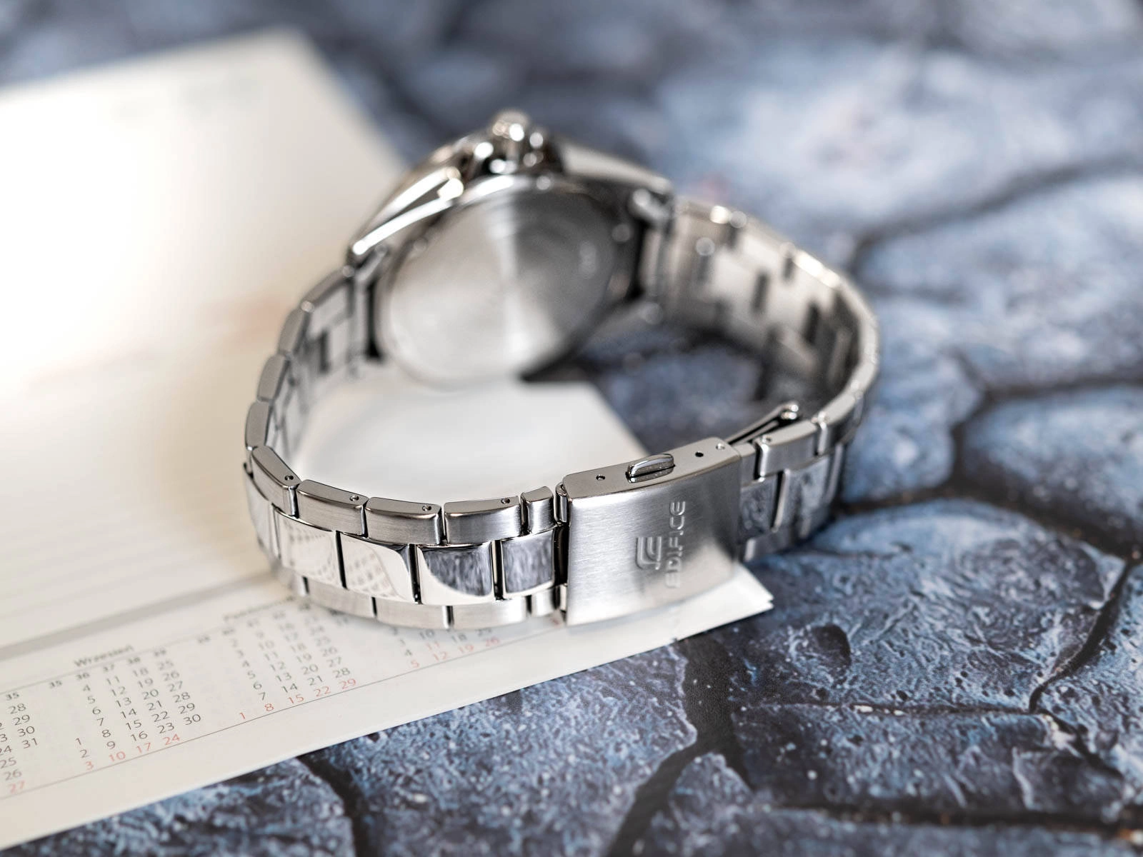 Casio Edifice EFV-100D-8AVUEF to wyjątkowy zegarek, który zachwyca połączeniem nowoczesnego designu, funkcjonalności i niezawodnej jakości. Jego srebrna bransoleta, wykonana z wysokiej klasy stali szlachetnej, jest nie tylko trwała i odporna na korozję, ale również precyzyjnie wykończona, co dodaje elegancji całej konstrukcji. Zapięcie motylkowe zapewnia wygodę użytkowania i chroni przed przypadkowym rozpięciem. Srebrna tarcza z subtelnym szlifem słonecznym, który efektownie odbija światło, nadaje zegarkowi nowoczesnego charakteru. Wyraźne indeksy godzinowe oraz smukłe wskazówki w klasycznym stylu gwarantują czytelność, a technologia neobrite umożliwia ich świecenie w ciemności po naświetleniu, co sprawdza się podczas wieczornych aktywności. Całość chroni płaskie szkiełko mineralne, odporne na zarysowania i codzienne użytkowanie, co podkreśla praktyczny wymiar tego modelu.
