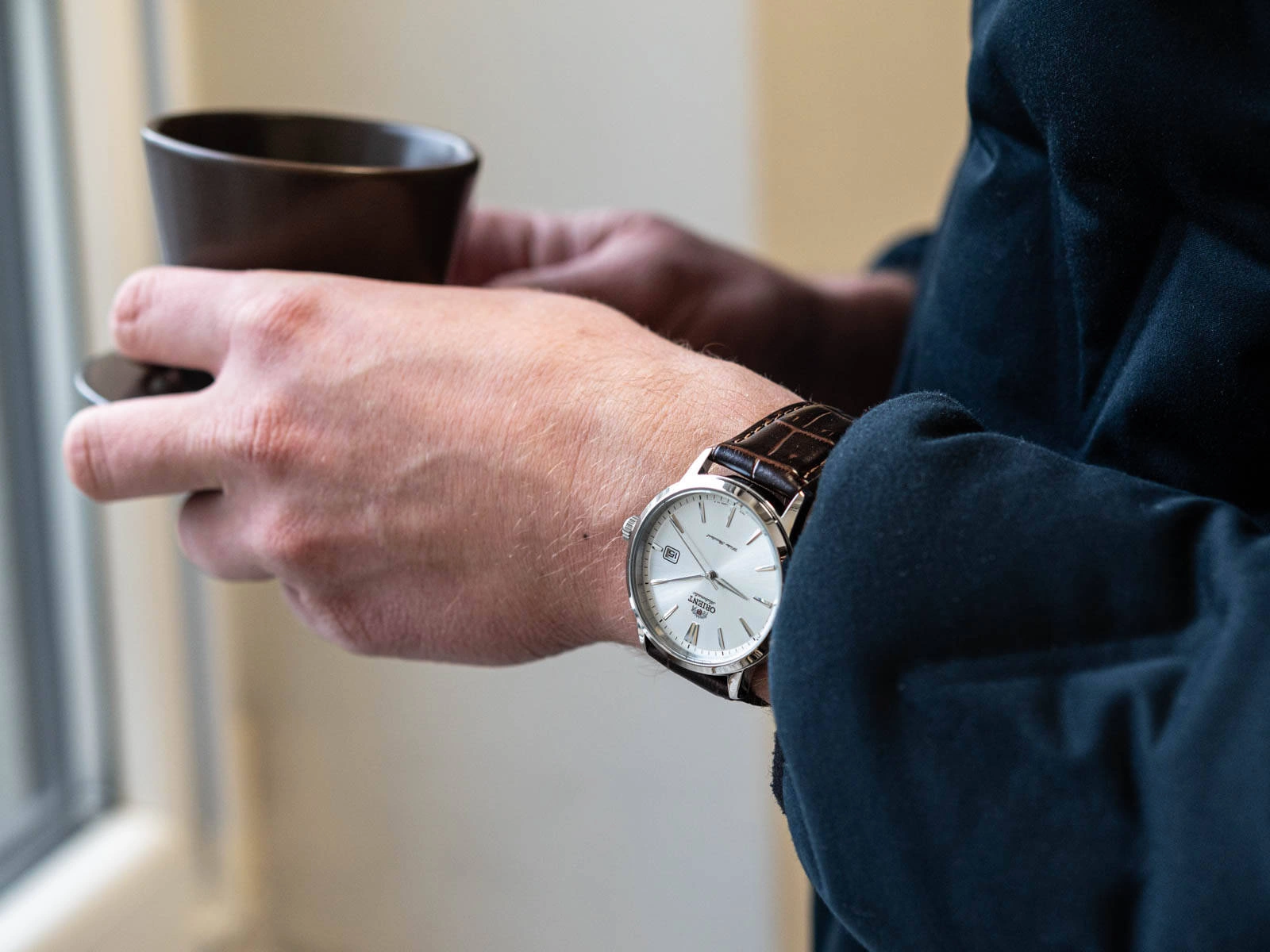 Zegarek Orient RA-AC0F07S30B Symphony Automatic to elegancki, automatyczny czasomierz stworzony z myślą o mężczyznach, którzy cenią klasyczną estetykę i wysoką funkcjonalność. Ten wyjątkowy model łączy w sobie ponadczasowy design z nowoczesną technologią, tworząc idealne rozwiązanie dla miłośników niezawodnych i stylowych dodatków. Serce zegarka stanowi precyzyjny mechanizm automatyczny, który wykorzystuje ruch nadgarstka do generowania energii. Dzięki temu użytkownik nie musi martwić się o wymianę baterii, co czyni ten model nie tylko wygodnym, ale również bardziej przyjaznym środowisku. Dodatkowo, zegarek został wyposażony w funkcję ręcznego dokręcania za pomocą koronki, co pozwala na pełną kontrolę nad działaniem mechanizmu, dostosowując go do indywidualnych preferencji użytkownika. Solidna koperta tego eleganckiego czasomierza wykonana została z odpornej na korozję stali szlachetnej. Srebrne wykończenie nadaje mu uniwersalnego charakteru, dzięki czemu świetnie komponuje się zarówno z formalnym strojem, jak i bardziej swobodnym, codziennym stylem. Subtelny połysk stalowej koperty doskonale współgra z brązowym paskiem wykonanym z naturalnej skóry o najwyższej jakości. Pasek zakończono klasyczną sprzączką, która łączy tradycję z komfortem użytkowania, zapewniając wygodę nawet podczas długotrwałego noszenia.