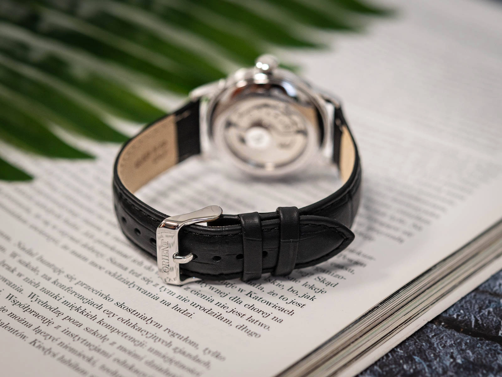 Solidna koperta, wykonana z wysokiej jakości stali szlachetnej, zachwyca srebrnym wykończeniem, które emanuje dyskretną elegancją i dopasowuje się zarówno do formalnych, jak i casualowych stylizacji. Skórzany pasek w głębokim, czarnym kolorze dopełnia całość, oferując wygodę noszenia i trwałość. Klasyczna sprzączka nie tylko ułatwia regulację długości, ale również podkreśla tradycyjny charakter modelu. Transparentny dekielek to kolejny atut – pozwala podziwiać finezyjnie pracujący mechanizm, co z pewnością zadowoli miłośników precyzyjnego rzemiosła.