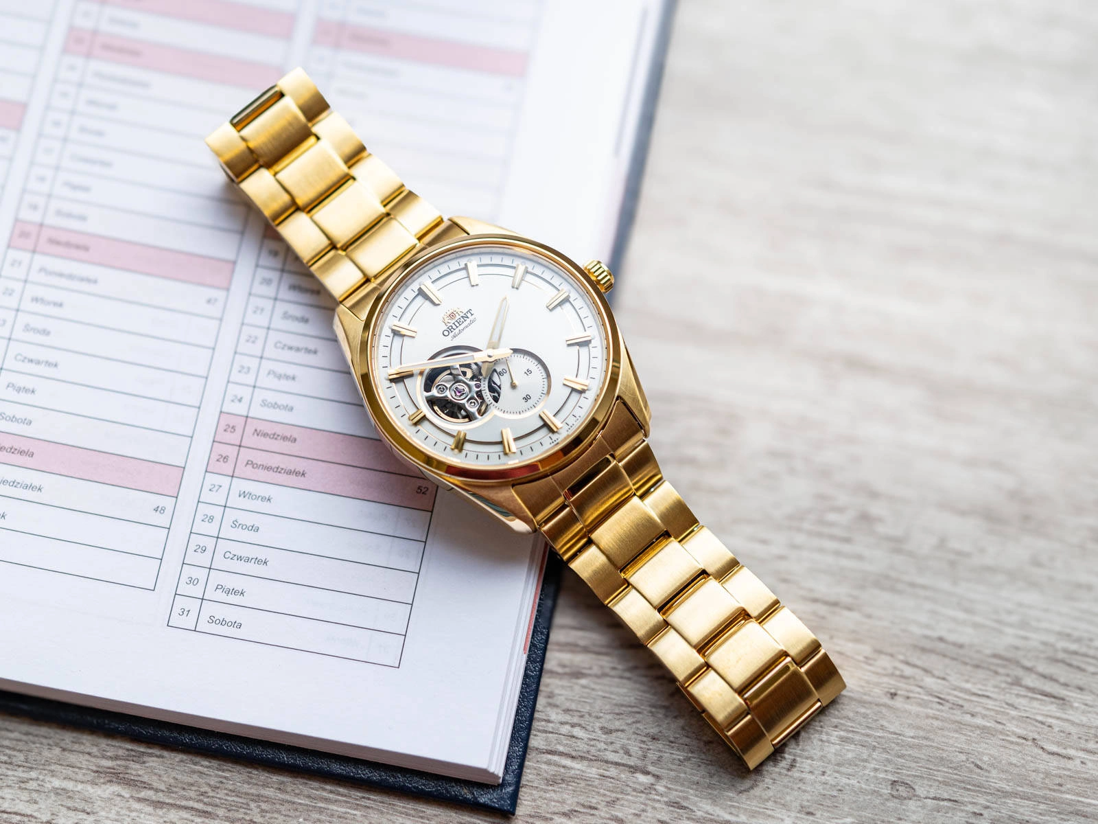 • Automatyczny Zegarek Męski Orient RA-AR0007S30B zloty na bransolecie. Posiada funkcję neobrite.