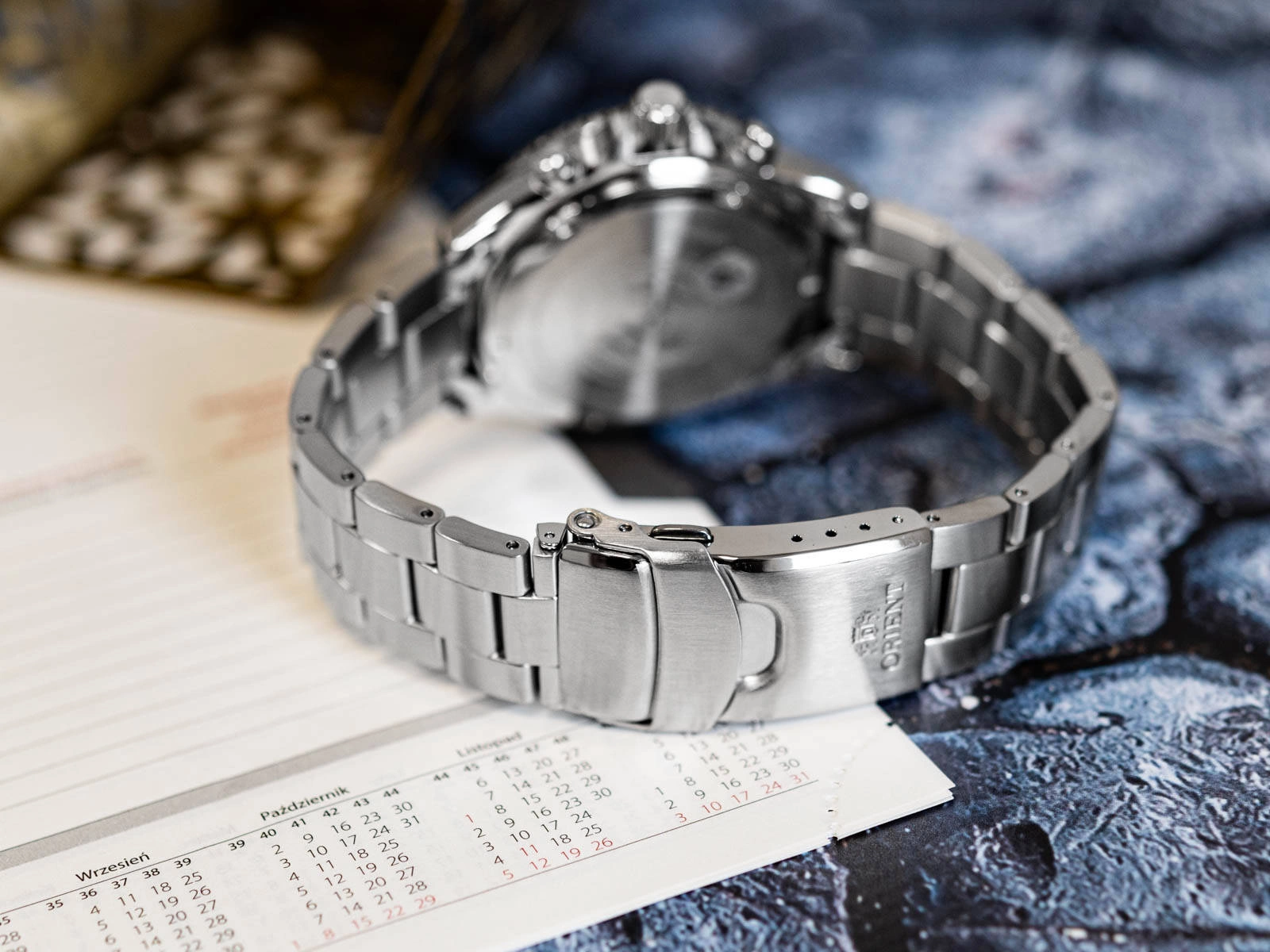 Orient Mako Solar Diver RA-TX0201L10B to nowoczesny zegarek nurkowy, który doskonale łączy funkcjonalność z wyrafinowaną estetyką. To wyjątkowy model zaprojektowany z myślą o najbardziej wymagających użytkownikach – zarówno miłośnikach sportów wodnych, jak i osobach poszukujących stylowego dodatku do codziennych stylizacji. Solidna koperta wykonana z wysokogatunkowej stali szlachetnej wyróżnia się eleganckim srebrnym wykończeniem, które nadaje zegarkowi uniwersalny charakter, idealnie sprawdzający się w każdej sytuacji – od swobodnych, casualowych zestawień po bardziej oficjalne okazje. Jednokierunkowy obrotowy bezel o wyraźnych oznaczeniach został stworzony z myślą o precyzyjnym odmierzaniu czasu podczas nurkowania, zapewniając jednocześnie bezpieczeństwo dzięki swojej solidnej konstrukcji, która minimalizuje ryzyko przypadkowego przesunięcia. Zegarek charakteryzuje się imponującą wodoodpornością na poziomie 20 ATM, co czyni go niezawodnym towarzyszem podczas pływania, snorkelingu czy zaawansowanego nurkowania. Na odwrocie zegarka znajduje się grawerunek przedstawiający delfiny – subtelny, ale efektowny detal podkreślający jego silne powiązanie z morskim środowiskiem. Bransoleta wykonana ze stali szlachetnej oferuje wysoki komfort noszenia, a dzięki zastosowaniu zapięcia motylkowego z dodatkowym zabezpieczeniem zapewnia niezawodność nawet w ekstremalnych warunkach. Całość została zaprojektowana tak, aby nie tylko wyglądać elegancko, ale także gwarantować wytrzymałość na lata intensywnego użytkowania.