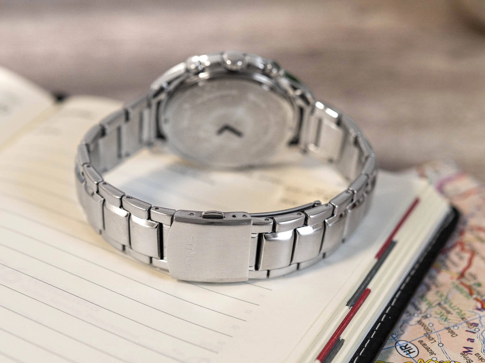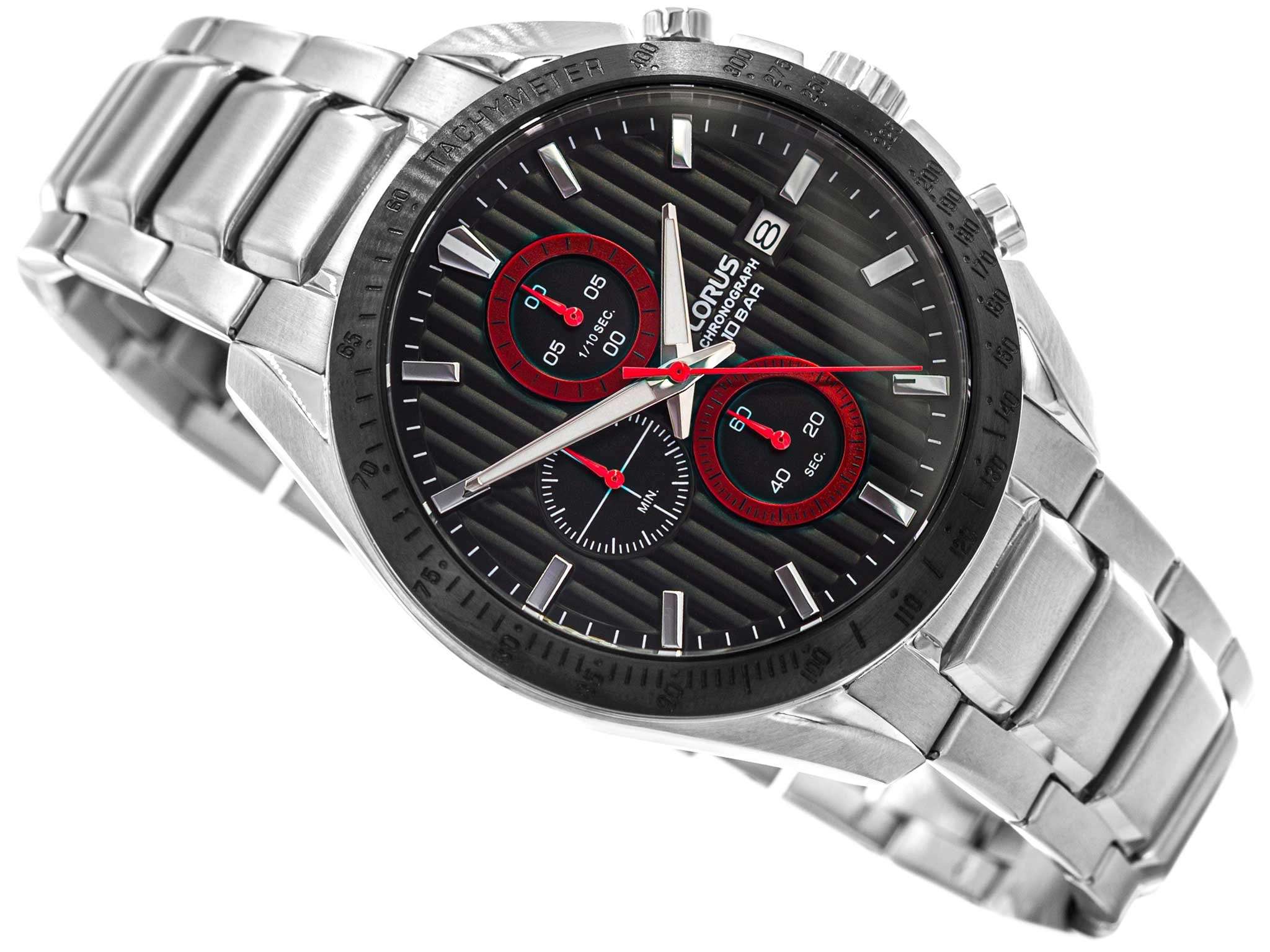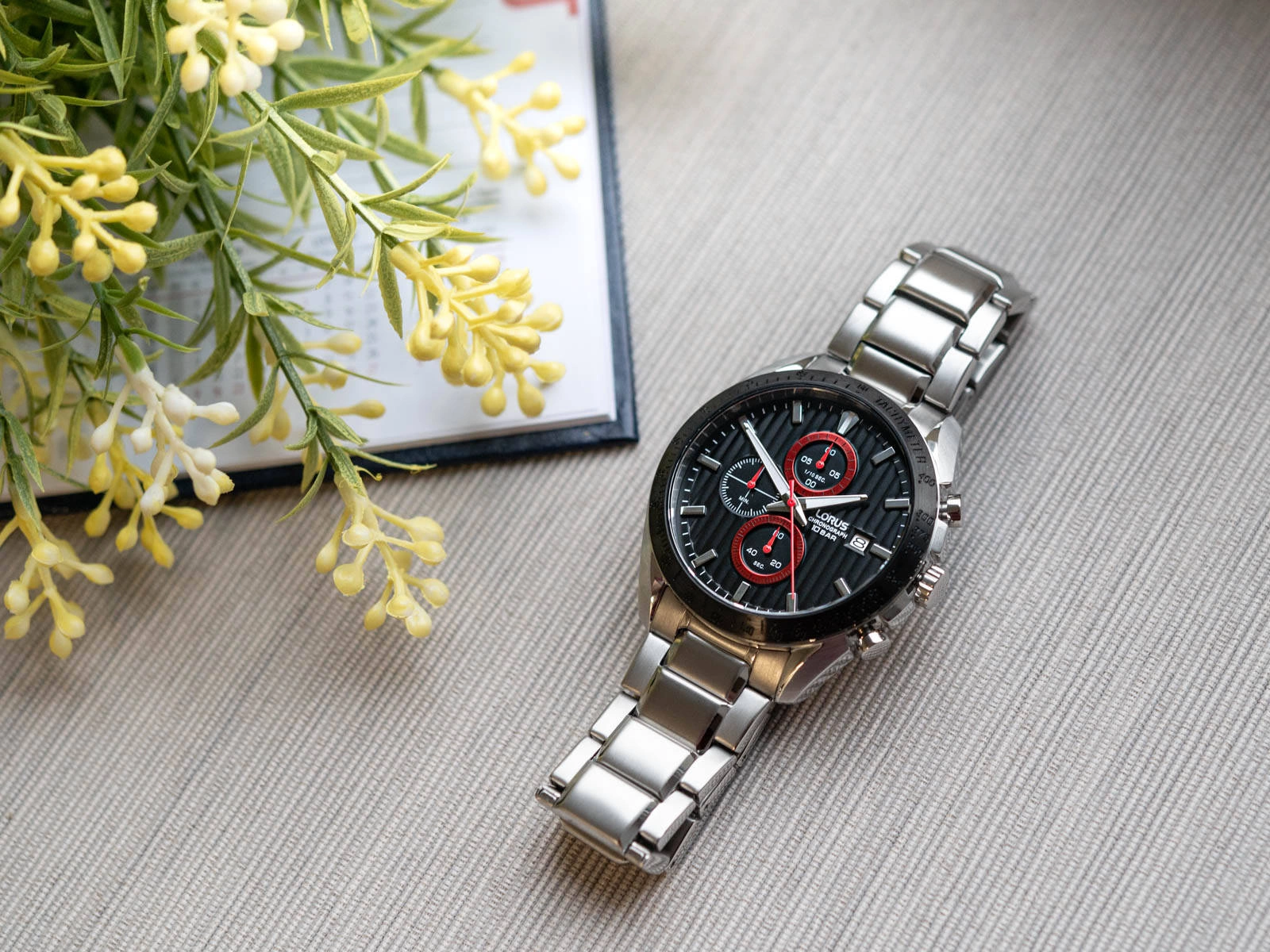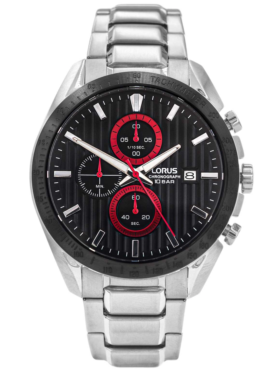 Lorus RM313JX9 to doskonały wybór dla osób ceniących połączenie sportowego stylu, elegancji i trwałości. Model ten wyróżnia się solidną konstrukcją oraz estetyką, która przyciąga uwagę. Srebrna koperta, wykonana z wysokiej jakości stali szlachetnej, kryje precyzyjny mechanizm kwarcowy zasilany baterią, gwarantujący niezawodność i dokładność działania. Koperta została zawieszona na wytrzymałej stalowej bransolecie, wyposażonej w wygodne i bezpieczne zapięcie motylkowe. Czarna tarcza zegarka zdobiona subtelną fakturą idealnie kontrastuje z wyraźnymi, srebrnymi indeksami, co zapewnia doskonałą czytelność. Dodatkowo, wskazówki pokryte powłoką neobrite emitują delikatne światło w ciemności, umożliwiając łatwy odczyt godziny nawet w słabych warunkach oświetleniowych. Funkcjonalność zegarka podkreślają trzy subtarcze pełniące rolę precyzyjnego chronografu oraz praktyczne okienko datownika umieszczone na wysokości godziny trzeciej, które wskazuje aktualny dzień miesiąca. Tarcza zegarka jest zabezpieczona trwałym mineralnym szkłem, odpornym na codzienne zarysowania. Dzięki wodoodporności na poziomie 10 BAR, zegarek nadaje się do pływania i rekreacyjnych aktywności w wodzie, przy zachowaniu ostrożności, aby nie używać przycisków pod wodą. Lorus RM303HX9 to idealne połączenie funkcjonalności i stylu. Świetnie sprawdzi się zarówno w codziennym użytkowaniu, jak i jako elegancki dodatek na bardziej formalne okazje, podkreślając indywidualny charakter właściciela.