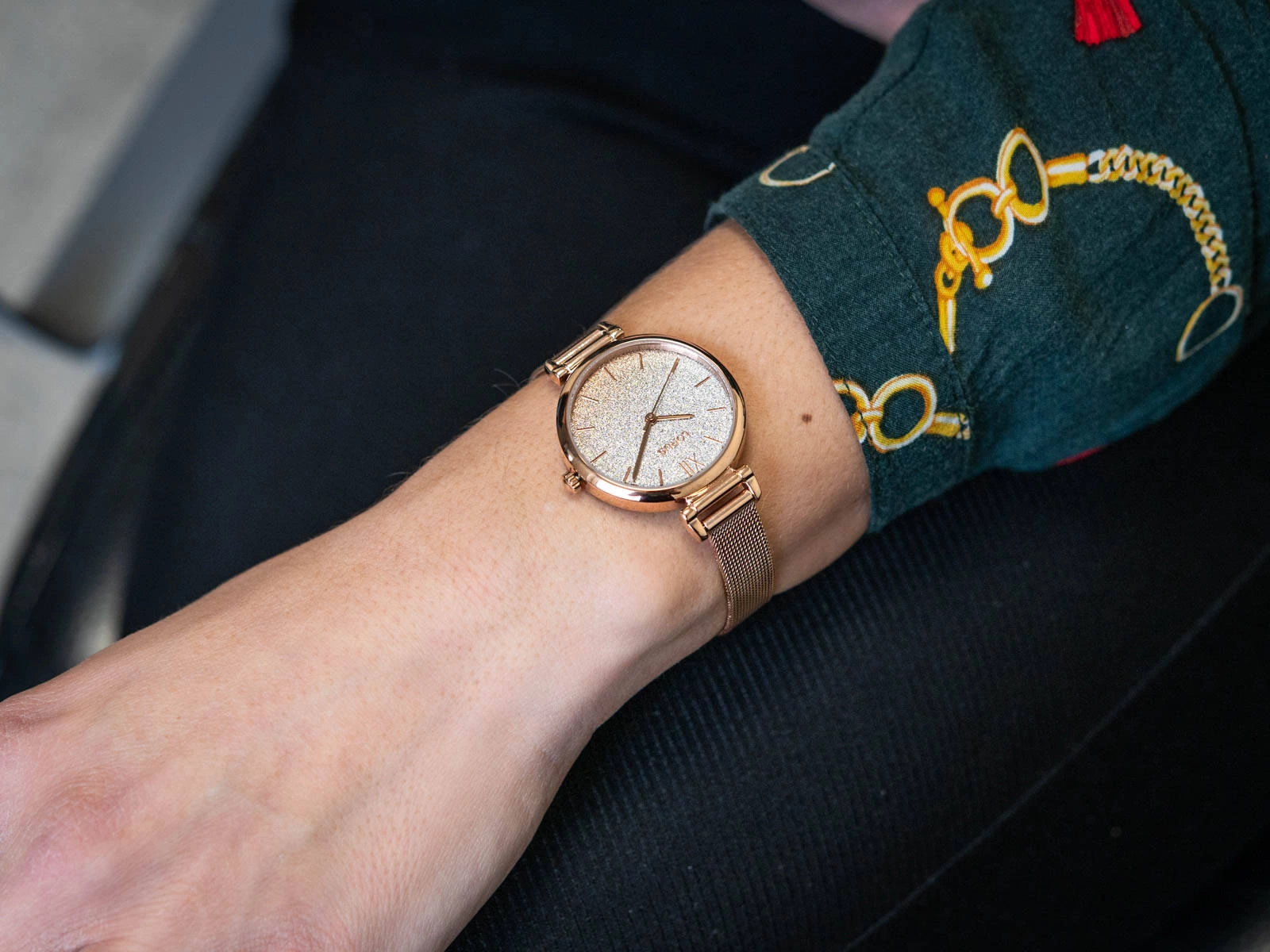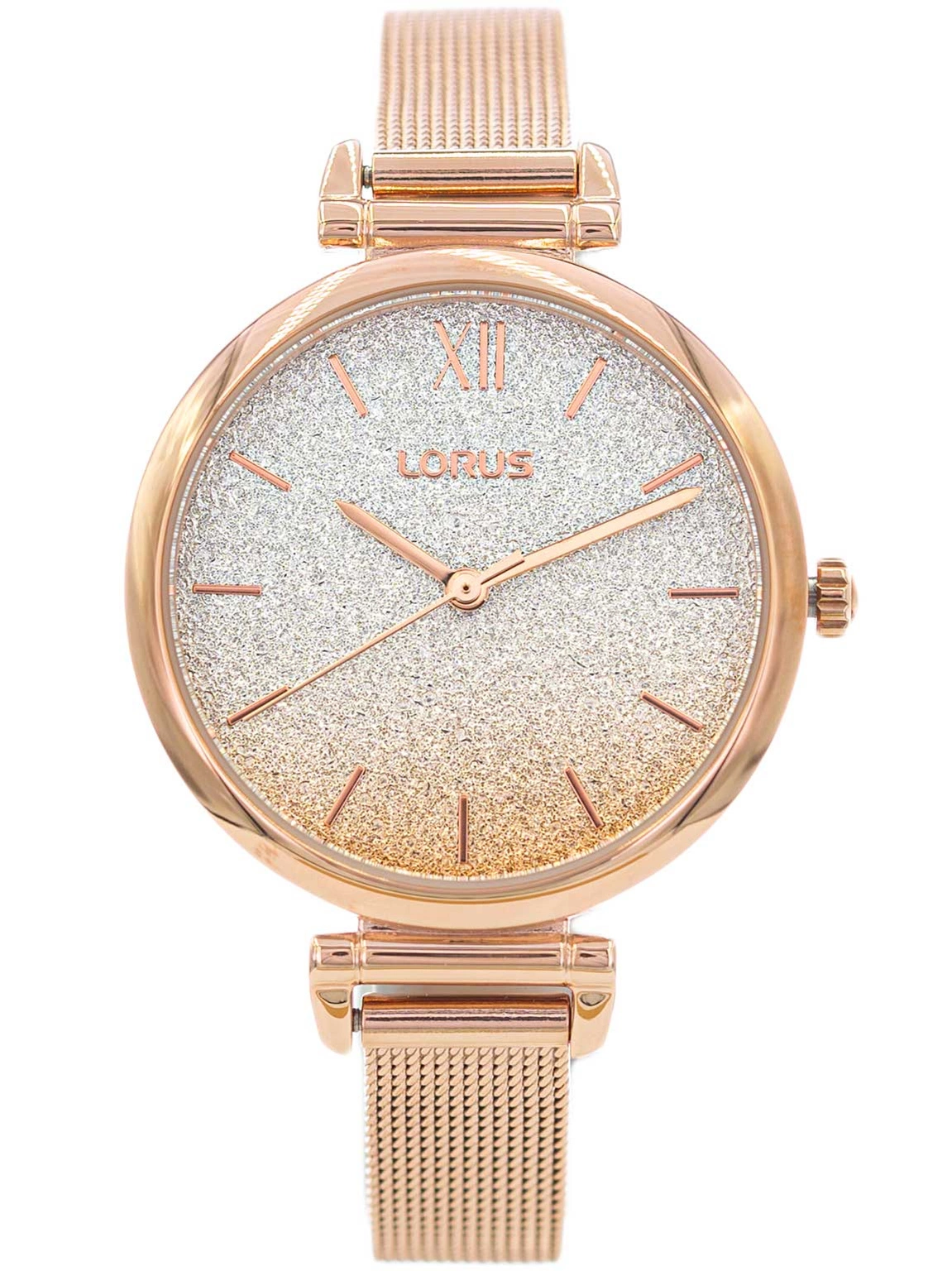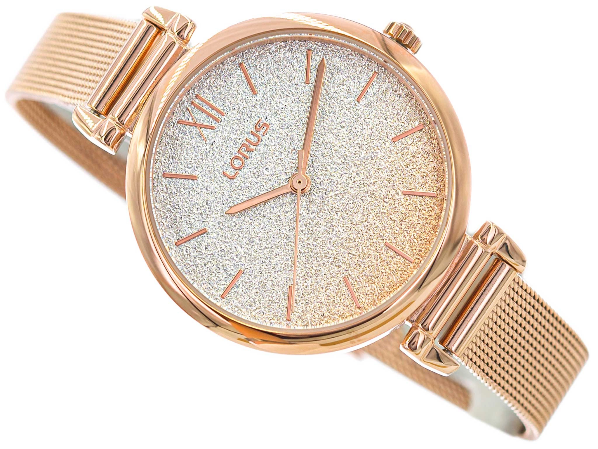 Zegarek Lorus RG232QX5 będzie świetną propozycją dla kobiet, poszukujących wyjątkowego, błyszczącego czasomierza. Cieniowana, brokatowa tarcza w kolorze srebrnym z dodatkiem różowego złota, fantastycznie mieni się, w zależności od kąta padania światła. Godzina 12 oznaczona jest za pomocą cyfry rzymskiej, pozostałe za pomocą pionowych indeksów. Okrągła koperta połączona jest z modną bransoletą mesh. Zegarek można w łatwy sposóbb dopasować do nadgarstka, gdyż wystarczy podważyć element zapięcia i przesunąć go w odpowiadające miejsce. Lorus RG232QX5 idealnie sprawdzi się w codziennym użytku i będzie pasował do większosći stylizacji.