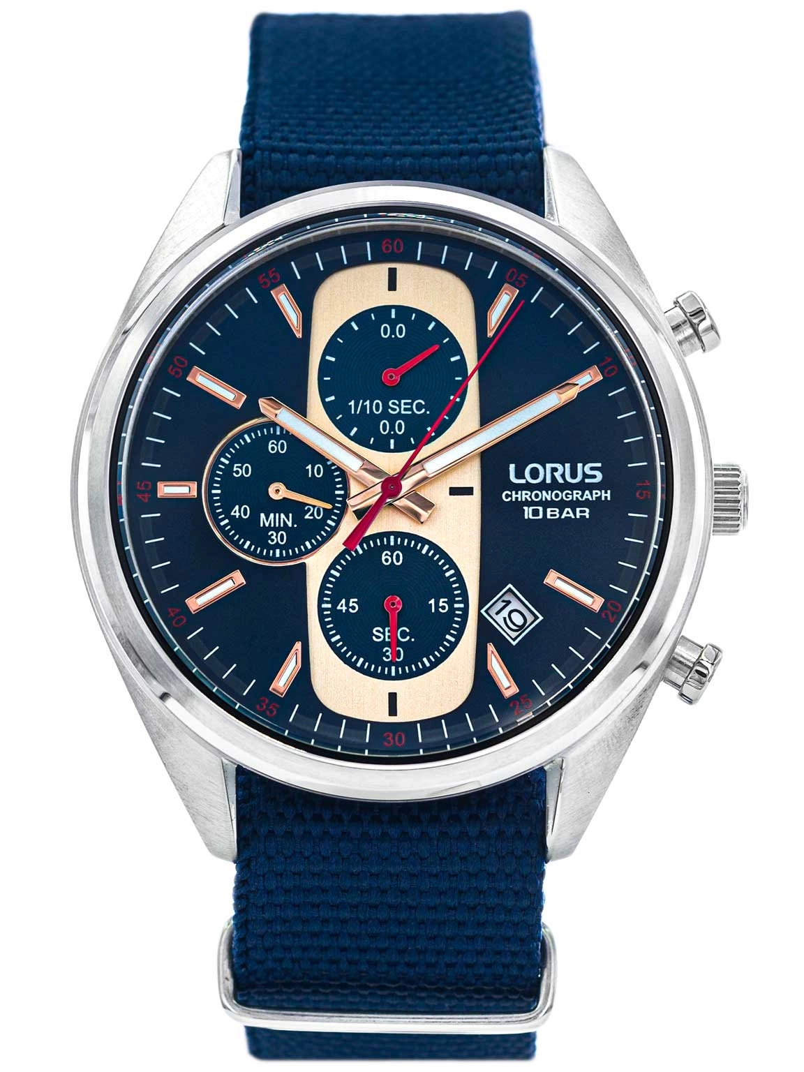 - Wodoszczelny Zegarek Męski Lorus RM357GX9 granatowy na pasku, posiada funkcje takie jak stoper i datownik.