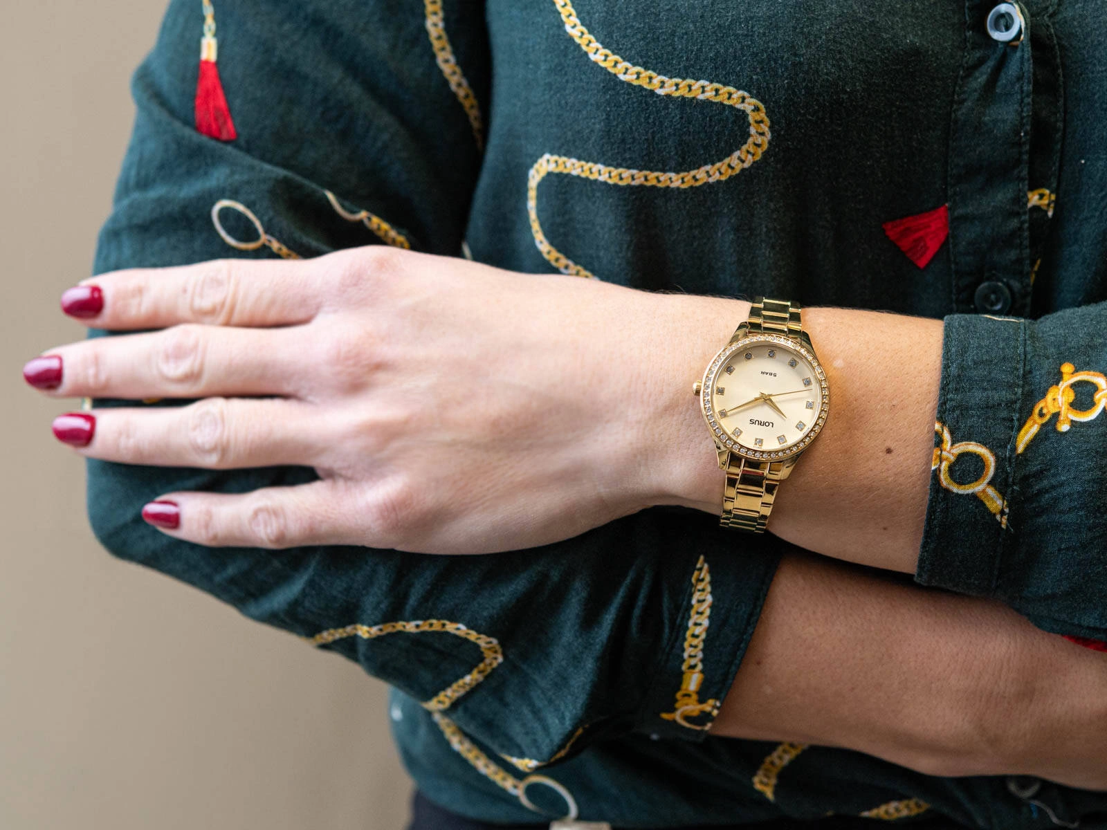 Lorus RG284RX9 to elegancki damski zegarek analogowy, który zachwyca ponadczasowym stylem i niezrównaną precyzją wykonania. Stworzony z myślą o kobietach ceniących klasyczną elegancję, subtelność i jakość, ten model stanowi idealne dopełnienie każdej stylizacji – zarówno codziennej, jak i wieczorowej. Zegarek wyróżnia się smukłą kopertą wykonaną z wysokiej jakości stali szlachetnej w kolorze złotym, która nadaje mu luksusowego charakteru. Jego lekka konstrukcja doskonale dopasowuje się do kobiecego nadgarstka, podkreślając delikatność i wdzięk właścicielki. Wyjątkową estetykę modelu dopełnia złota tarcza z subtelnym szlifem słonecznym, która efektownie odbija światło, tworząc unikalną grę refleksów. Geometryczne indeksy, ozdobione delikatnymi kryształkami, oraz smukłe wskazówki w kolorze złotym nadają mu elegancji i wyrafinowania. Cyferblat chroni płaskie szkło mineralne, które cechuje się odpornością na zarysowania. Dodatkowym akcentem podkreślającym luksusowy charakter zegarka jest ozdobny pierścień wokół tarczy, wysadzany połyskującymi kryształkami. Precyzyjny japoński mechanizm kwarcowy gwarantuje niezawodność i dokładność odmierzania czasu, co czyni go zarówno praktycznym, jak i stylowym wyborem. Lorus RG284RX9 to propozycja dla kobiet, które pragną wyrazić swój wyjątkowy gust i elegancję.