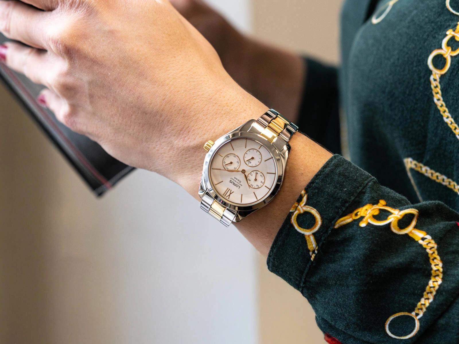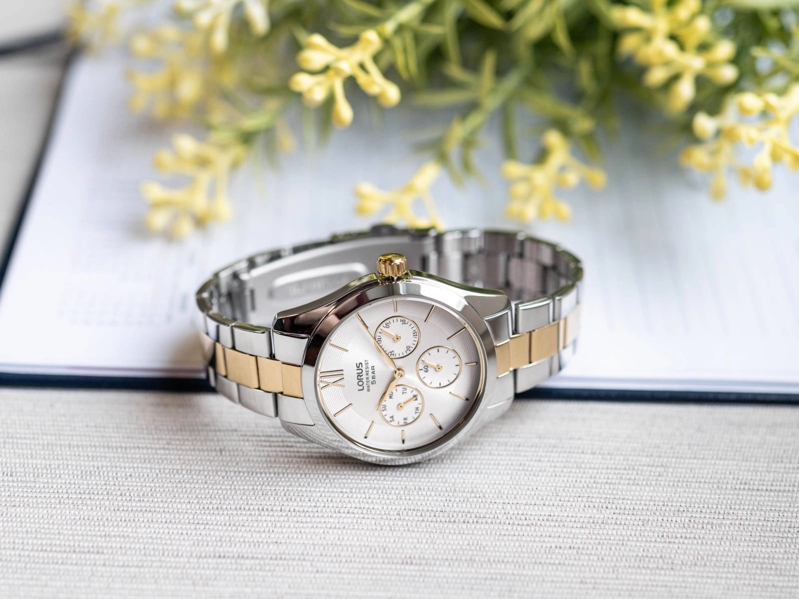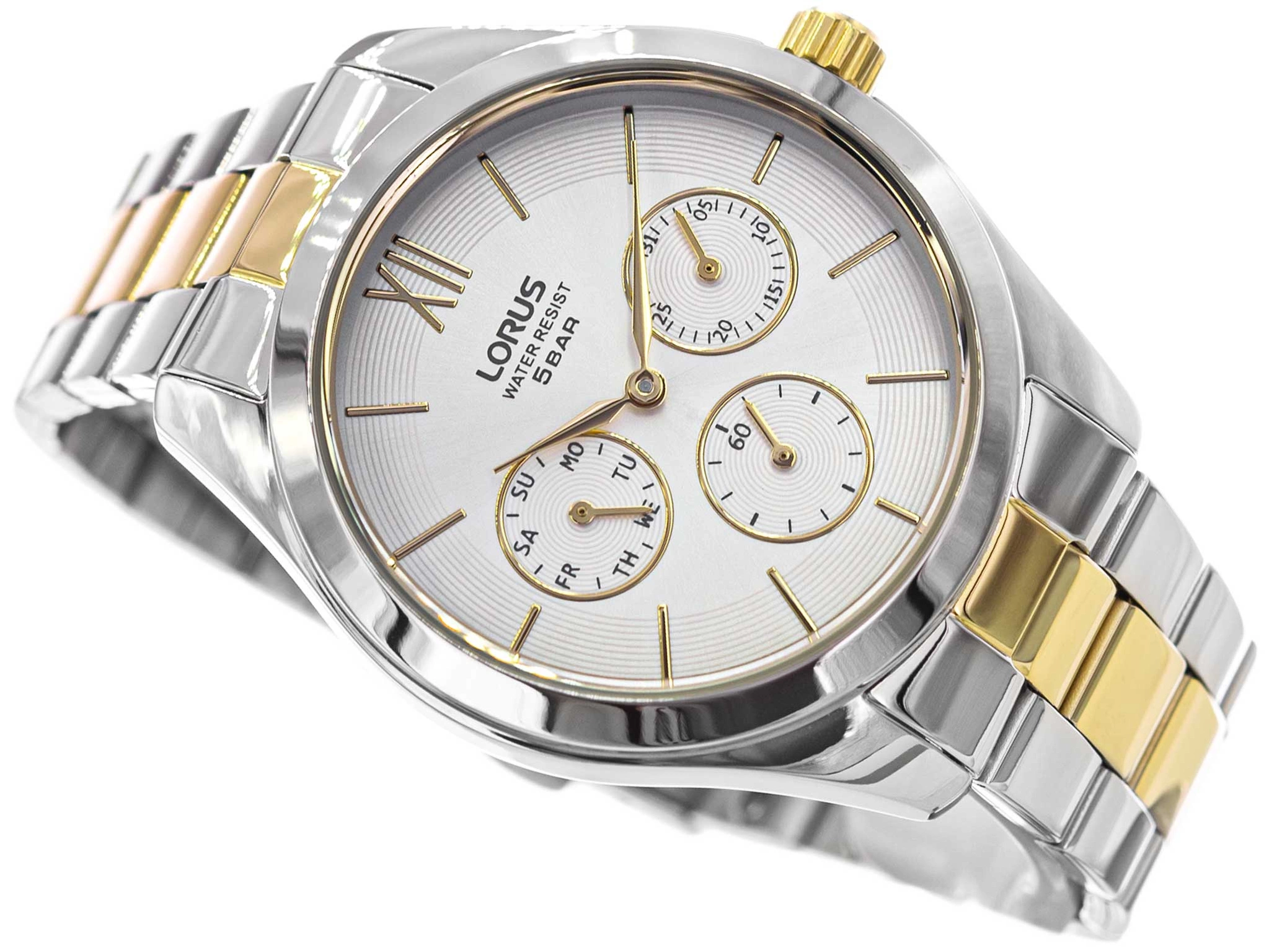 Lorus RP653DX9 to elegancki damski zegarek analogowy, który zachwyca ponadczasowym stylem i niezrównaną precyzją wykonania. Stworzony z myślą o kobietach ceniących klasyczną elegancję, subtelność i jakość, ten model stanowi idealne dopełnienie każdej stylizacji – zarówno codziennej, jak i wieczorowej. Zegarek wyróżnia się smukłą kopertą wykonaną z wysokiej jakości stali szlachetnej w kolorze srebrnym zawieszoną na bransolecie wykonanej z tego samego materiału w modnej srebno-zlotej kolorystyce. Bransoleta jest zakończona wygodnym i intuicyjnym zapięciem motylkowym. Srebrna tarcza stanowi doskonałe tło dla złotych wskazówek oraz indeksów. Godzinę dwunastą wyznacza rzymska cyfra a pozostałe zostały oznaczone prostymi i eleganckimi indeksami liniowymi. Trzy mniejsze tarcze odpowiadają za pracę sekundnika i datownika wskazującego dzień tygodnia oraz dzień miesiąca. Cyferblat zabezpiecza płaskie szkło mineralne. Zgrabna budowa i atrakcyjna kolorystka sprawiają, że Lorus RP653DX9 będzie doskonałym dodatkiem zarówno do wieczorowych jak i casualowych stylizacji.