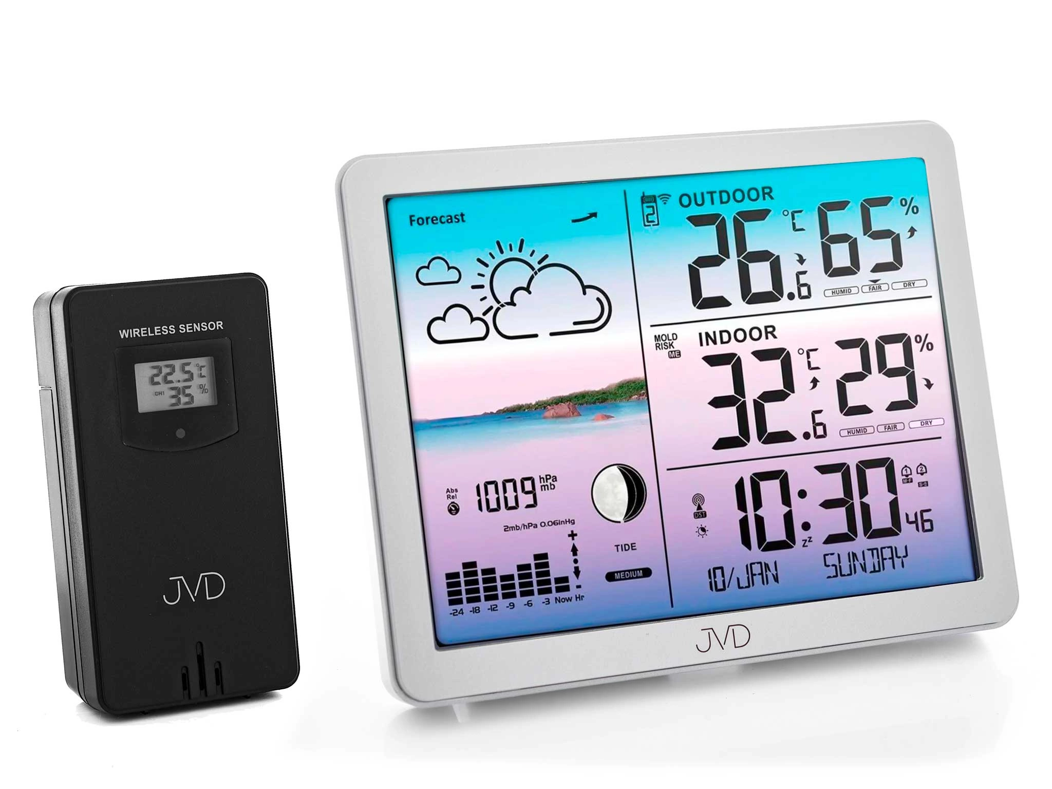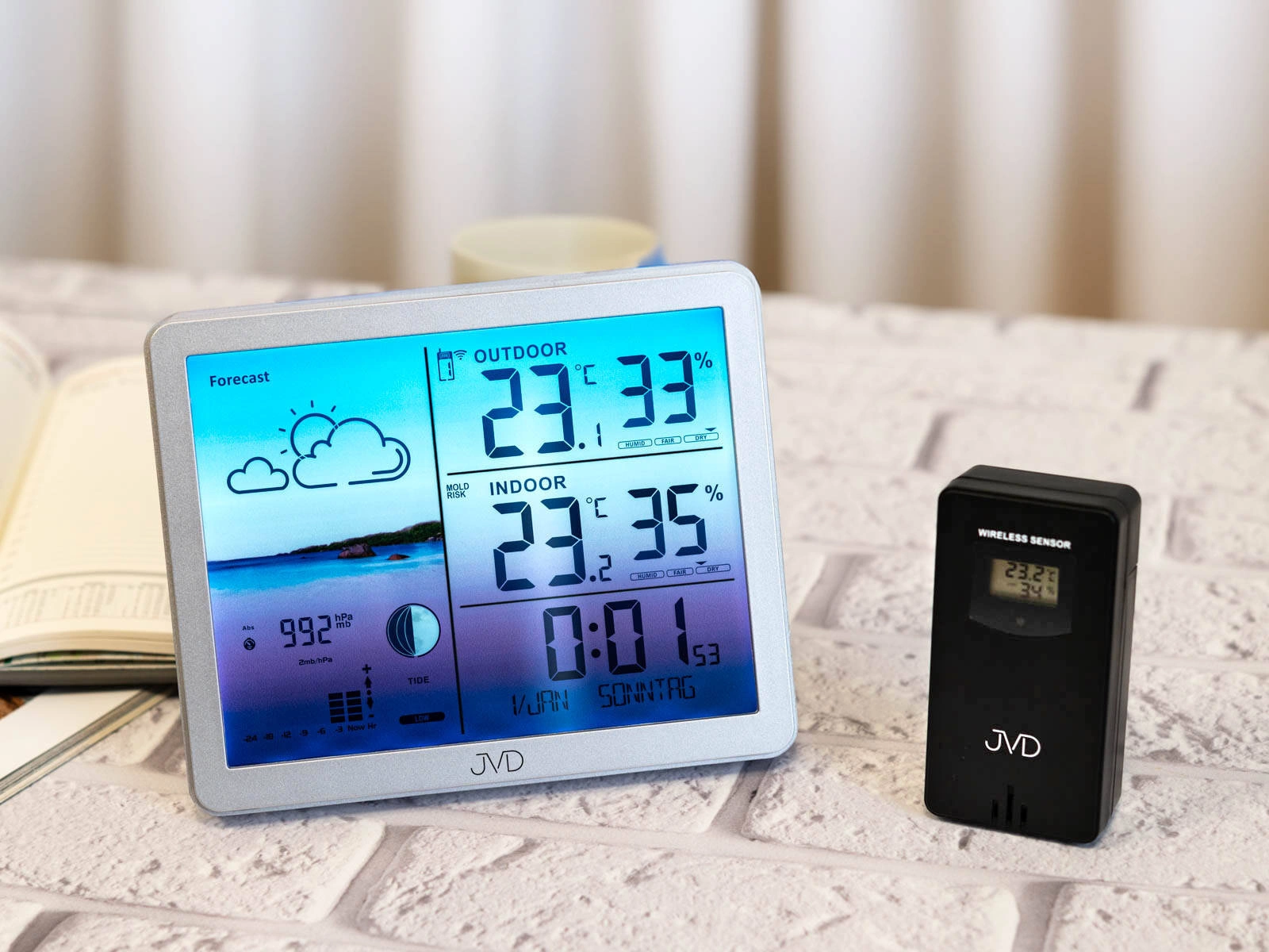 Urządzenie wyposażono w stację pogodową z bezprzewodową sondą zewnętrzną, zasilaną bateriami LR6 AA, która mierzy temperaturę w zakresie od -40°C do +70°C. Wbudowany termometr śledzi temperaturę wewnętrzną (od -9,9°C do +50°C), a higrometr mierzy wilgotność powietrza. Barometr pozwala monitorować ciśnienie atmosferyczne (600–1100 hPa) i przedstawia wykres jego zmian z ostatnich 24 godzin. Prognoza pogody jest prezentowana za pomocą intuicyjnych ikon, a funkcja ostrzeżeń przed oblodzeniem zwiększa bezpieczeństwo zimą.