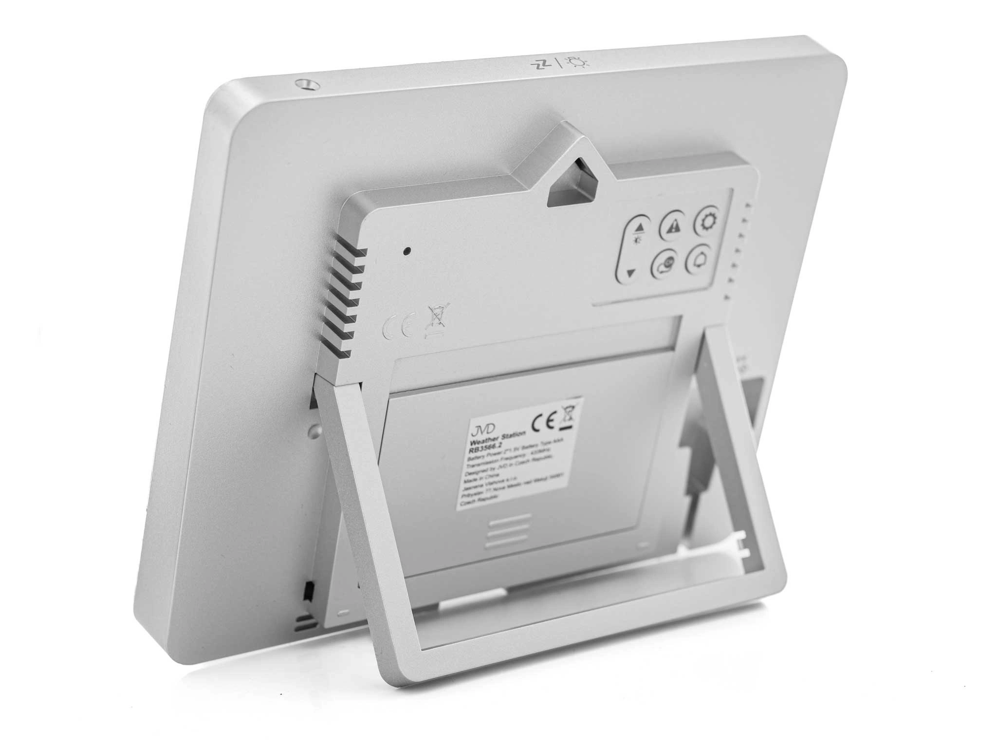 - Budzik JVD RB3566.2 - srebrny. Posiada funkcję radio control, alarm oraz stację pogody.