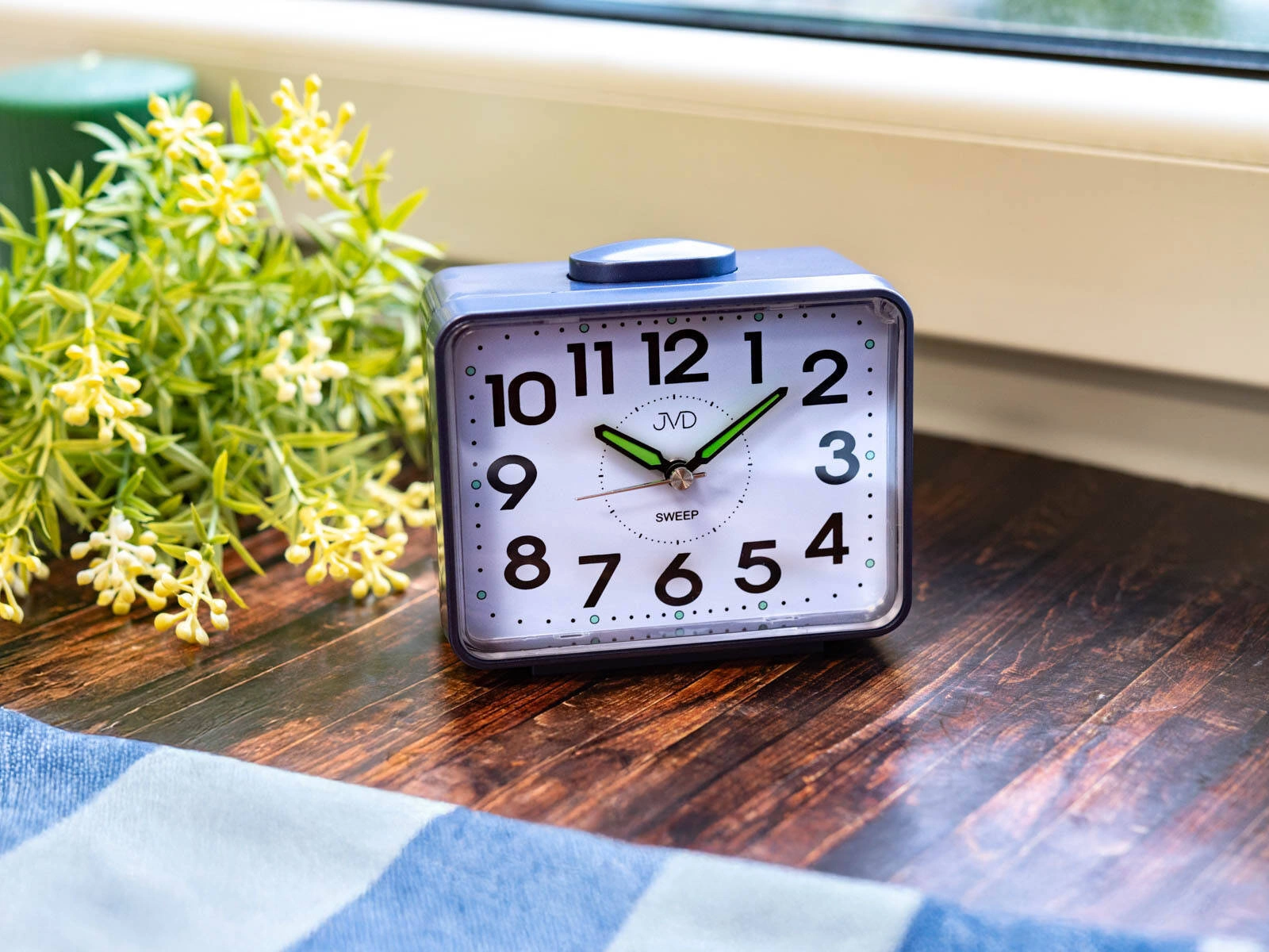 Budzik JVD SRP1101.1 to klasyczny, analogowy zegar, który łączy funkcjonalność z eleganckim i ponadczasowym designem. Doskonale sprawdzi się zarówno w domowym zaciszu, jak i w podróży, dzięki swojej kompaktowej konstrukcji. Najważniejszą funkcją budzika jest niezawodny alarm, który każdego dnia budzi użytkownika za pomocą mechanicznego sygnału dźwiękowego. Jego obsługa jest niezwykle prosta, co czyni go idealnym wyborem dla osób ceniących klasyczne rozwiązania. Jasna, biała tarcza z wyraźnymi, czarnymi cyframi arabskimi zapewnia doskonałą czytelność godziny w każdych warunkach. Odczyt czasu w ciemności ułatwiają podświetlenie uruchamiane przyciskiem oraz wskazówki pokryte fosforyzującą warstwą neobrite, które po naświetleniu świecą przez dłuższą chwilę. Budzik wyposażono w cichy i precyzyjny mechanizm kwarcowy charakteryzujący się płynną pracą sekundnika, co dodatkowo podnosi komfort użytkowania. Do zestawu dołączone są baterie, dzięki czemu urządzenie jest gotowe do użycia zaraz po zakupie.