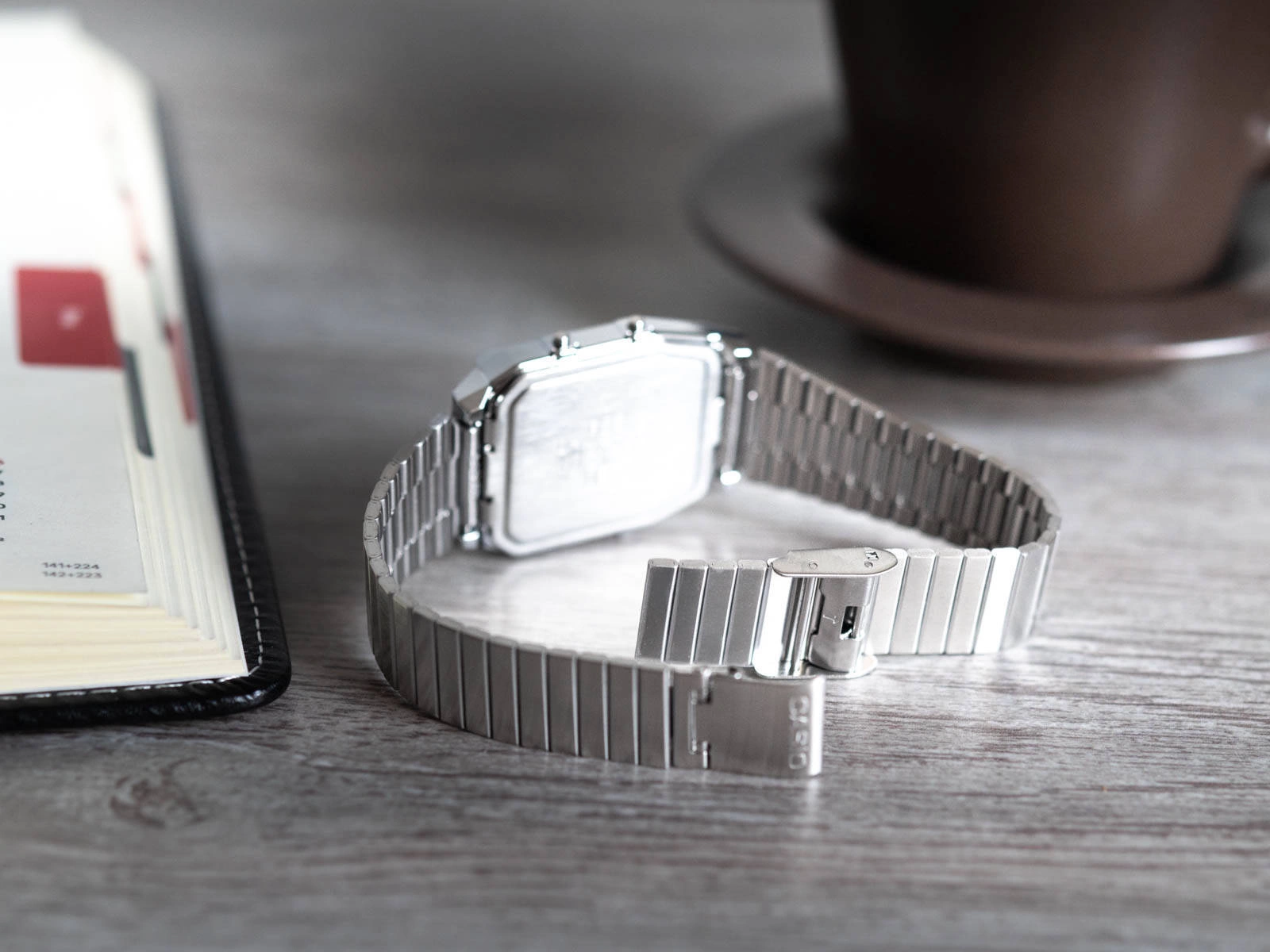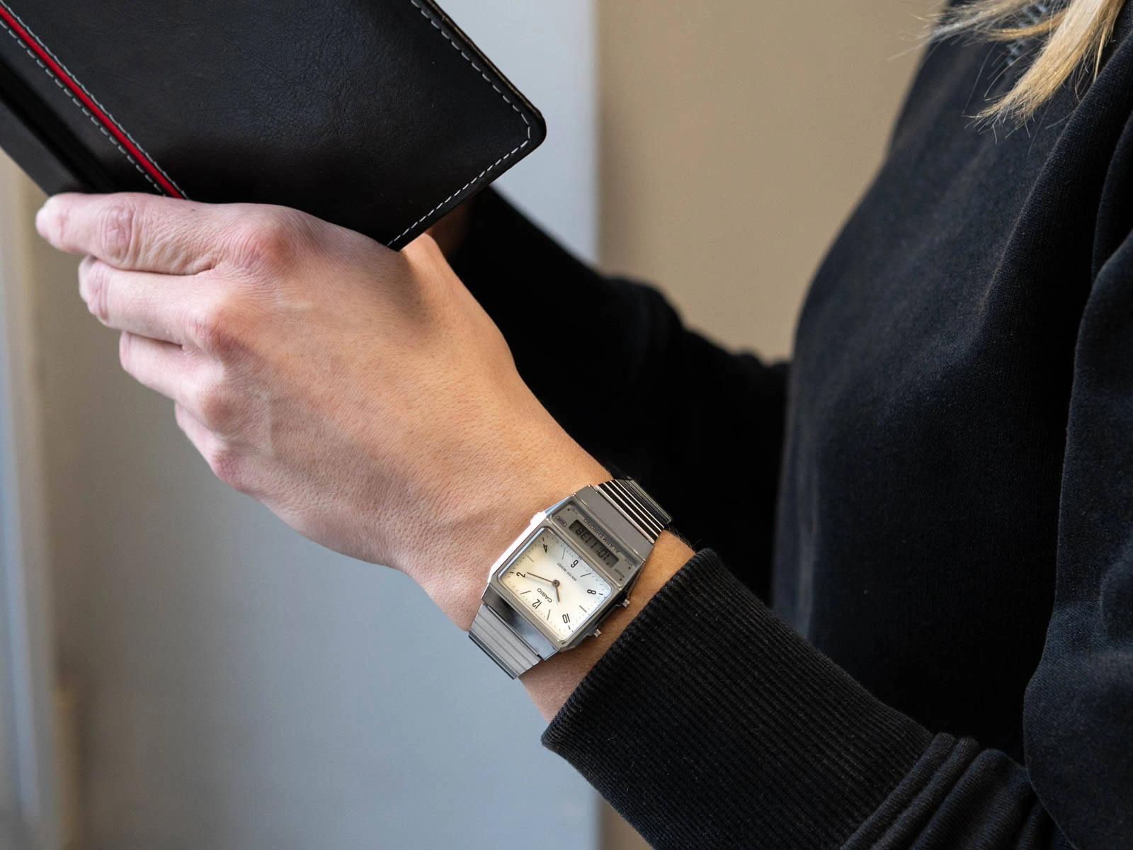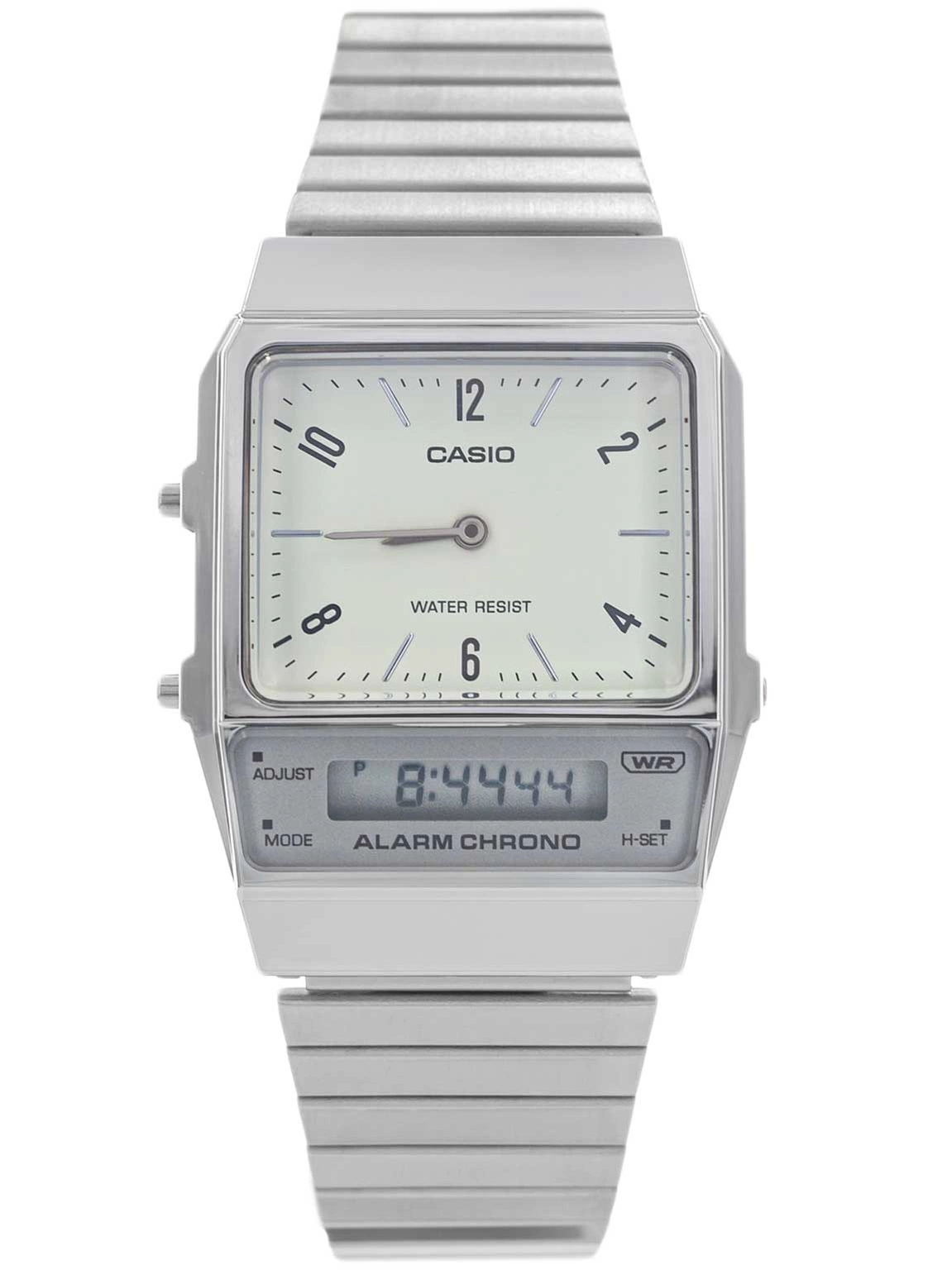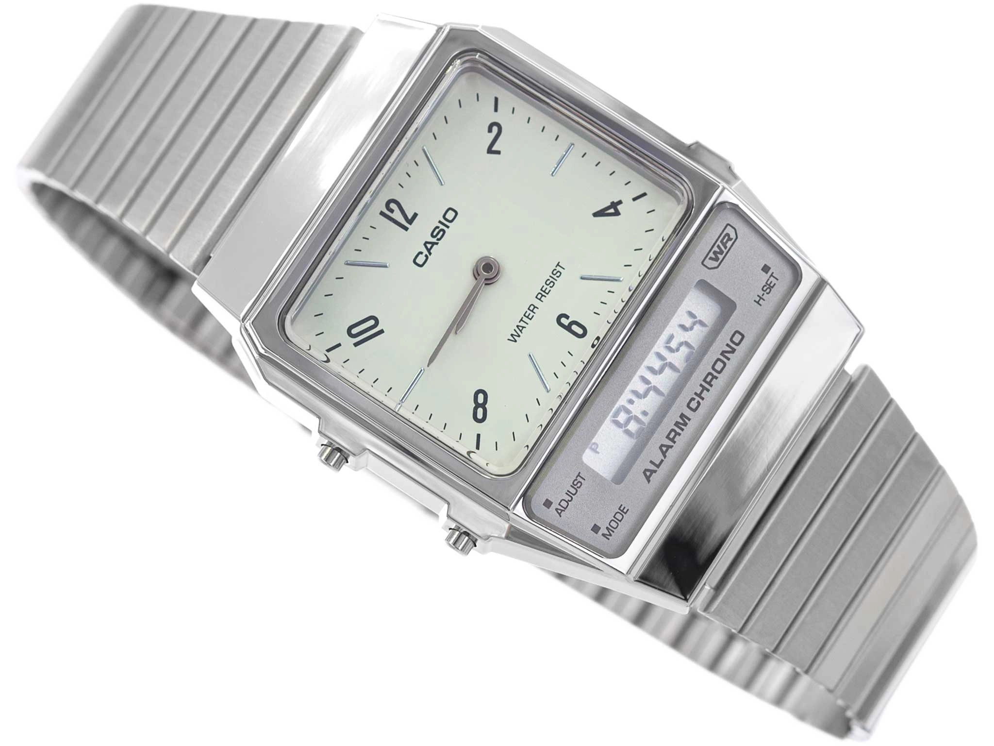 Casio AQ-800E-7A2EF to stylowy zegarek, który harmonijnie łączy klasykę z nutą nowoczesności. Inspirowany estetyką retro, ten model jest częścią kolekcji Vintage, zaprojektowanej z myślą o osobach ceniących unikalny design i ponadczasowy charakter. Jego niebanalny wygląd, podkreślony interesującym kształtem koperty i stonowaną kolorystyką, sprawia, że przyciąga spojrzenia i doskonale wpisuje się w różnorodne stylizacje.Pod analogową tarczą zaprojektowaną z dbałością o detale ukryto dyskretny wyświetlacz LCD. Dzięki niemu użytkownik ma dostęp do przydatnych funkcji, takich jak 24-godzinny format czasu, kalendarz oraz stoper. To praktyczne rozwiązanie dodaje zegarkowi wszechstronności, nie zakłócając jego klasycznej estetyki. Srebrna koperta idealnie współgra z regulowaną stalową bransoletą, która nie tylko podkreśla elegancję modelu, ale również zapewnia wysoki komfort noszenia. System przesuwnego zapięcia pozwala na łatwe dopasowanie długości bransolety do indywidualnych potrzeb. Cyferblat wyróżnia się pionowymi indeksami i prostymi wskazówkami, które gwarantują doskonałą czytelność. Lekki i ergonomiczny, Casio AQ-800E-7A2EF to idealny wybór dla tych, którzy szukają praktycznego dodatku, który jednocześnie podkreśla ich styl. To połączenie funkcjonalności, wygody i wyrafinowanego wzornictwa sprawia, że zegarek doskonale sprawdzi się zarówno na co dzień, jak i podczas wyjątkowych okazji.