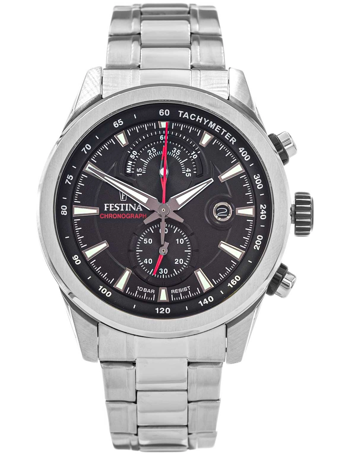 - Wodoszczelny Zegarek Męski Festina F20694/6 srebrny na bransolecie, posiada funkcję datownika, stopera analogowego i neobrite.
