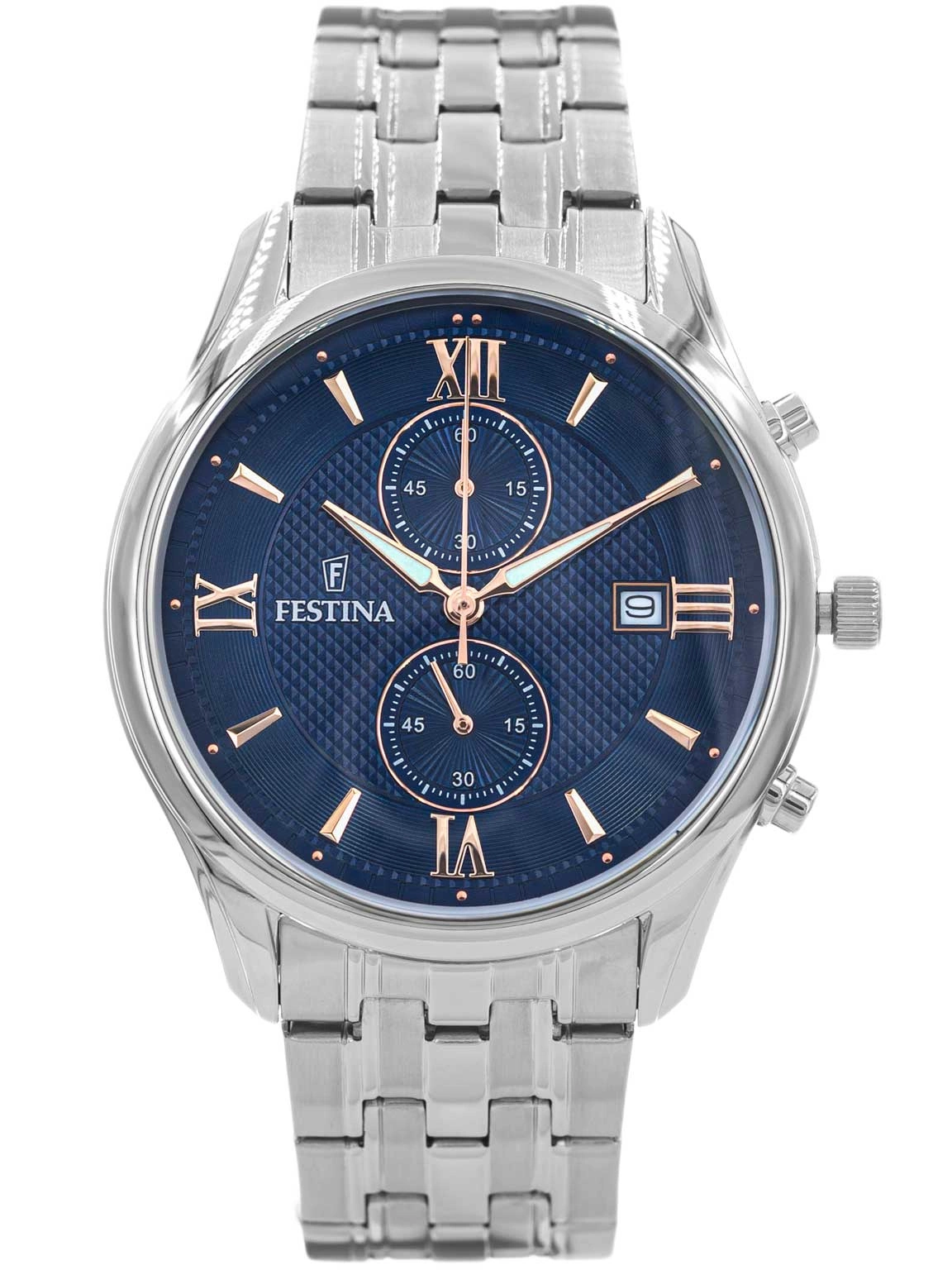 - Zegarek Męski Festina F6854/6 srebrny na bransolecie, posiada funkcję datownika, stopera analogowego i neobrite.