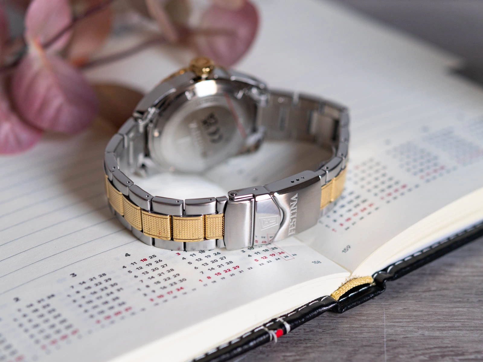FESTINA F20706/2 The Originals Diver to wyjątkowy czasomierz, który łączy w sobie niepowtarzalną stylistykę, zaawansowaną funkcjonalność i niezawodność, będąc idealnym wyborem dla osób aktywnych, w tym pasjonatów sportów wodnych. Stworzony z myślą o miłośnikach nurkowania, ale także o tych, którzy cenią sobie trwałe i eleganckie akcesoria, model ten zachwyca precyzją wykonania i estetyką, która przyciąga wzrok. Solidna koperta wykonana z wysokiej jakości stali szlachetnej jest gwarancją odporności na uszkodzenia mechaniczne, a także skutecznie chroni mechanizm zegarka. W jej wnętrzu znajduje się niezawodny mechanizm kwarcowy, zapewniający precyzyjne odmierzanie czasu przez lata użytkowania. Zegarek uzupełnia stylowa bransoleta, której srebrno-złota kolorystyka i zróżnicowana tekstura ogniw dodają całości luksusowego charakteru. Komfort użytkowania i bezpieczeństwo noszenia gwarantuje solidne zapięcie motylkowe z dodatkowym zabezpieczeniem.