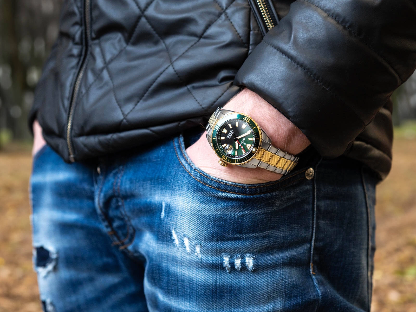 Jednym z wyróżniających się elementów tego modelu jest obrotowy bezel w kontrastującej złoto-zielonej kolorystyce, zaprojektowany z myślą o nurkach. Jednokierunkowy obrót w lewo pozwala na precyzyjne odmierzanie czasu zanurzenia, a fosforyzujący znacznik na bezelu oraz wskazówki i indeksy, pokryte powłoką neobrite, zapewniają doskonałą czytelność nawet w słabym oświetleniu. Zielono-czarna tarcza zegarka harmonijnie współgra ze złoto-białymi indeksami, tworząc elegancki, a zarazem wyrazisty design. Na wysokości godziny trzeciej umieszczono datownik z soczewką powiększającą, która ułatwia odczytanie aktualnej daty. Tarcza chroniona jest przez wyjątkowo odporne na zarysowania szkło szafirowe, które pozwala zachować jej nieskazitelny wygląd przez długi czas. Zegarek charakteryzuje się wodoszczelnością na poziomie 20 ATM, co sprawia, że doskonale sprawdzi się podczas pływania, snorkelingu czy głębszego nurkowania. Dodatkowe zabezpieczenia, takie jak zakręcana koronka i dekiel, zwiększają ochronę przed wnikaniem wody, czyniąc go niezawodnym w najbardziej wymagających warunkach.