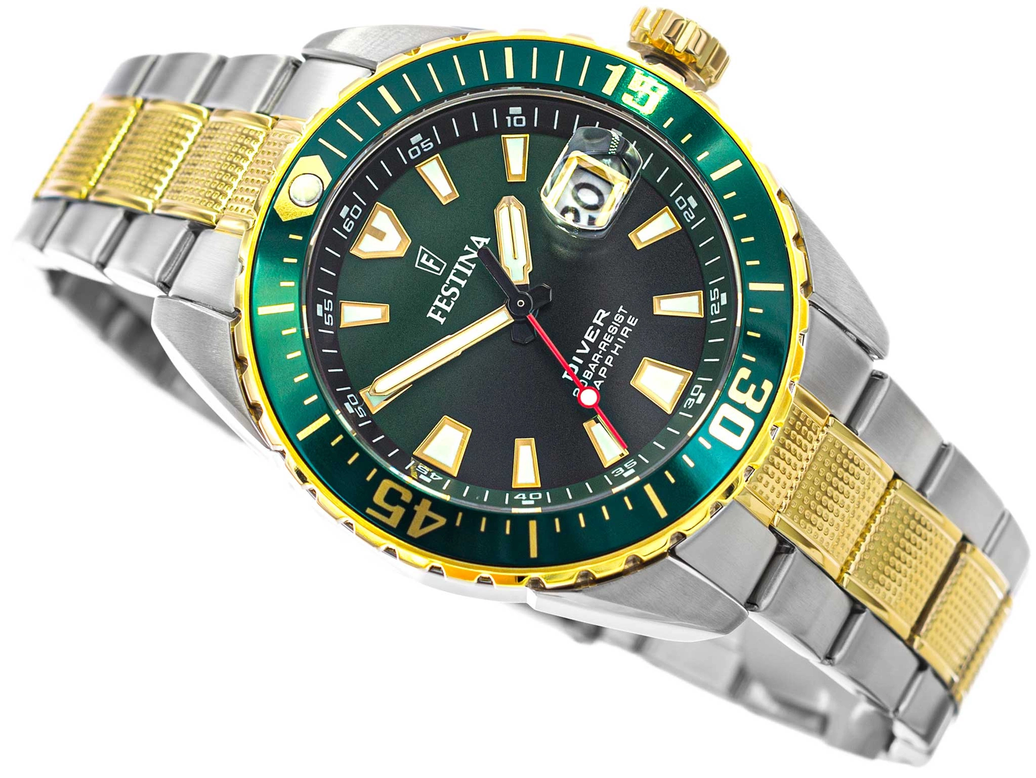 - Wodoszczelny Zegarek Męski Festina F20706/2 The Originals Diver srebrno-złoty na bransolecie, posiada funkcję datownika i neobrite.