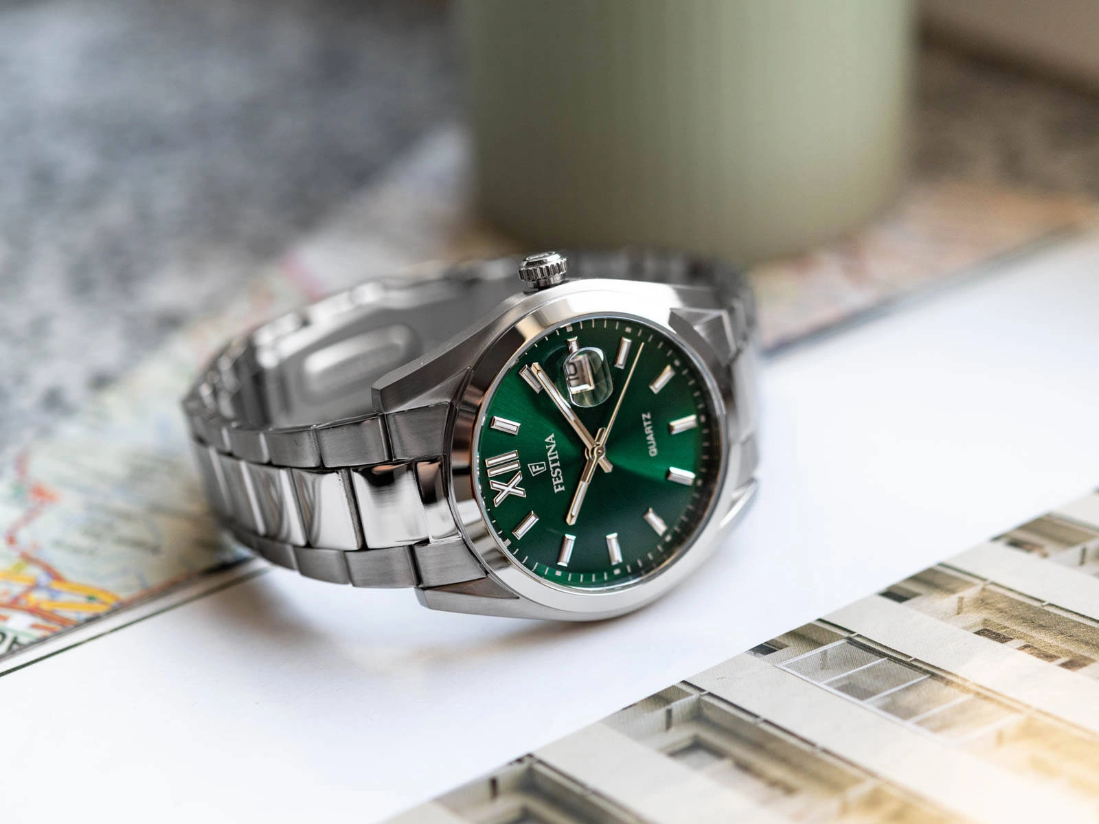 Tarcza w głębokim, zielonym odcieniu stanowi wyjątkowy akcent estetyczny, przyciągając uwagę swoim kontrastowym zestawieniem z wyraźnymi srebrno-białymi indeksami i wskazówkami. Wysoka czytelność zegarka została dodatkowo wzmocniona dzięki zastosowaniu powłoki neobrite, która po naświetleniu emituje subtelne światło, umożliwiając szybkie odczytanie godziny w ciemności. Szczególną uwagę zwraca rzymska cyfra oznaczająca godzinę dwunastą, podczas gdy pozostałe godziny zostały oznaczone liniowymi indeksami, które dodają tarczy lekkości i nowoczesności. Praktycznym dodatkiem jest datownik, który wskazuje dzień miesiąca, a umieszczona nad nim soczewka powiększająca ułatwia odczyt daty. Całość chroni wytrzymałe szkło mineralne, odporne na zarysowania, co zapewnia estetyczny wygląd i trwałość przez długie lata użytkowania. Smukły profil koperty sprawia, że zegarek doskonale układa się na nadgarstku i z łatwością mieści się pod mankietem koszuli, co czyni go idealnym wyborem do eleganckich, formalnych stylizacji.