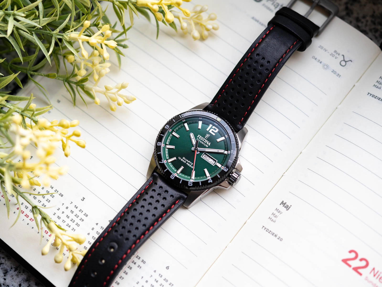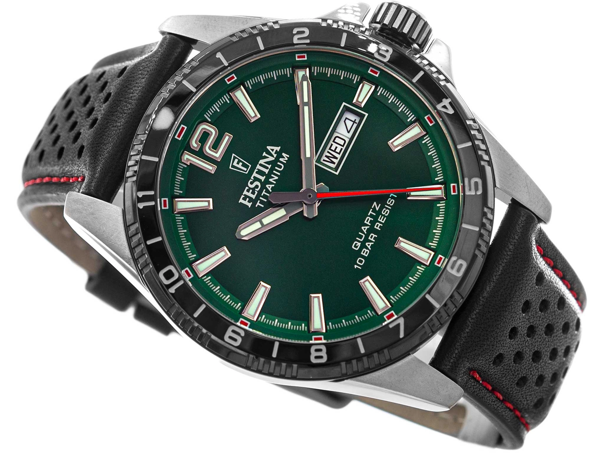 Model Festina F20699/3 Titanium Date to czasomierz zaprojektowany z myślą o aktywnych mężczyznach, którzy poszukują stylowego i niezawodnego dodatku do codziennych oraz sportowych stylizacji. Koperta wykonana z wytrzymałego i ultralekkiego tytanu wyróżnia się srebrnym wykończeniem, które perfekcyjnie współgra z kontrastującym czarnym bezelem. Dopełnieniem konstrukcji jest czarny pasek ze skóry naturalnej, ozdobiony subtelnymi czerwonymi przeszyciami. Pasek został zaprojektowany z myślą o komforcie użytkowania, dlatego zastosowano zapięcie na klasyczną sprzączkę umożliwiającą precyzyjne dopasowanie do nadgarstka. Tarcza zegarka w kolorze głębokiej zieleni przyciąga uwagę swoją nowoczesną estetyką. Na jej powierzchni znajdują się precyzyjnie wykonane srebrne indeksy oraz wskazówki, pokryte warstwą neobrite, dzięki której są doskonale widoczne w ciemności po wcześniejszym naświetleniu. Godzina 12 została oznaczona cyframi arabskimi, co dodaje tarczy elegancji, natomiast resztę godzin oznaczono minimalistycznymi liniami, podkreślającymi współczesny charakter zegarka. Na godzinie 3 znajduje się funkcjonalny datownik wskazujący zarówno dzień miesiąca, jak i nazwę dnia tygodnia – rozwiązanie, które docenią osoby żyjące w szybkim tempie. Całość chroniona jest przez odporne na zarysowania mineralne szkiełko, które utrzymuje tarczę w nienagannym stanie przez wiele lat użytkowania.