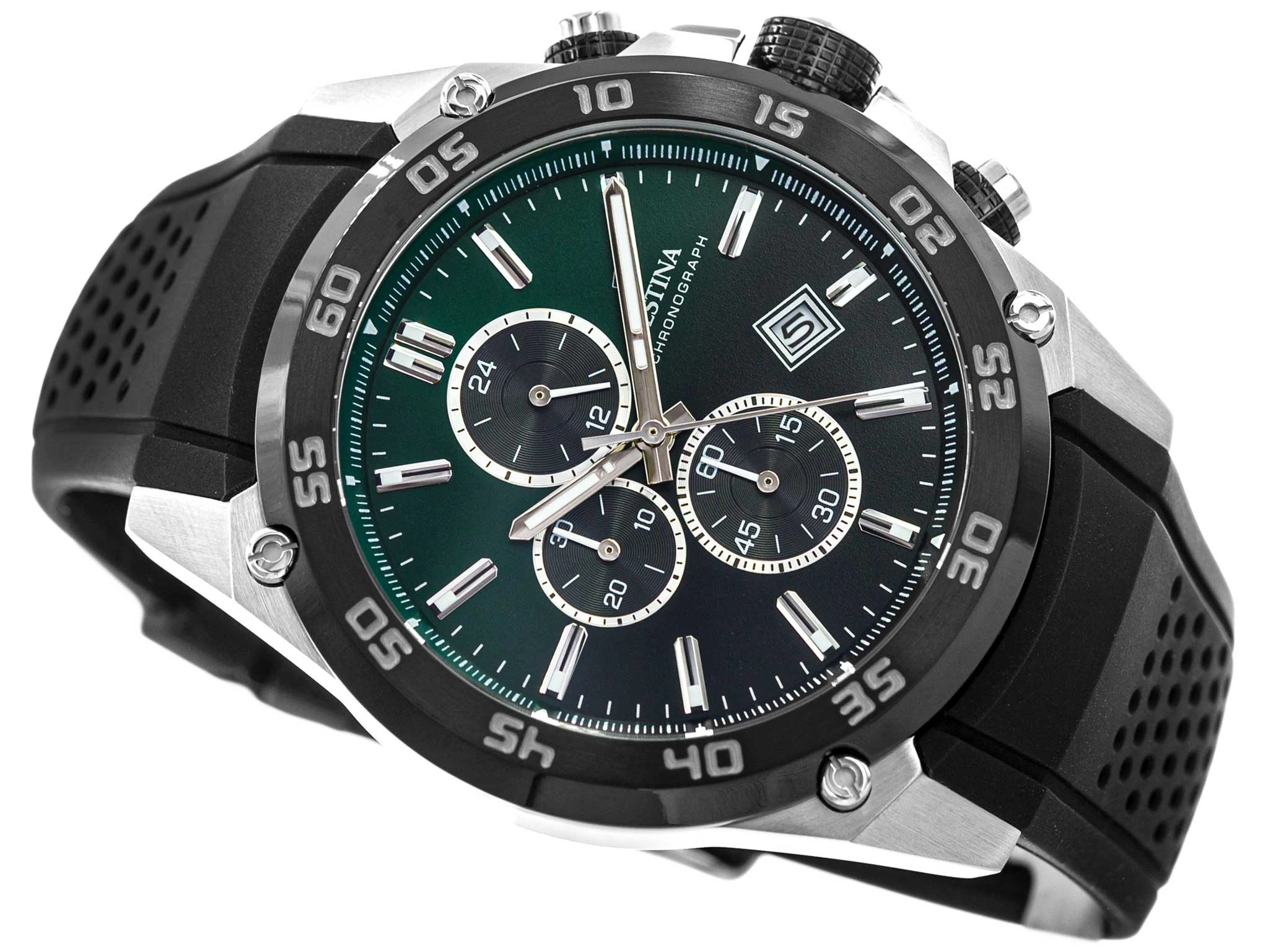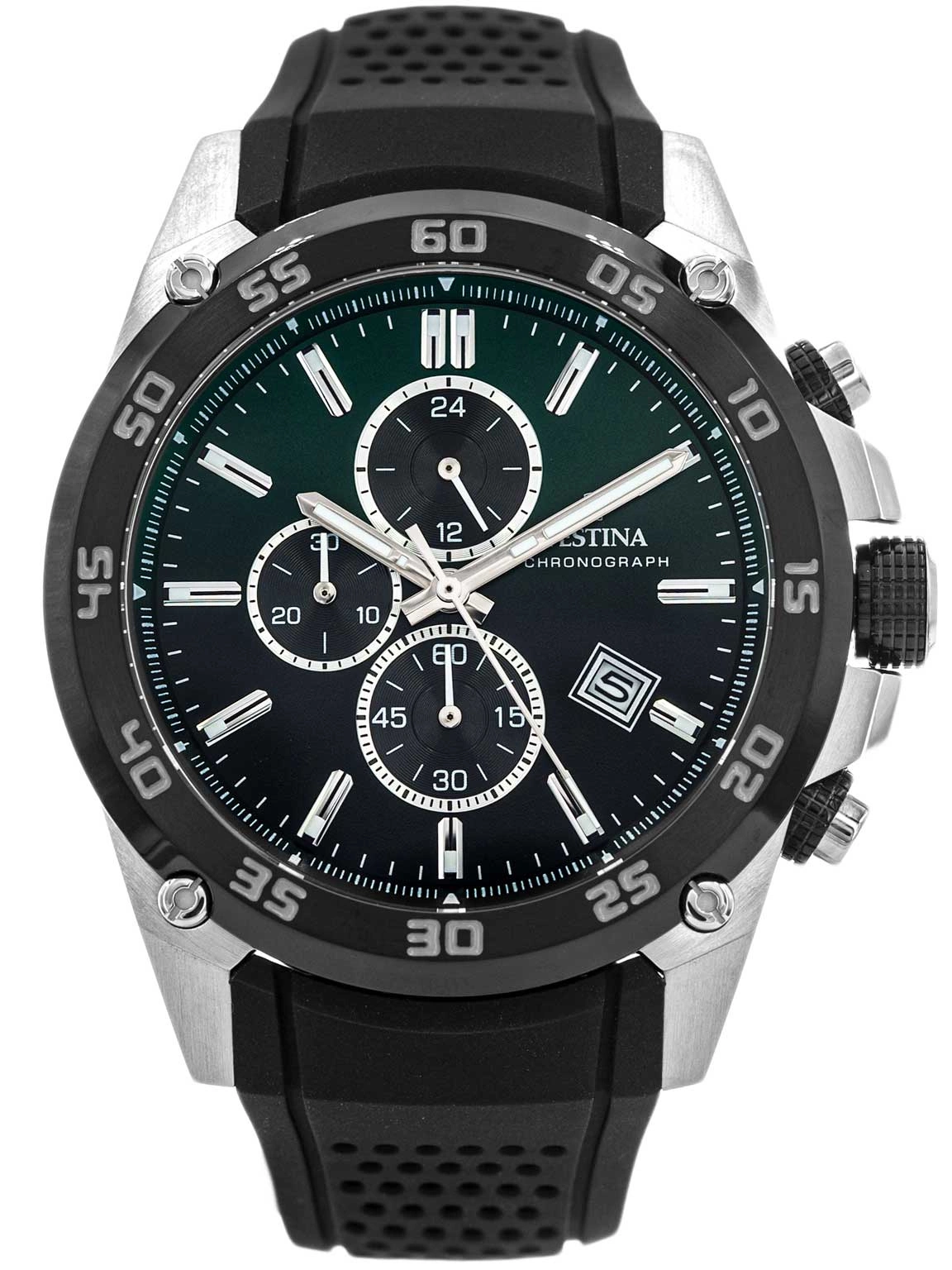 Model Festina F20330/B z serii The Originals to idealne połączenie sportowego stylu i nowoczesnych funkcji, stworzone z myślą o mężczyznach ceniących nowoczesny design i wysoką jakość wykonania. Masywna koperta zegarka w srebrnym kolorze, wykonana z wysokiej jakości stali szlachetnej, zachwyca solidnością i estetyką. Koperta została zawieszona na elastycznym pasku z tworzywa sztucznego. Pasek wyposażony w klasyczną sprzączkę zapewnia wygodę noszenia i bezpieczne dopasowanie do nadgarstka. Tarcza zegarka, utrzymana w zielono-czarnej, przyciąga uwagę swoim wyrafinowanym designem. Elegancko kontrastujące wskazówki oraz indeksy w kolorze srebra tworzą harmonijną całość, idealnie wpisującą się w koncepcję nowoczesnej elegancji. Godziny zostały wyznaczone przez zgrabne indeksy liniowe. Wskazówki i indeksy zegarka zostały pokryte fosforyzującą powłoką neobrite, która po wcześniejszym naświetleniu pozwala na łatwe odczytanie czasu nawet przy słabym oświetleniu.