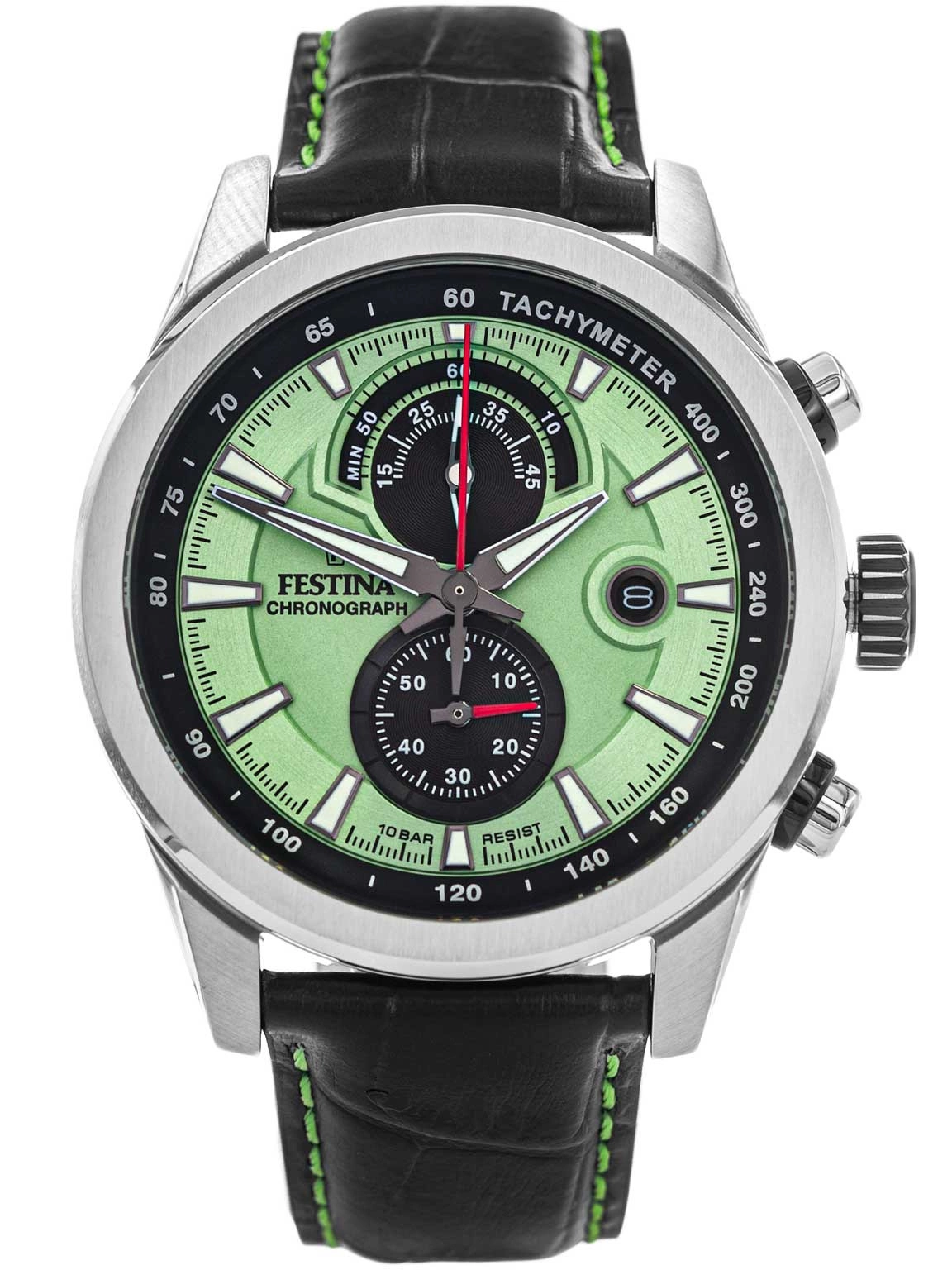 Festina Timeless Chronograph F20695/3 to wyrafinowany męski zegarek, który łączy w sobie ponadczasowy styl z zaawansowaną funkcjonalnością. Zaprojektowany z myślą o współczesnych mężczyznach, dla których liczą się zarówno estetyka, jak i praktyczność, ten model doskonale sprawdza się w codziennych sytuacjach, jak i podczas bardziej formalnych okazji. Koperta zegarka, wykonana z wysokiej jakości stali szlachetnej w kolorze srebrnym, jest nie tylko trwała, ale także elegancka i odporna na działanie czynników zewnętrznych. Całość uzupełnia czarny skórzany pasek, który zapewnia komfort noszenia oraz doskonałe dopasowanie do nadgarstka. Głównym atutem wizualnym jest zielona tarcza o subtelnie połyskującym wykończeniu, która stanowi intrygujący i nowoczesny akcent. Srebrne wskazówki i indeksy godzinowe, pokryte fosforyzującą powłoką neobrite, umożliwiają łatwy odczyt czasu zarówno w świetle dziennym, jak i po zmroku.