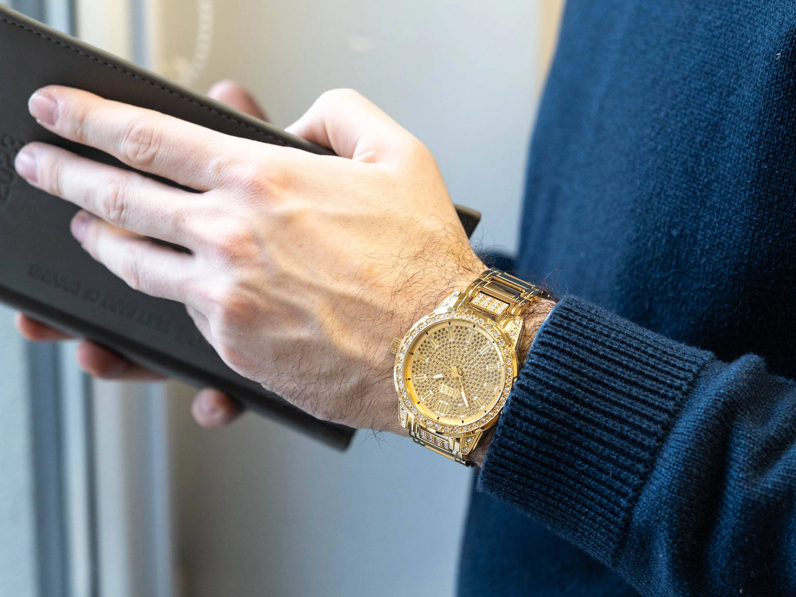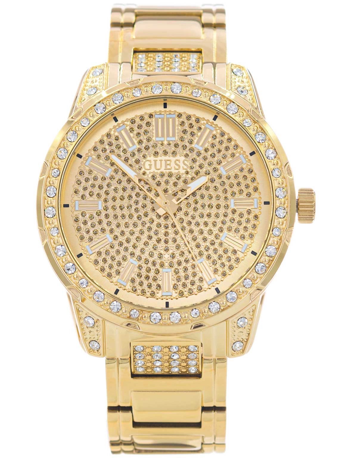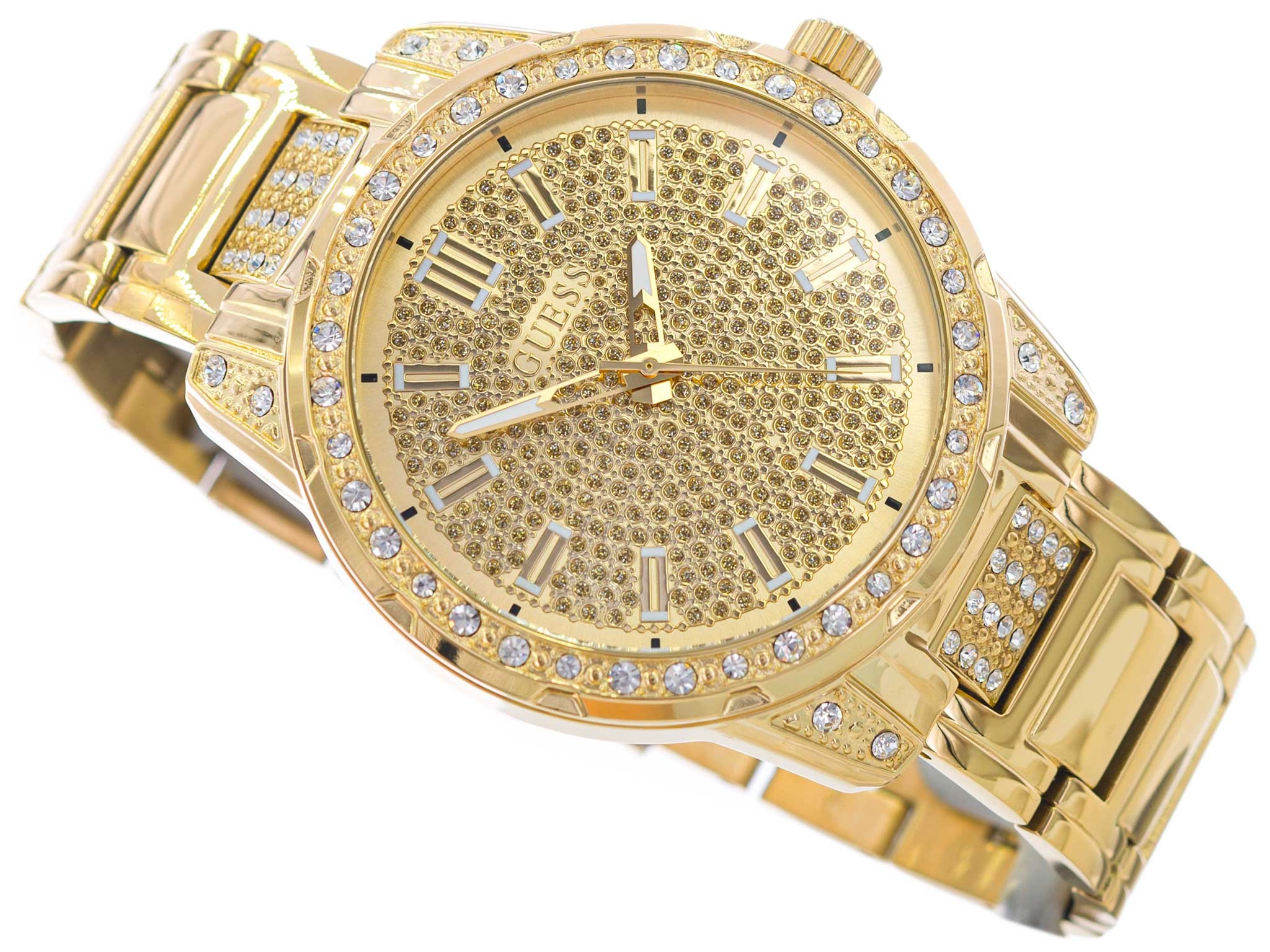 Guess U1339G2 to elegancki zegarek analogowy, który przyciąga uwagę swoją bogato zdobioną konstrukcją i dbałością o detale. Wykonana z wysokogatunkowej stali szlachetnej koperta mieści precyzyjny, japoński mechanizm kwarcowy, zasilany wymienną baterią, co gwarantuje niezawodne działanie na co dzień. Zarówno koperta, jak i bezel zostały ozdobione lśniącymi kryształkami, które dodają zegarkowi wyrafinowanego charakteru. Model ten uzupełnia solidna, stalowa bransoleta o idealnie dopasowanej kolorystyce, która zapewnia komfort użytkowania i została wyposażona w praktyczne, a zarazem eleganckie zapięcie motylkowe. Wyjątkowym elementem zegarka jest tarcza w odcieniu złota, udekorowana subtelnym logo marki oraz delikatnym brokatowym wzorem, który pięknie mieni się w świetle. Liniowe indeksy w odcieniach złota i bieli idealnie komponują się z tarczą, a wskazówki z fosforyzującymi elementami neobrite gwarantują czytelność w ciemności po wcześniejszym naświetleniu. Guess U1339G2 to kwintesencja luksusu i klasy, która doskonale uzupełni zarówno eleganckie, jak i codzienne stylizacje. Zegarek jest dostarczany w oryginalnym, eleganckim opakowaniu sygnowanym logo producenta, co czyni go również idealnym wyborem na prezent dla bliskiej osoby.