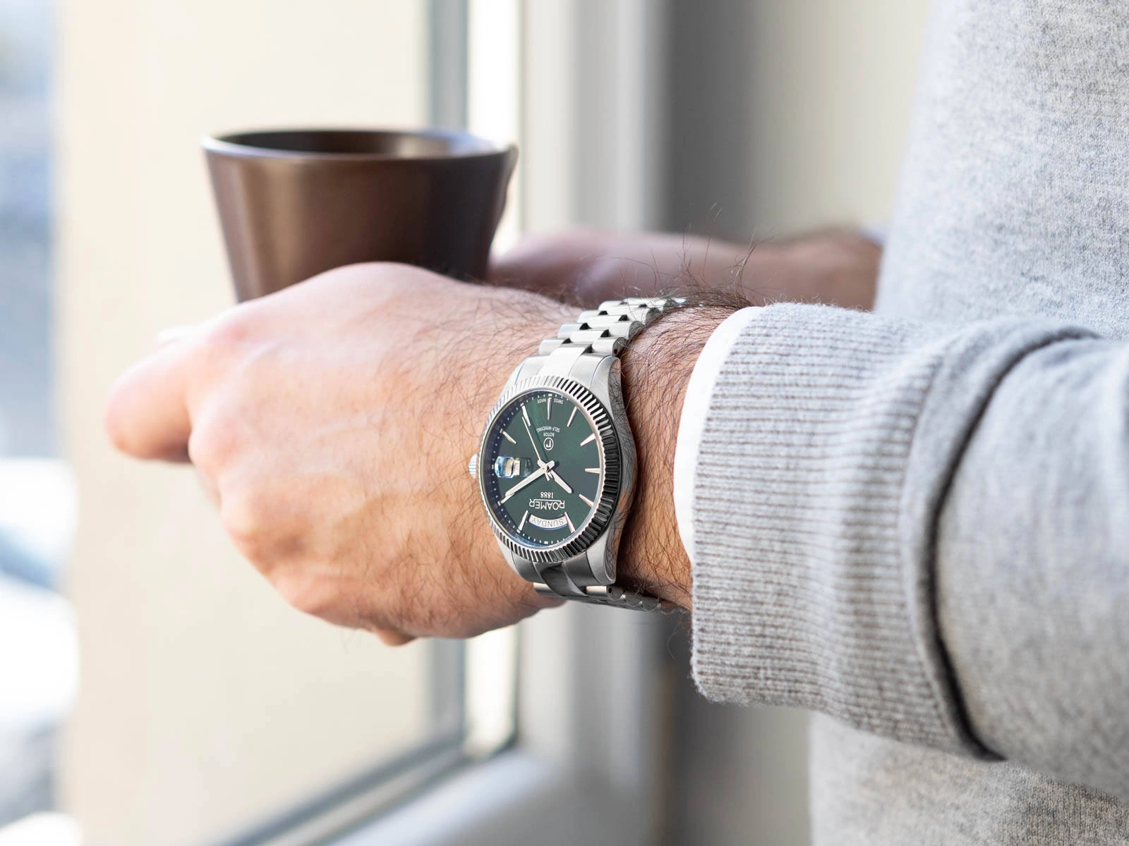Zegarek Roamer 981662 41 75 90 Primeline Daydate to wysokiej klasy czasomierz, który zachwyca zarówno funkcjonalnością, jak i estetyką. Jego sercem jest automatyczny mechanizm sygnowany prestiżowym oznaczeniem "Swiss Made". Mechanizm ten czerpie energię z ruchu ręki, z możliwością ręcznego dokręcania poprzez obracanie koronki w prawo. Co więcej, pracę mechanizmu można podziwiać dzięki przeszklonemu dekielkowi. Model został wyposażony w datownik, wskazujący aktualny dzień miesiąca oraz tygodnia. Tarcza w kolorze butelkowej zieleni jest chroniona przez szafirowe szkło. Dodatkowo zegarek posiada fosforyzowane wskazówki, które po naświetleniu pozostają widoczne w ciemności przez pewien czas. Połączenie praktycznych funkcji z ponadczasową kolorystyką sprawia, że zegarek stanowi doskonałe uzupełnienie stylizacji. Całość dopełnia eleganckie, firmowe pudełko, idealne jako opakowanie na prezent.