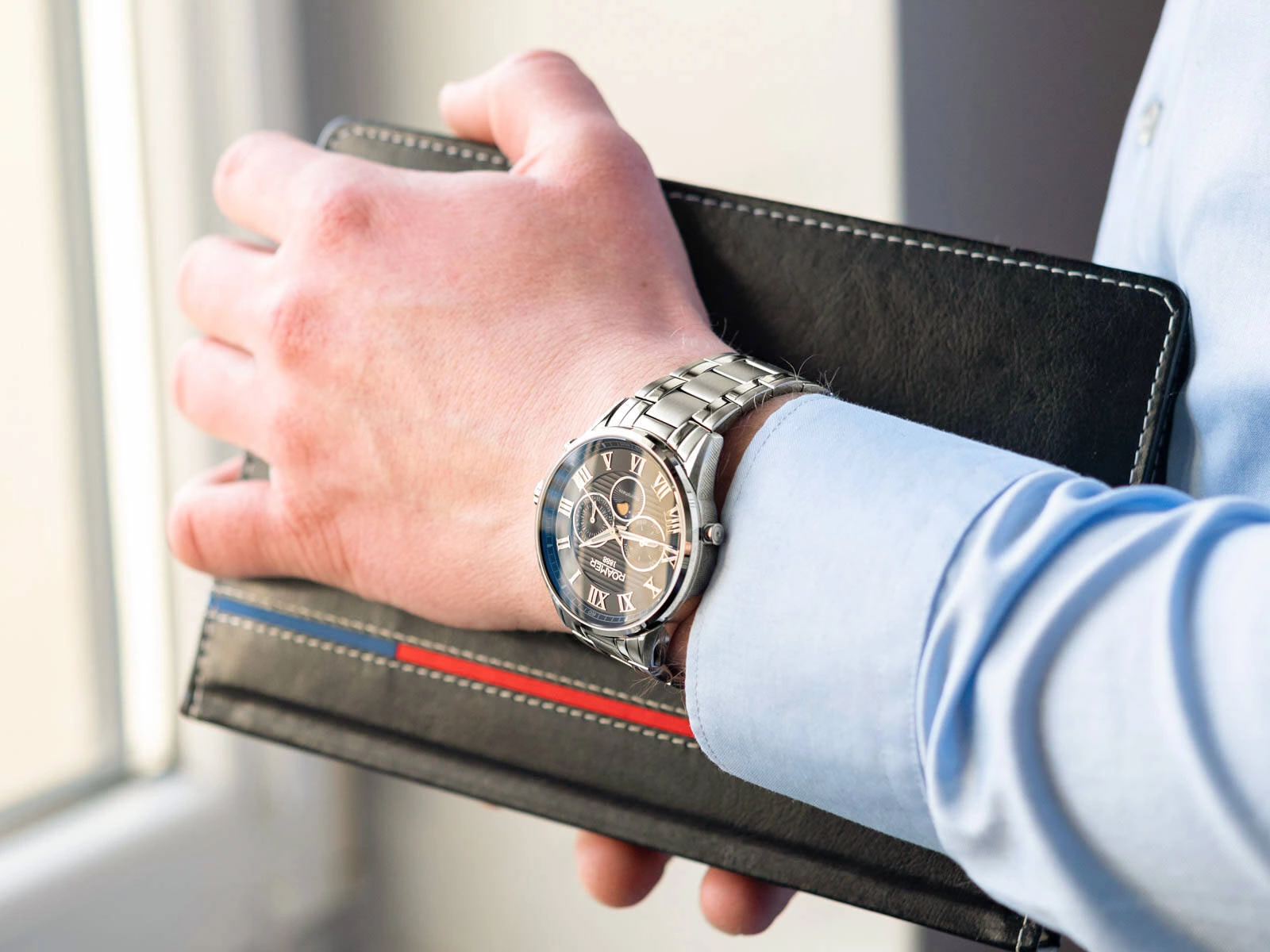 Ponadto model oferuje rozbudowany datownik wskazujący dzień tygodnia i miesiąca oraz elegancki wskaźnik faz księżyca umieszczony przy godzinie 6. Dzięki starannie dobranym europejskim komponentom oraz ponadczasowemu wzornictwu, zegarek ten łączy praktyczność z wyjątkowym stylem. Do zestawu dołączone jest stylowe, firmowe pudełko, które doskonale nadaje się na prezent. Roamer Superior Moonphase to doskonały wybór dla osób ceniących wyrafinowane dodatki i funkcjonalność w jednym.