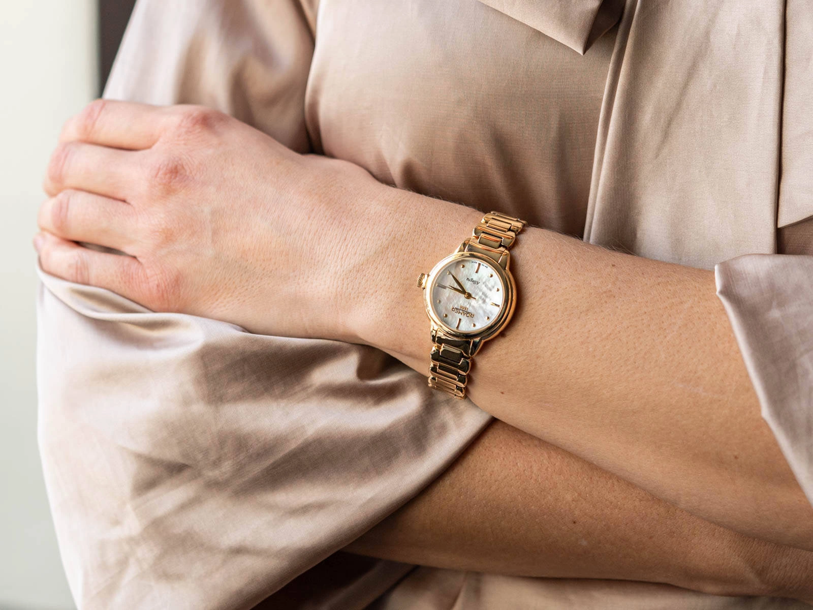 Roamer Allegra 977847 48 20 20 to wyjątkowy damski zegarek, który emanuje luksusem i wyrafinowaniem. W całości utrzymany w złotej kolorystyce, ten elegancki model stanowi idealne połączenie klasycznego designu z nowoczesnymi akcentami. Zegarek pochodzi z renomowanej kolekcji Roamer Allegra, cenionej za wysoką jakość wykonania, estetykę i niezawodność. Koperta o średnicy wykonana z wysokiej jakości stali szlachetnej w kolorze złotym, przyciąga wzrok swoim subtelnym połyskiem i harmonijnymi proporcjami. Biała tarcza, wykonana z masy perłowej, dodaje lekkości i elegancji, stanowiąc idealne tło dla złotych indeksów i precyzyjnych wskazówek. Całość chroni szkło szafirowe, odporne na zarysowania, co sprawia, że zegarek zachowuje swój piękny wygląd przez lata. Model Roamer Allegra 977847 48 20 20 działa w oparciu o precyzyjny mechanizm kwarcowy, zasilany wymienną baterią. To gwarancja niezawodności i wygody użytkowania, dzięki czemu zegarek sprawdzi się zarówno na co dzień, jak i podczas wyjątkowych okazji. Bransoleta w pełni złotej kolorystyce, również wykonana ze stali szlachetnej, idealnie dopełnia luksusowy charakter czasomierza. Wyposażona w praktyczne i bezpieczne zapięcie motylkowe, zapewnia komfort noszenia oraz pewne dopasowanie do nadgarstka. Roamer Allegra 977847 48 20 20 to coś więcej niż zegarek – to biżuteryjny dodatek, który podkreśla elegancję i indywidualny styl każdej kobiety. Zapakowany w oryginalne pudełko marki Roamer, jest doskonałym pomysłem na prezent dla osoby ceniącej szyk, precyzję i wyjątkowy design.