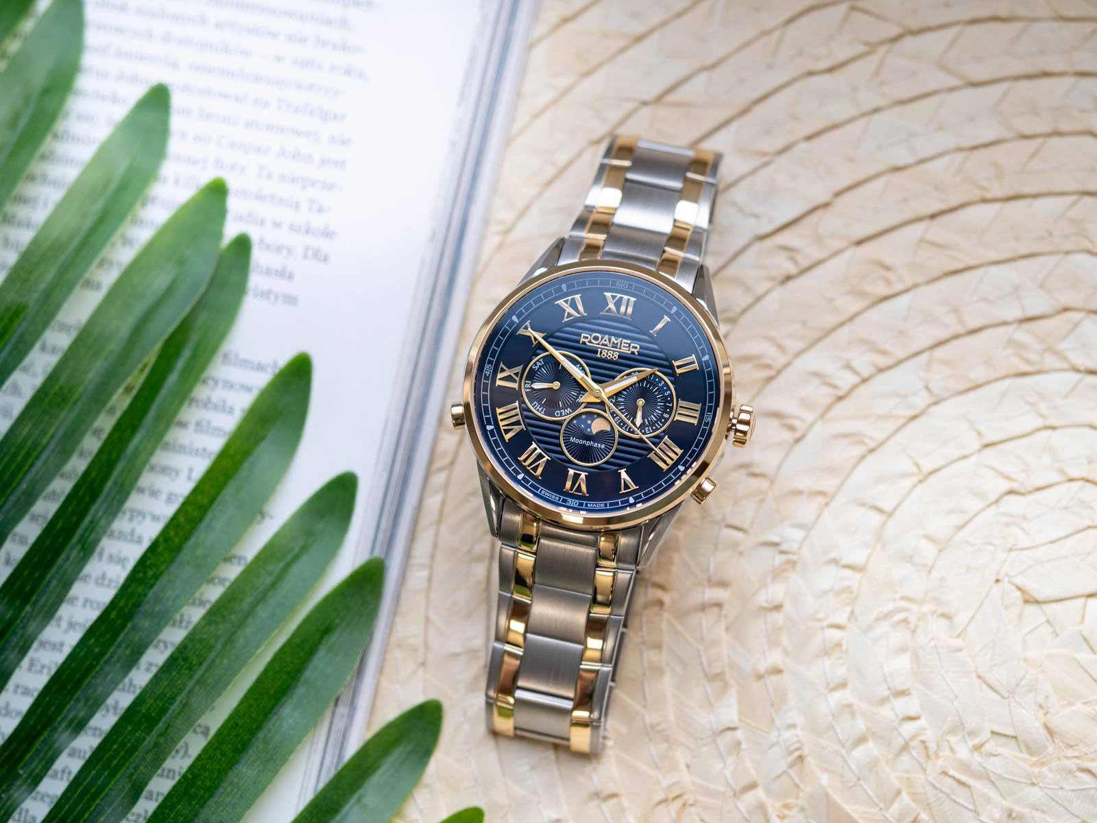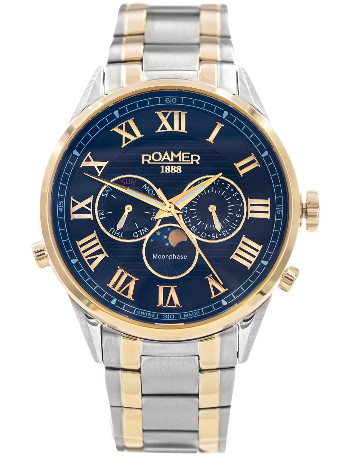 - Zegarek Męski Roamer 513821 47 45 50 srebrno-złoty na bransolecie. Posiada funkcje datownika, wskaźnika faz księzyca oraz neobrite.