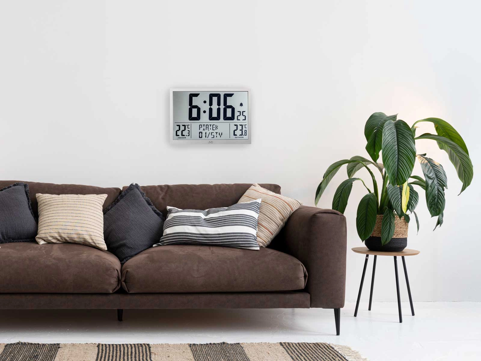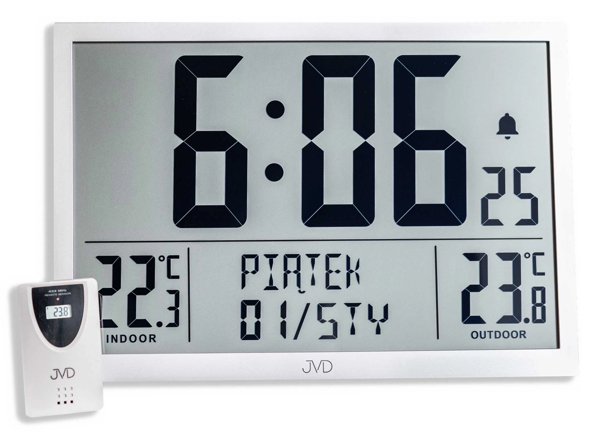 Model JVD RB9412.2 to wszechstronny zegar, łączący w sobie funkcje budzika, kalendarza i termometru. Czytelny cyfrowy wyświetlacz prezentuje najważniejsze informacje w przejżysty umożliwiając szybki dostęp do aktualnego czasu, daty, dnia tygodnia oraz danych pogodowych. Urządzenie pozwala na wybór formatu wyświetlania czasu w systemie 12- lub 24-godzinnym, a szczegółowy datownik wyświetla nazwę dnia tygodnia w jednym z dziesięciu dostępnych języków, w tym po polsku. Budzik oferuje możliwość ustawienia alarmu z dźwiękiem trwającym 1 lub 2 minuty, co pozwala na dostosowanie go do indywidualnych preferencji. Kluczowym atutem modelu JVD RB9412.2 jest precyzyjne wskazywanie czasu dzięki funkcji Radio Control - radiowej synchronizacji z czasem atomowym, co zapewnia maksymalną dokładność.