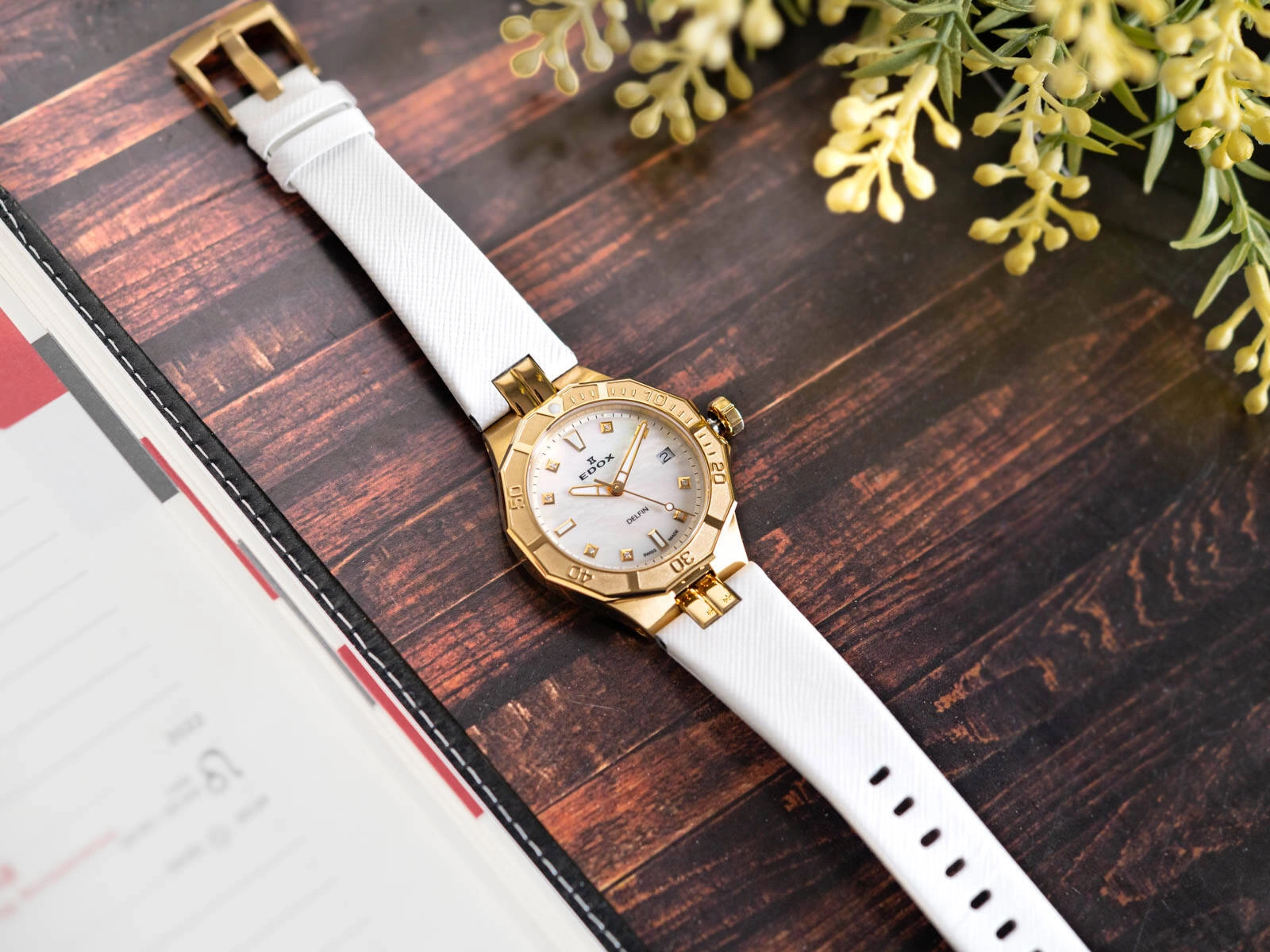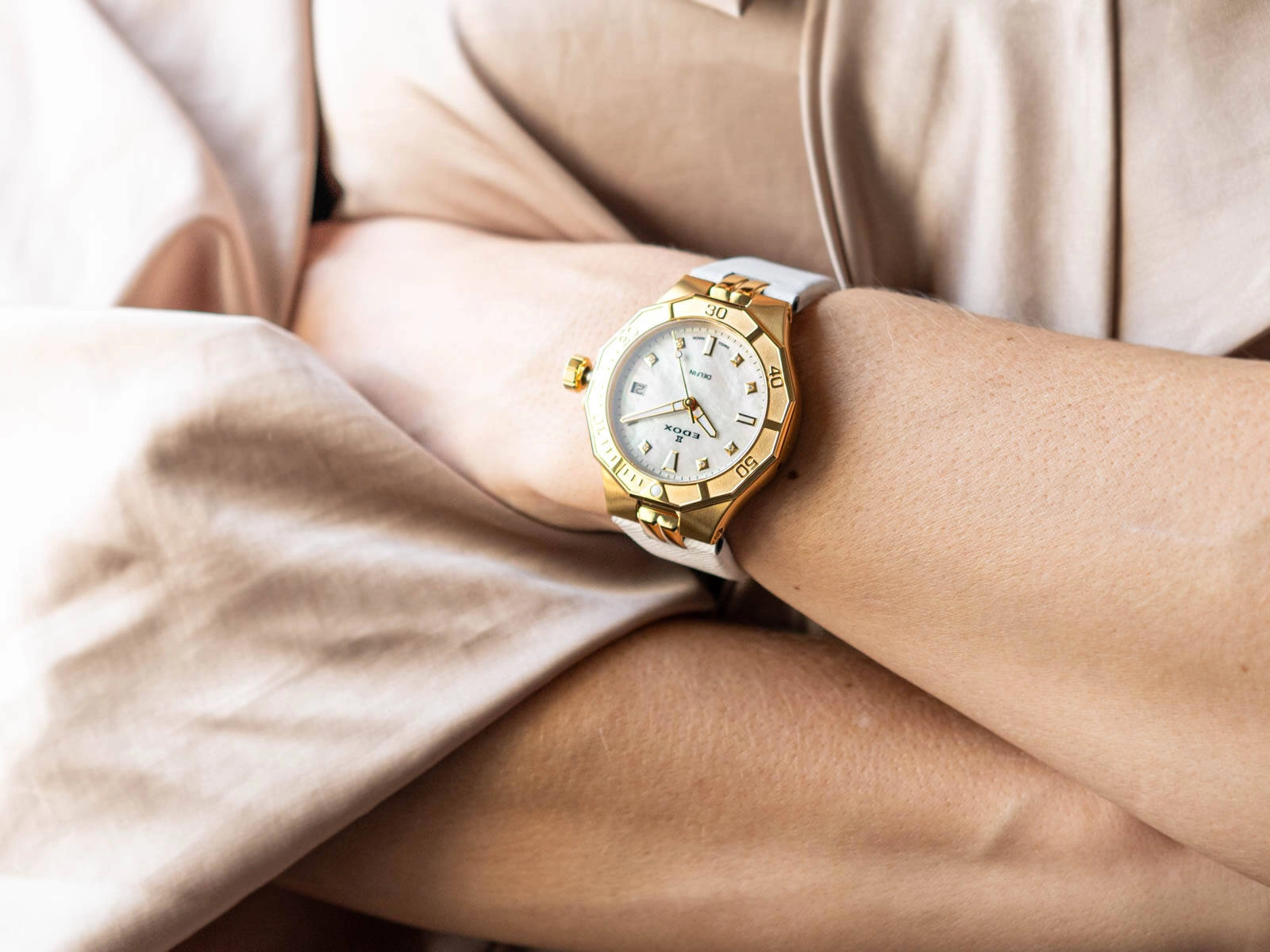 Edox 53020 37JC NADD The Original Diver Date Lady to elegancki damski zegarek typu diver, który harmonijnie łączy szwajcarską precyzję, nowoczesne technologie i luksusowy design. Stworzony dla kobiet, które cenią sobie zarówno niezawodność, jak i wyrafinowany styl, zegarek doskonale sprawdza się w codziennym użytkowaniu oraz w ekstremalnych warunkach. Solidna koperta, wykonana z wysokiej jakości stali szlachetnej w złotym kolorze, zapewnia wyjątkową trwałość i odporność na czynniki zewnętrzne, a biały skórzany pasek z klasyczną sprzączką dodaje całości subtelności i wyrafinowania. Połączenie bieli i złota nadaje zegarkowi ponadczasowego charakteru, idealnie wpisując się w potrzeby kobiet poszukujących eleganckich dodatków na każdą okazję. Jednokierunkowy obrotowy bezel pozwala na precyzyjne odmierzanie czasu podczas nurkowania, minimalizując ryzyko przypadkowych zmian ustawienia, co zwiększa bezpieczeństwo. Wodoszczelność na poziomie 20 ATM, wsparta podwójnym uszczelnieniem zakręcanej koronki i podwójnym dekielkiem, gwarantuje niezawodność zegarka podczas pływania i innych wodnych aktywności. Biała tarcza, wykonana z macicy perłowej, delikatnie odbija światło, tworząc doskonałe tło dla złotych wskazówek i indeksów. Na indeksach zamiast tradycyjnych zdobień znajdują się drobne diamenty, które dodają zegarkowi luksusowego charakteru i subtelnego blasku. Wskazówki oraz znaczniki nad indeksami pokryte powłoką fosforyzującą neobrite zapewniają doskonałą czytelność w ciemności, a datownik umieszczony na godzinie trzeciej ułatwia codzienne planowanie. Wytrzymałe szkło szafirowe, charakteryzujące się wysoką odpornością na zarysowania i niezwykłą przejrzystością, doskonale chroni tarczę, podkreślając jednocześnie jej ekskluzywny wygląd. Precyzyjny mechanizm kwarcowy, zasilany wymienną baterią, gwarantuje niezawodność i długotrwałą pracę, czyniąc z tego modelu idealnego towarzysza zarówno na co dzień, jak i podczas bardziej wymagających przygód. Edox 53020 37JC NADD The Original Diver Date Lady to prawdziwy klejnot zegarmistrzowskiej sztuki, który zachwyca swoim nowoczesnym designem, niezrównaną funkcjonalnością i elegancją. Zapakowany w ekskluzywne pudełko producenta, zegarek stanowi doskonały pomysł na prezent dla kobiet pragnących podkreślić swoją pasję do luksusowych dodatków i aktywnego stylu życia.