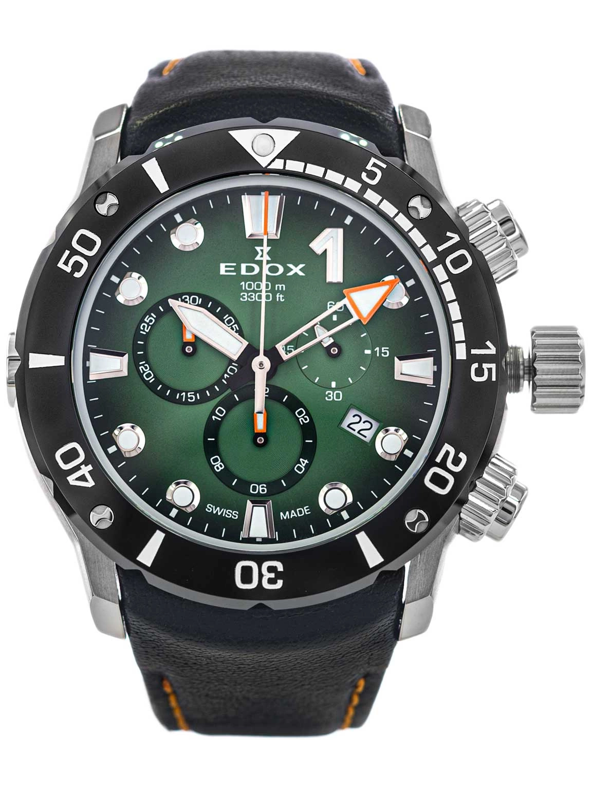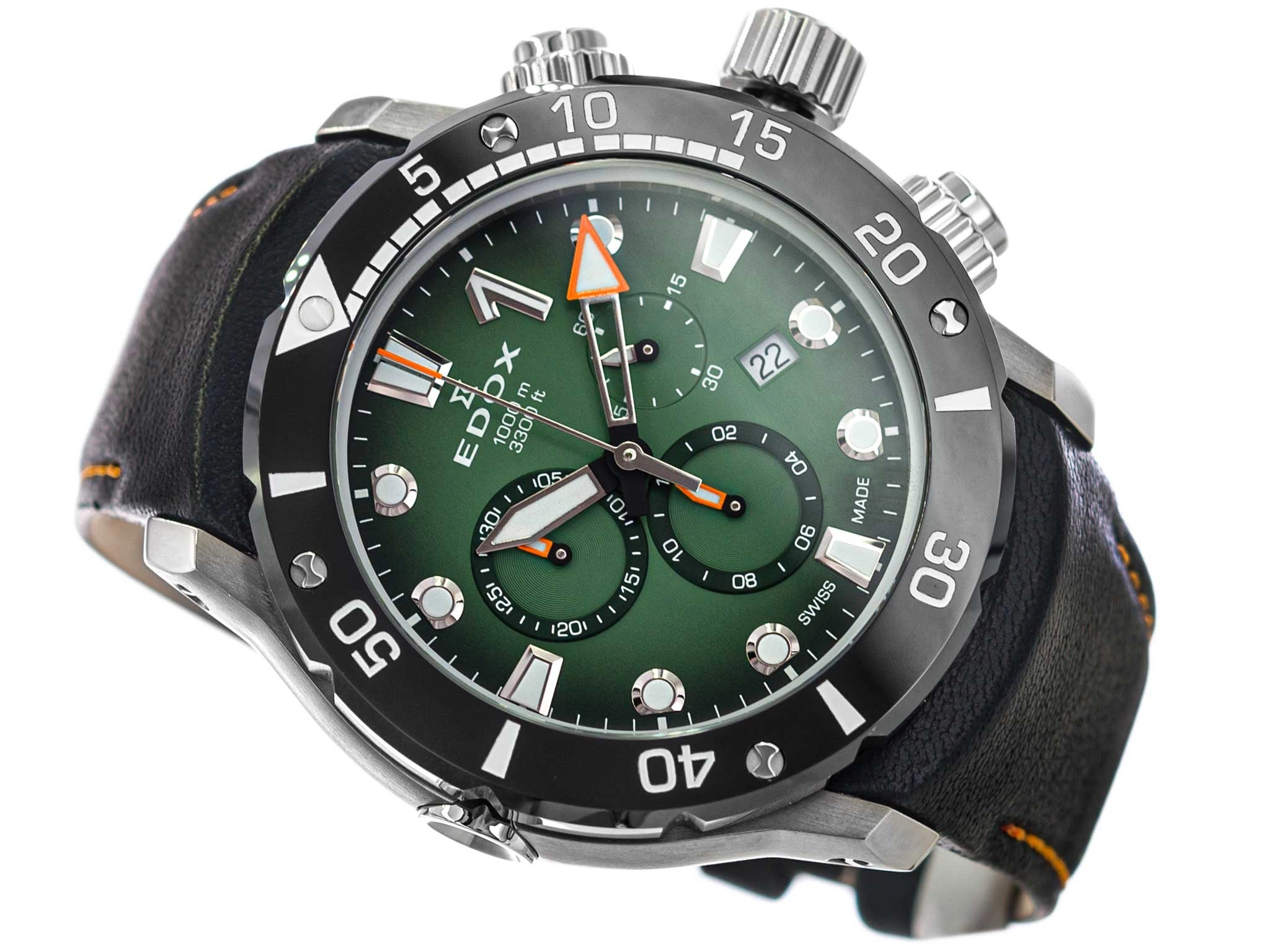 Zegarek wyposażono w zakręcaną koronkę oraz zakręcane przyciski obsługujące funkcję chronografu, co dodatkowo zabezpiecza wnętrze przed wodą, ciśnieniem i pyłem. Zastosowanie zaworu helowego to kolejny ukłon w stronę profesjonalistów – ten element pozwala wyrównać ciśnienie w zegarku podczas wynurzania się z dużych głębokości, chroniąc go przed uszkodzeniem. Centralnym elementem Edox 10242 TIN VIN CO-1 Chronograph jest wyjątkowo precyzyjny mechanizm kwarcowy, zasilany wymienną baterią. Zielona tarcza o głębokiej, satynowej strukturze tworzy idealne tło dla wyrazistych, luminescencyjnych wskazówek i indeksów, które dzięki technologii neobrite, po wcześniejszym naświetleniu zapewniają świetną widoczność nawet w słabym oświetleniu. Na godzinie czwartej umieszczono czytelny datownik, a subtarcze odpowiadają za pracę stopera analogowego oraz sekundnika, podnosząc funkcjonalność tego modelu.